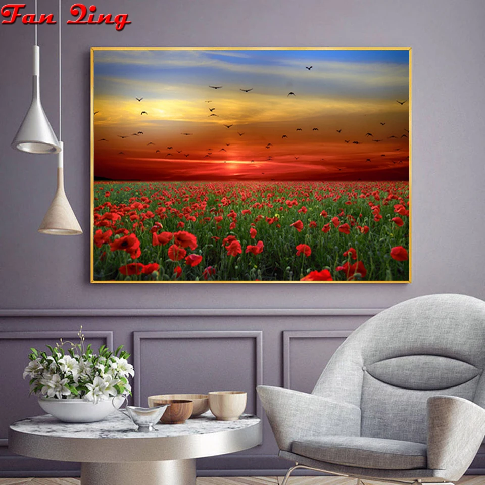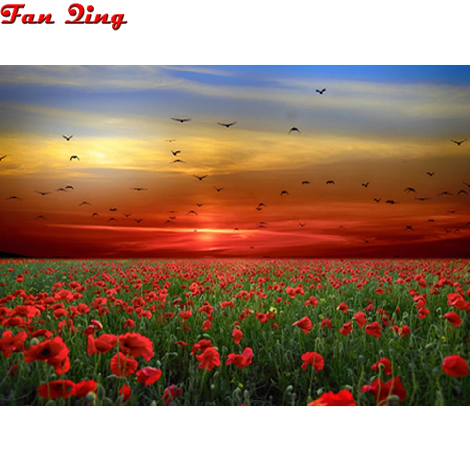 DIY Алмазная вышивка красный цветок поле закат Птицы Пейзаж крестиком 5D Бриллиантовая мозаика пейзаж алмазная живопись смола