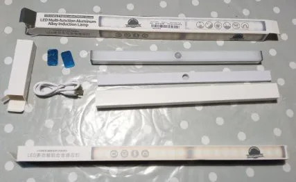 Продукт очень хорошо упакован, поставляется с 2 маленькими металлическими пластинами для прикрепления световой ленты и usb-кабелем. Датчик движения не слишком чувствителен, работает в самый раз. Свет также очень яркий, идеально подходит для внутреннего шкафа.