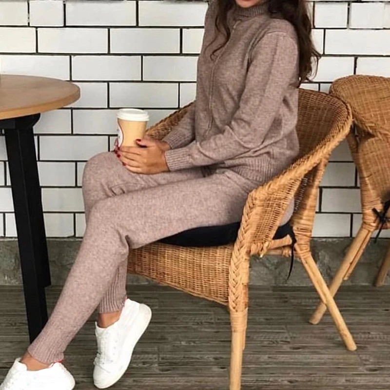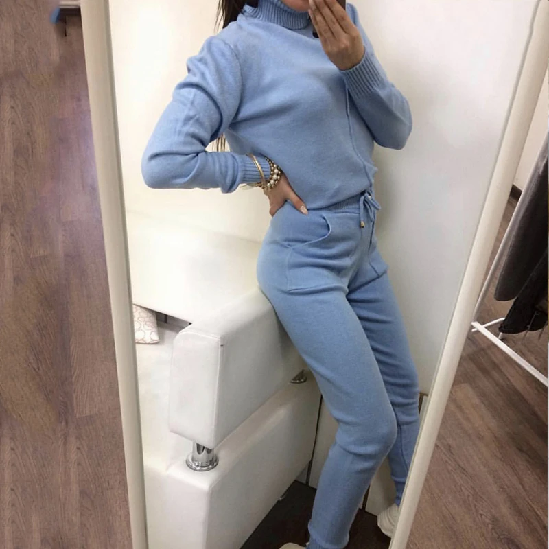Зимний женский вязаный джемпер и брюки, повседневный костюм, пуловер в рубчик с высоким воротником и карманами, комплект из двух предметов, спортивные костюмы для женщин