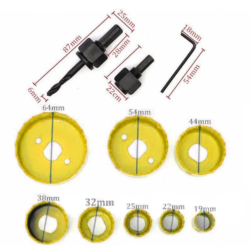 * 11 шт. в одном суперценном наборе, с 8 шт. кольцевых пил, 1 шт. шестигранного ключа и 2 шт. оправки (с одним пилотным сверлом)