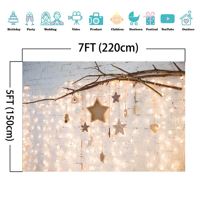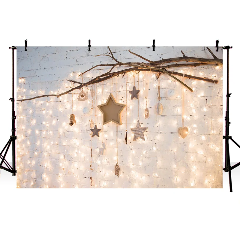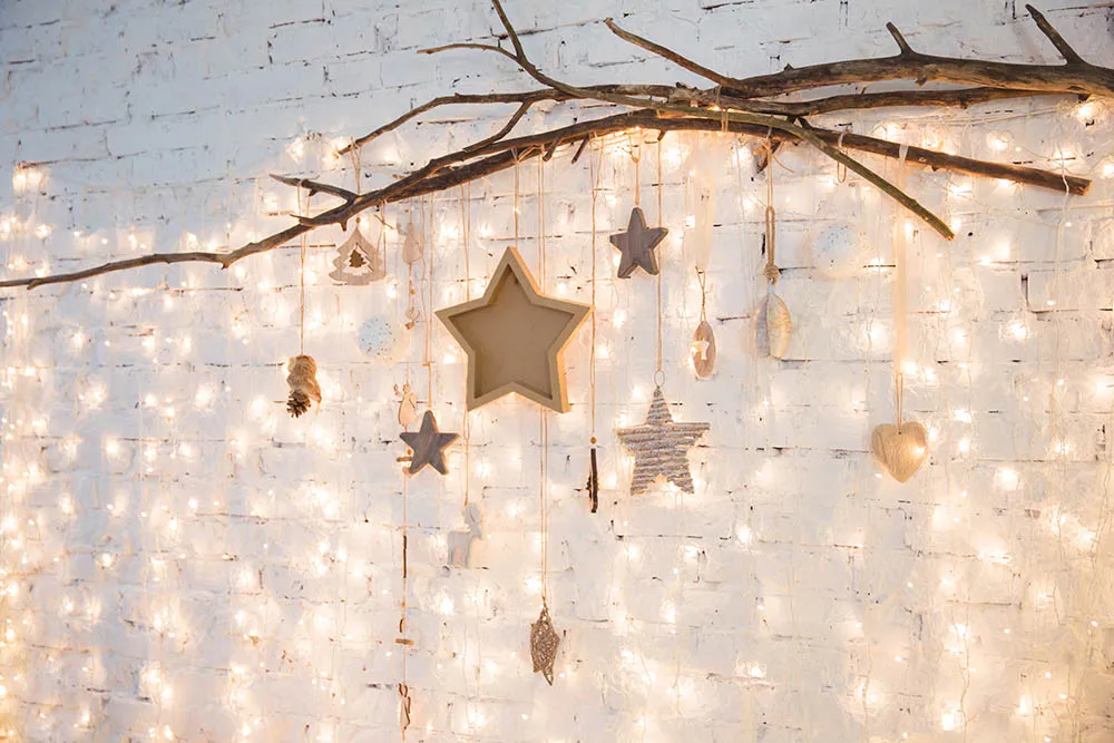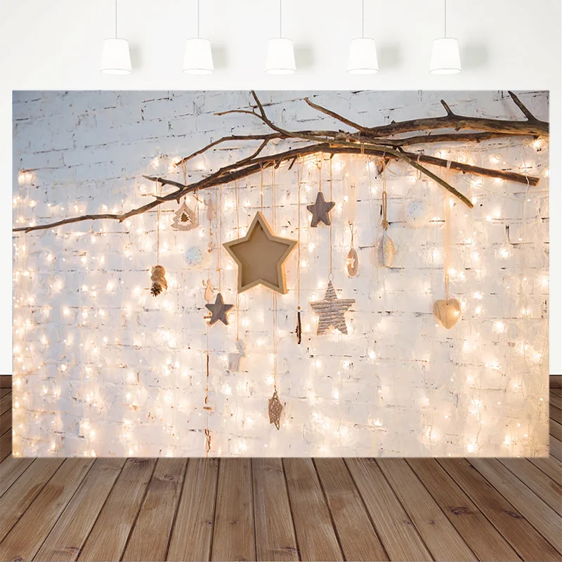Рождественская фотография фон звезды ветки белая кирпичная стена фон теплсветильник украшение Фотостудия