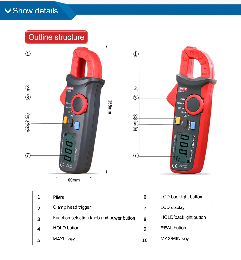 Особенности: 1. Количество дисплеев: 2000 2. Автоматический диапазон: √ 3. Емкость губки: 17 мм 4. Хранение данных: √ Подсветка ЖК-дисплея: √ 5. Автоматическое отключение: около 15 минут 6. Индикация низкого заряда батареи: ≤ 2,5 в 7. Защита входа: √