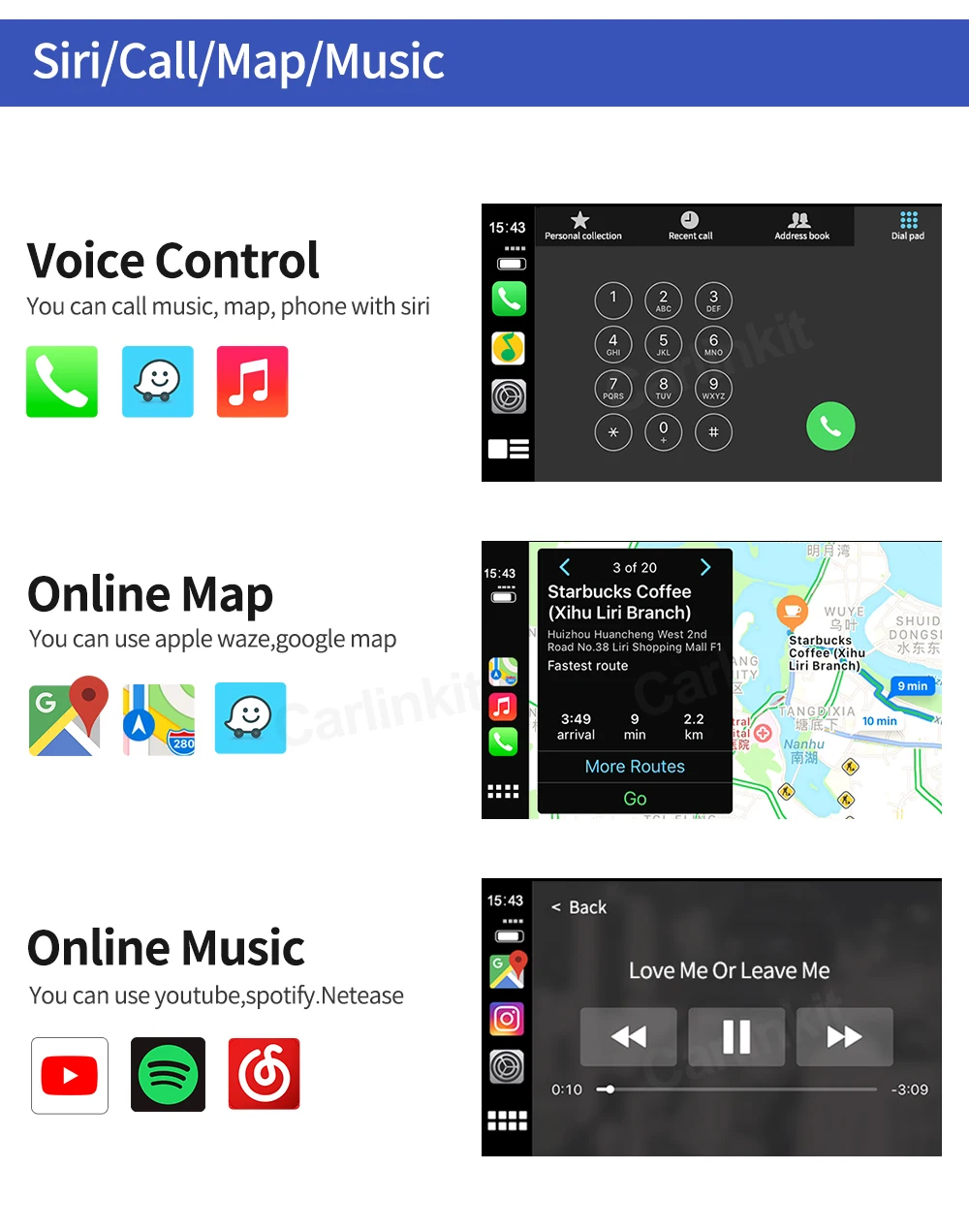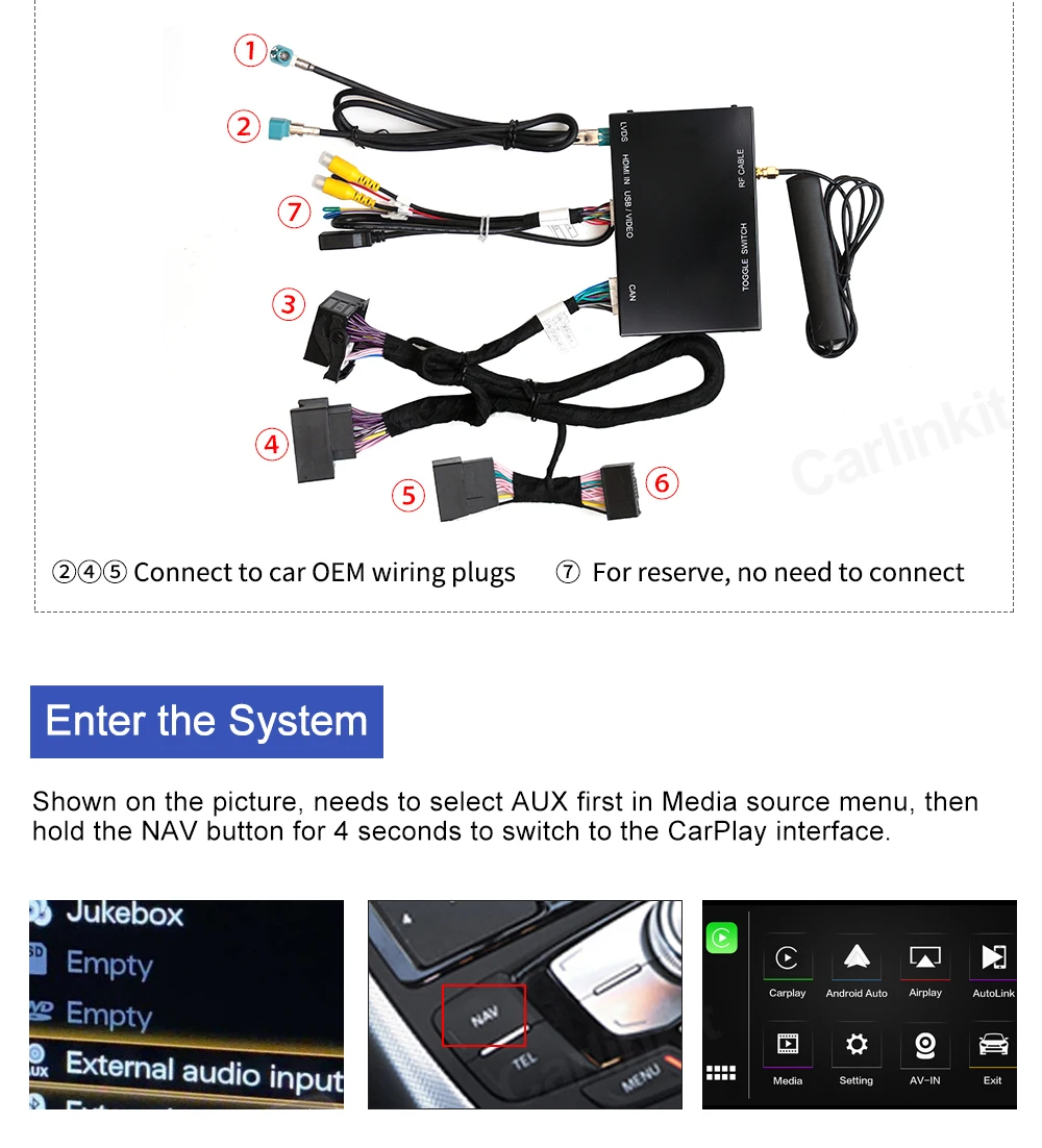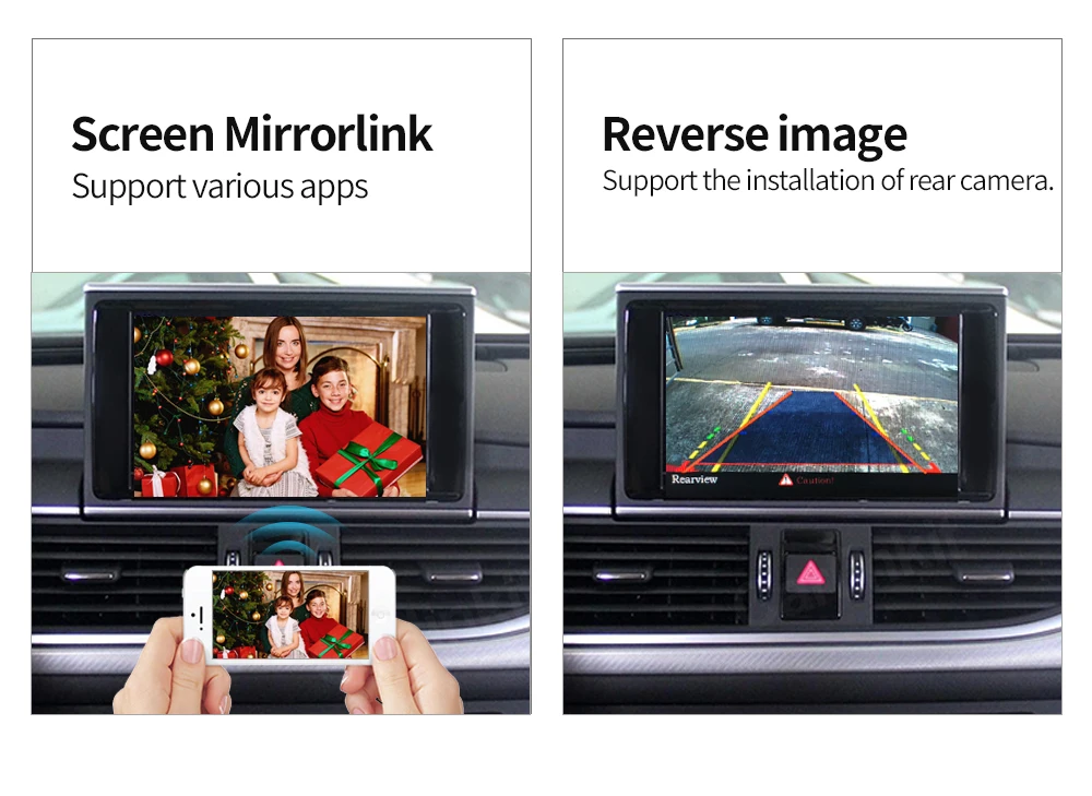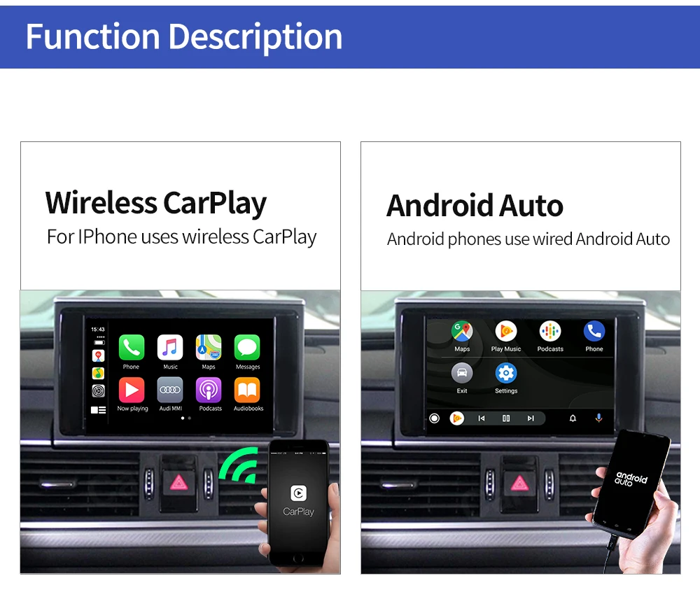 1. Работает с Apple CarPlay, сопряжение через Bluetooth, передача через WIFI.2. Работает с проводным CarPlay также, сначала выключите Wi-Fi, подключите через кабель освещения (проводное Удерживайте телефон одновременно)3.Android Mirroring-Link для телефонов Android (ссылка для скачивания)4.GPS навигационные приложения, Google Maps, Waze и Apple Maps доступны в режиме реального времени5. Музыка яблоки Spotify, Apple Music, Amazon и т. д. аудио через фабрику Audi media, текст на дисплее для некоторых приложений.6. Голосовое управление, говоря: "Эй, Сири...7.Aftermarket фронтальный/задний/360 вход камеры. (Поддерживаются динамические Направляющие линии)8.USB флэш-накопитель для воспроизведения музыки и видео с помощью подключения USB порта от CarPlay kit9. Регулировка эквалайзера. Лучшее качество звука. Выберите свой любимый стиль свободно (поп, рок, мягкий, стандартный ..)10. Полное управление кнопками OEM.