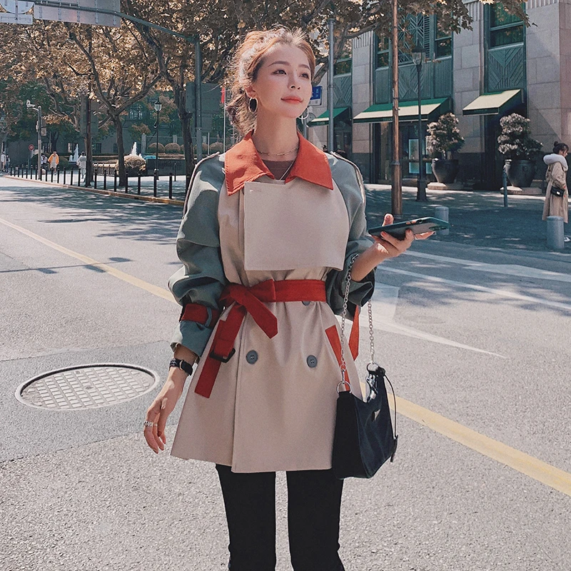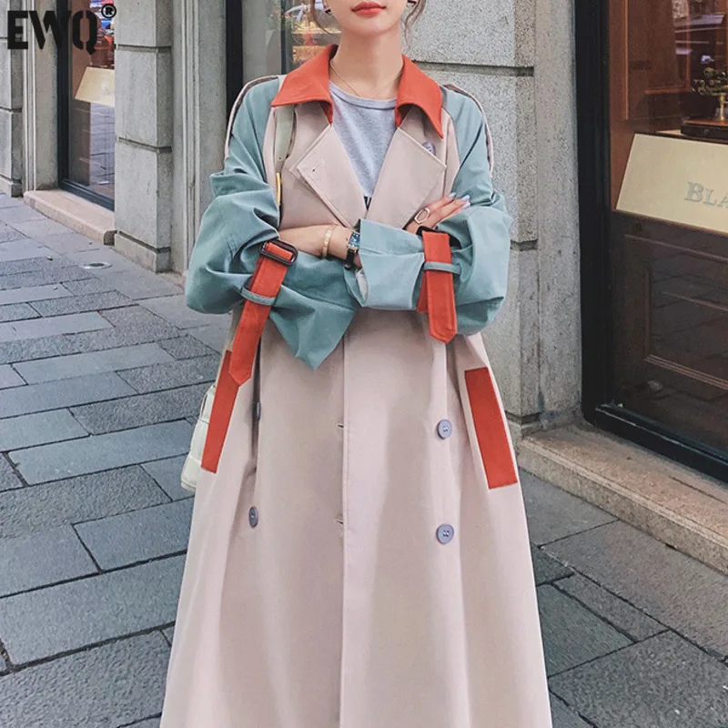 Женская двубортная ветровка EWQ, черная короткая ветровка контрастных цветов с отложным воротником и длинным рукавом, Высококачественная верхняя одежда, весна 2022