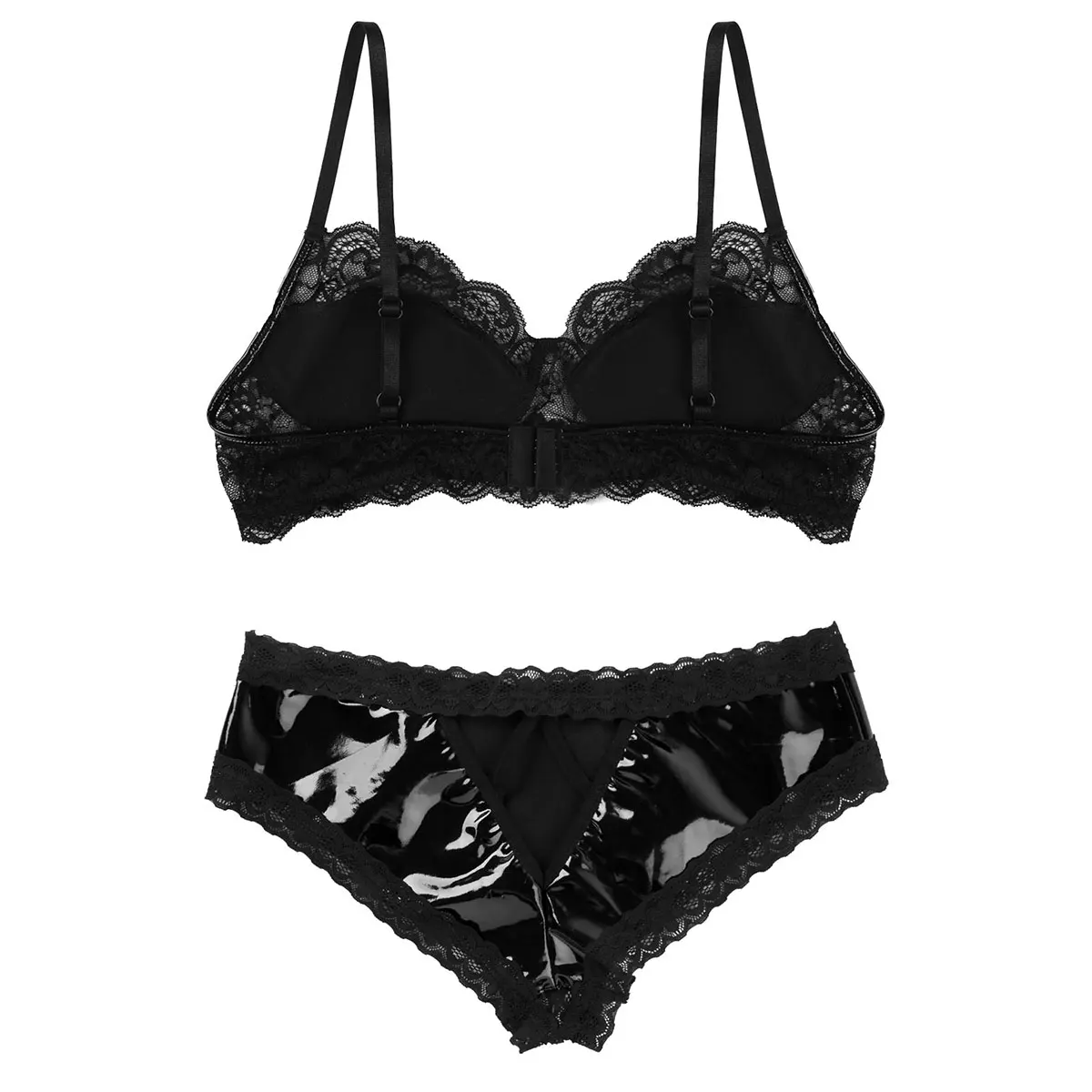 Комплект женского кружевного нижнего белья из мягкой лакированной кожи без косточек, бюстгальтер без подкладки с открытой промежностью, V-образный вырез, мини-трусы, комплект нижнего белья