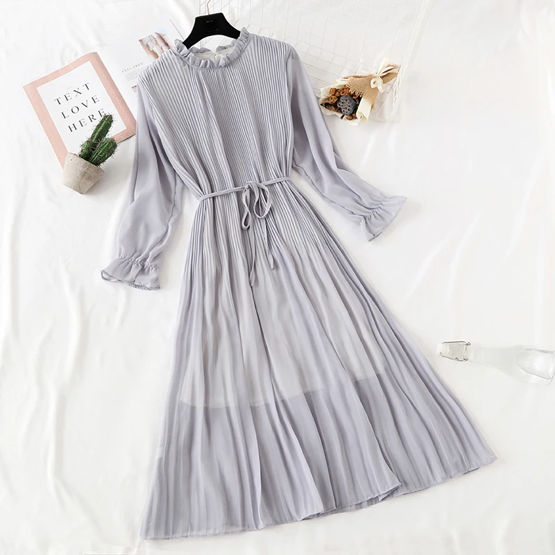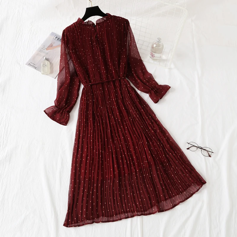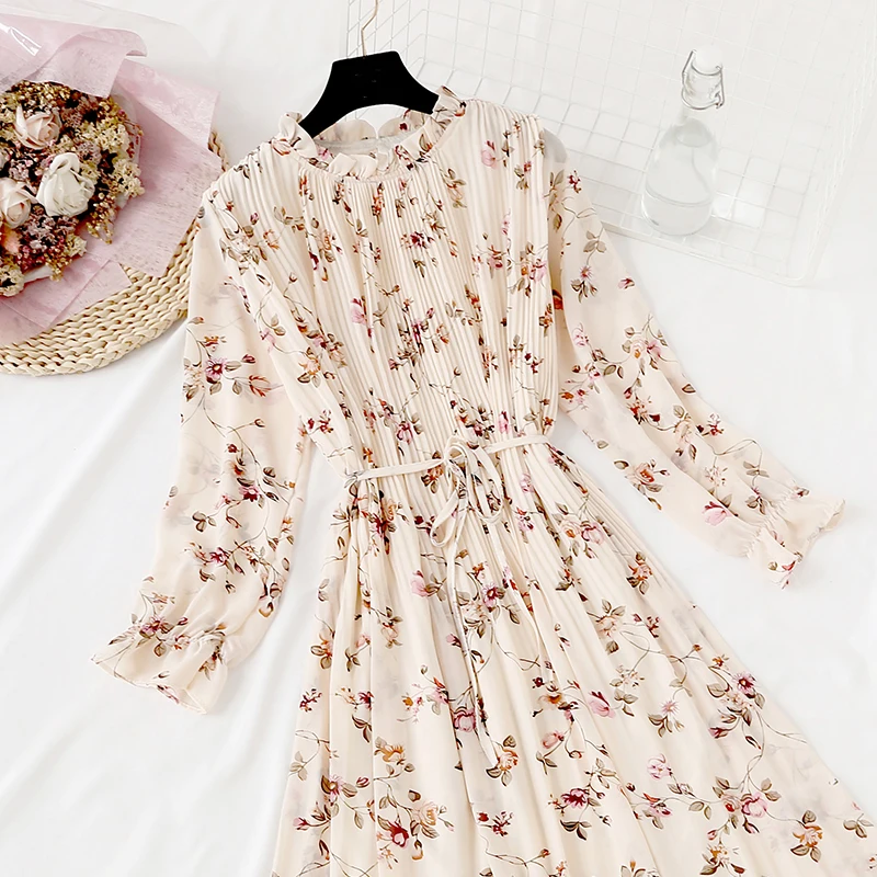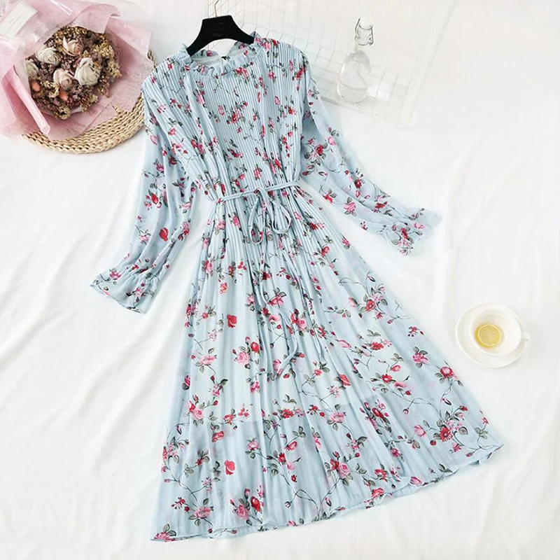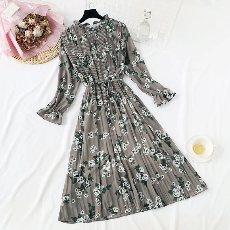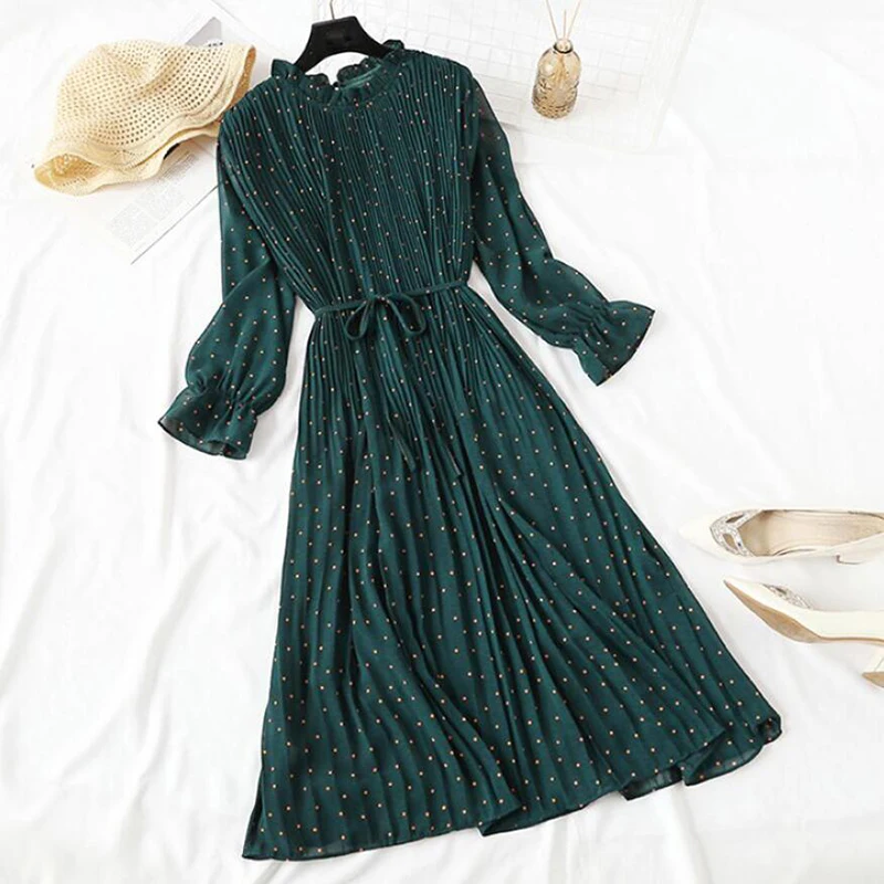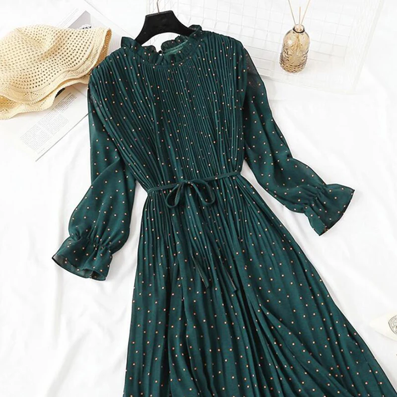 Женское длинное шифоновое платье в горошек, повседневное Плиссированное винтажное платье с длинным рукавом и цветочным принтом, большие размеры, весна-осень 2020