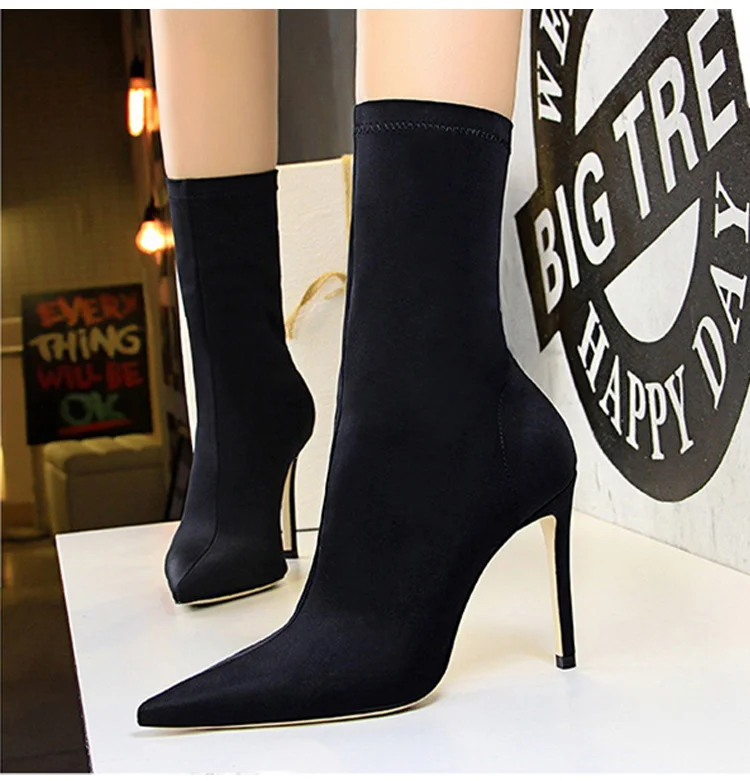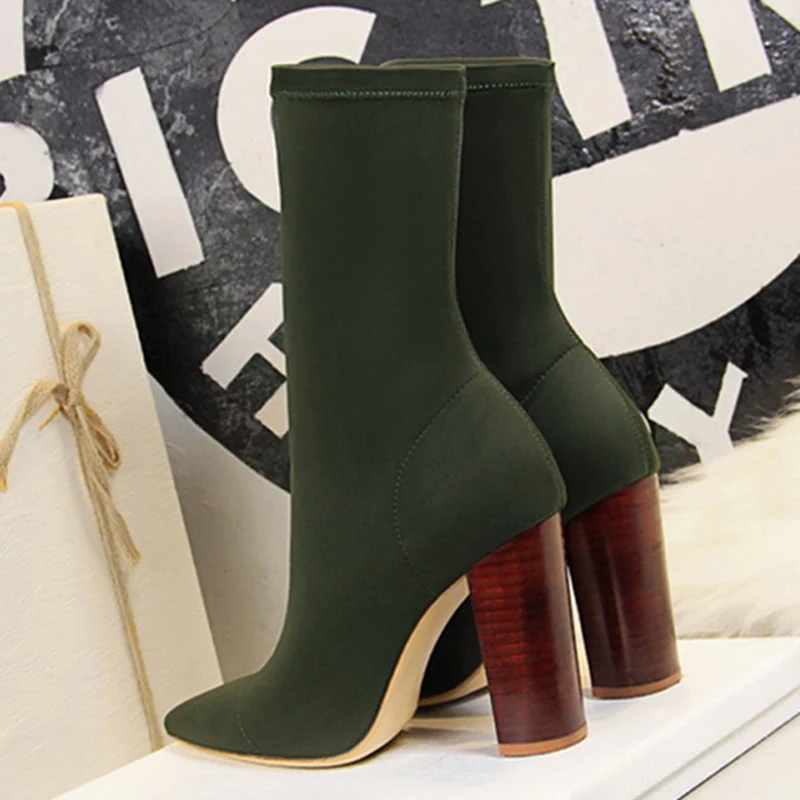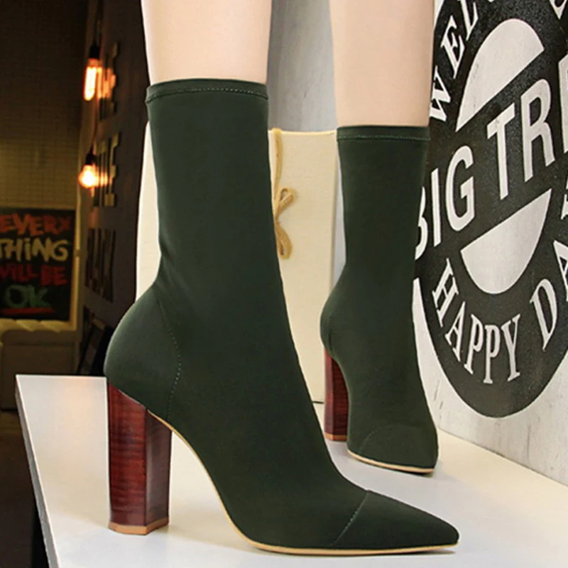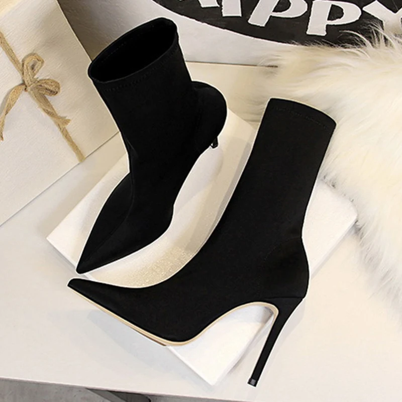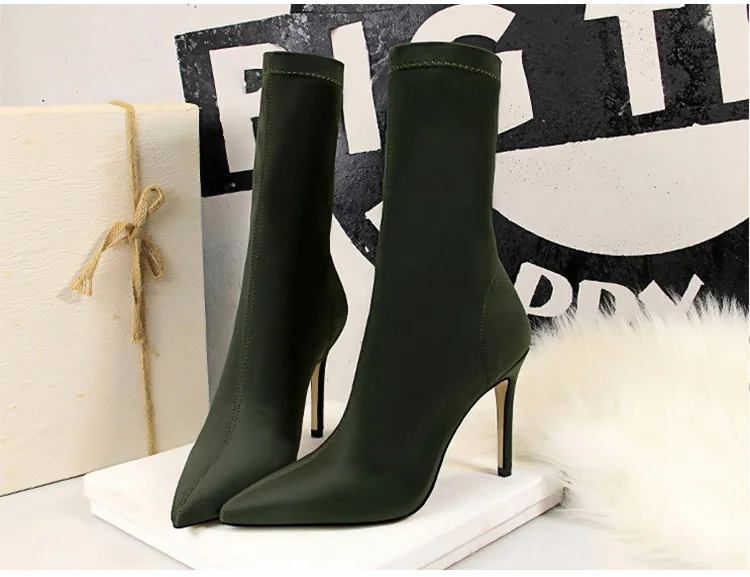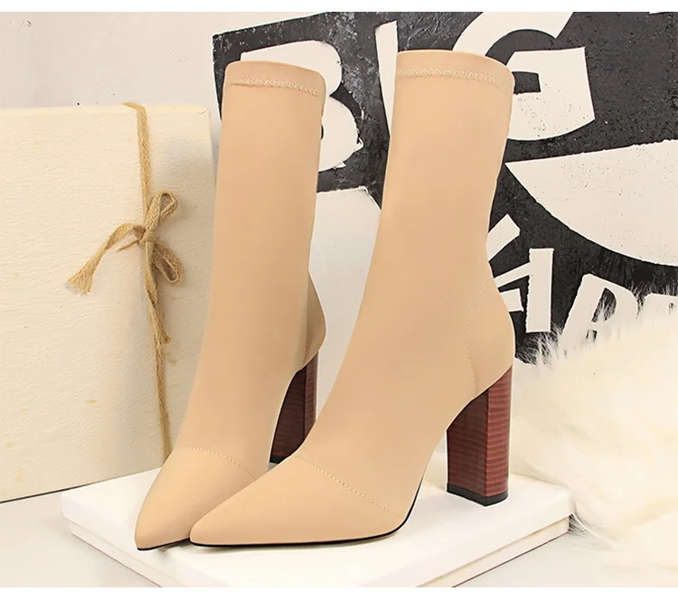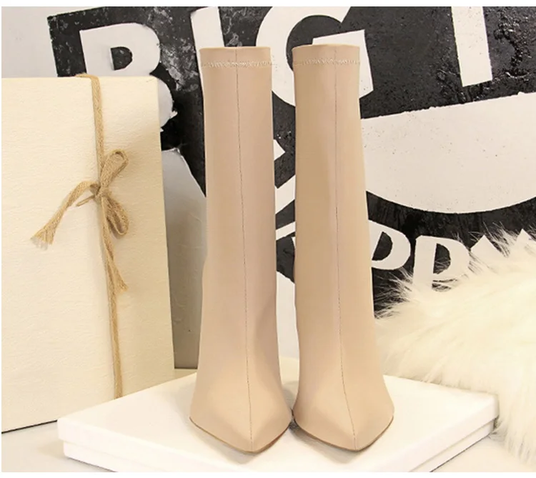 Женские ботинки до середины икры, с острым носком, из эластичной ткани, на тонком каблуке, Осень-зима