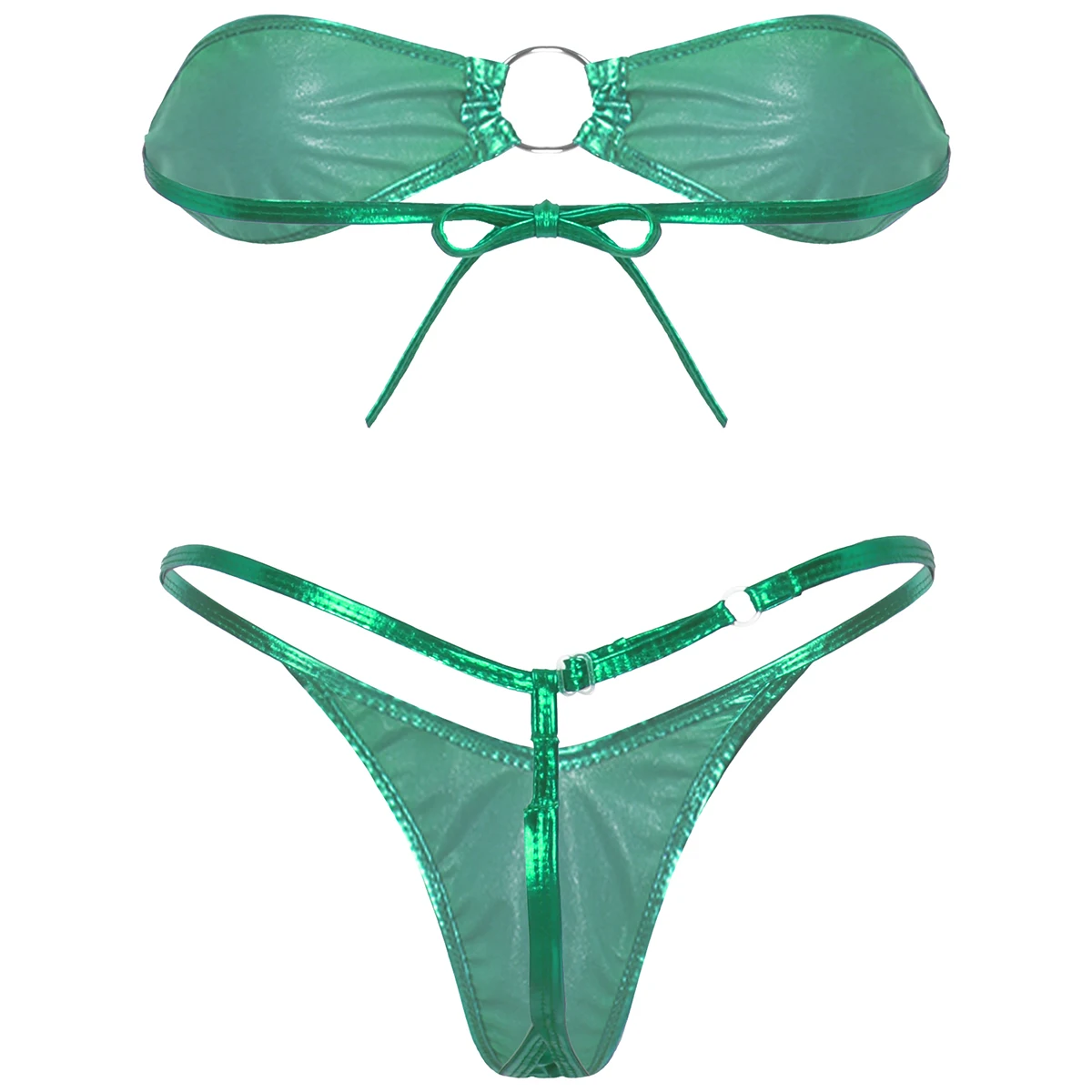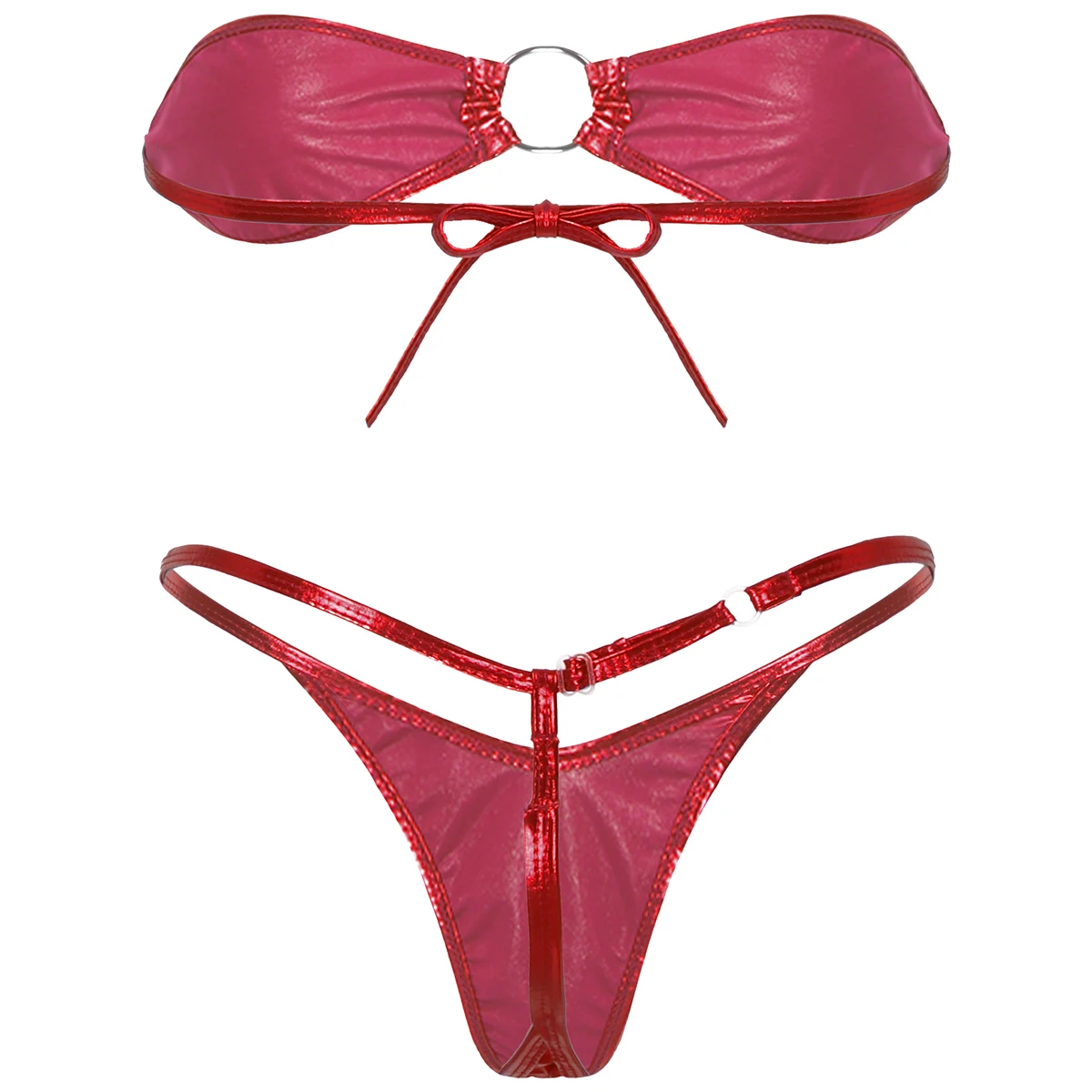 Особенности: Women's exotic micro mini Набор белья бикини, романтичный и соблазнительный, один размер подходит большинству. Изготовлен из высококачественной и эластичной ткани, мягкий, удобный и дышащий в носке, глянцевый внешний вид. Минимальный охват, топ-бра без бретелек с завязкой сзади и металлическим уплотнительным кольцом по центру, можно регулировать под ваш размер. Подходящие трусики-стринги с регулируемой талией идеально подчеркнут ваш красивый изгиб тела, сделают вас горячей и манящей. Идеально подходит для ношения на пляже или дома для интимной деятельности, для тематической вечеринки и т. д.