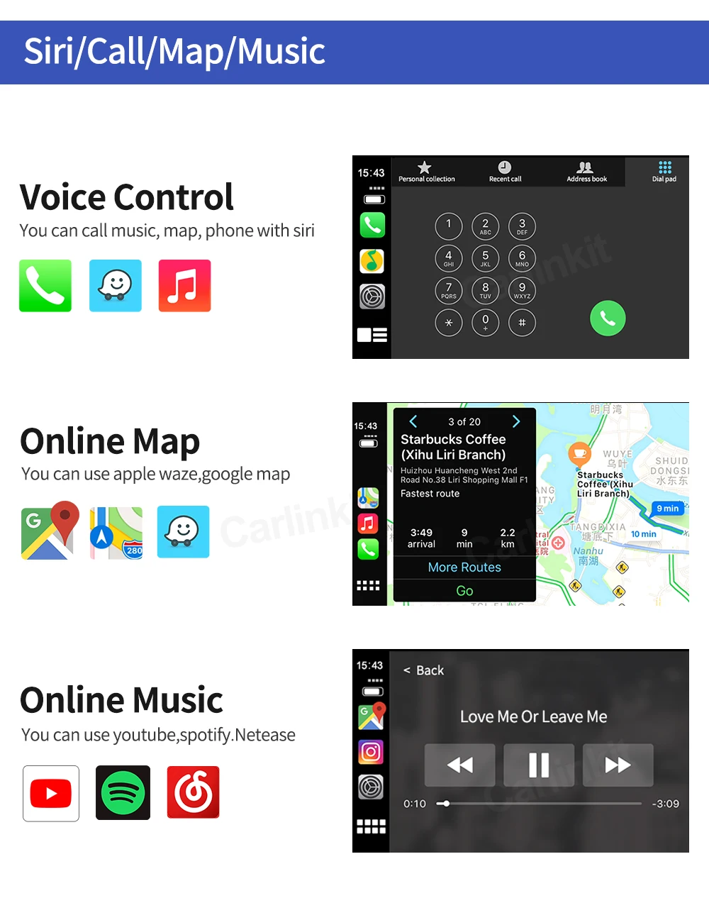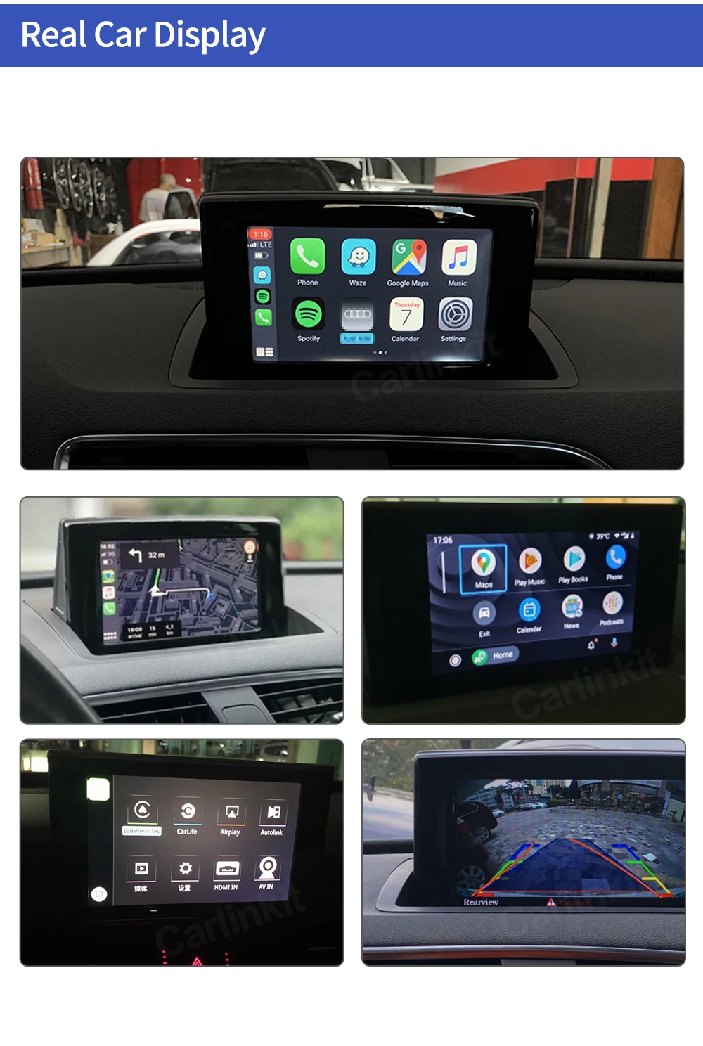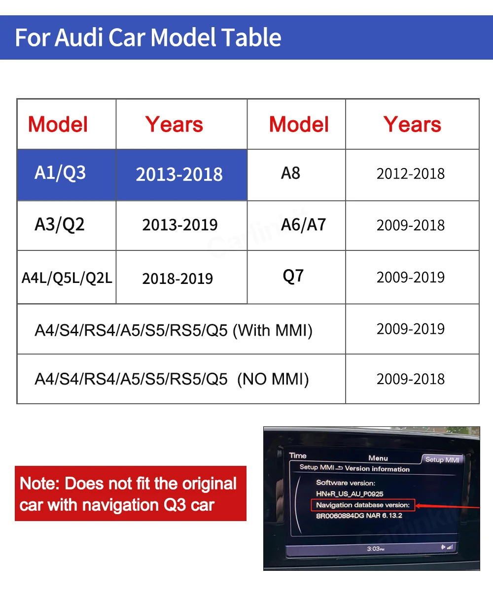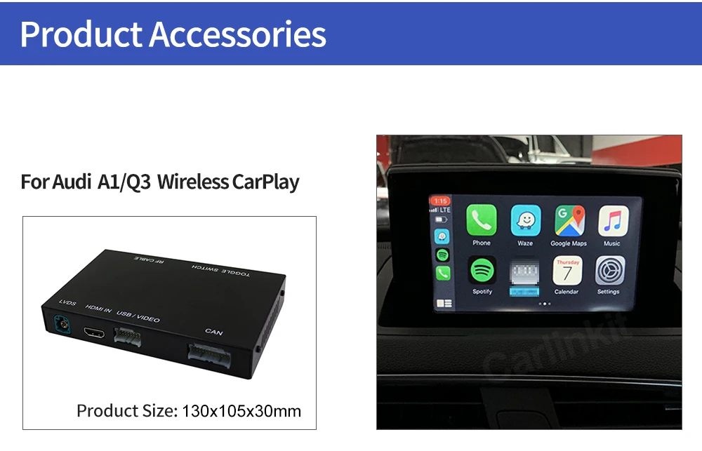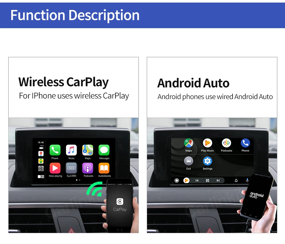 1. Работает с Apple CarPlay, сопряжение через Bluetooth, передача через WIFI.2. Работает с проводным CarPlay также, сначала выключите Wi-Fi, подключите через кабель освещения (проводное Удерживайте телефон одновременно)3.Android Mirroring-Link для телефонов Android (ссылка для скачивания)4.GPS навигационные приложения, Google Maps, Waze и Apple Maps доступны в режиме реального времени5. Музыка яблоки Spotify, Apple Music, Amazon и т. д. аудио через фабрику Audi media, текст на дисплее для некоторых приложений.6. Голосовое управление, говоря: "Эй, Сири...7.Aftermarket фронтальный/задний/360 вход камеры. (Поддерживаются динамические Направляющие линии)8.USB флэш-накопитель для воспроизведения музыки и видео с помощью подключения USB порта от CarPlay kit9. Регулировка эквалайзера. Лучшее качество звука. Выберите свой любимый стиль свободно (поп, рок, мягкий, стандартный ..)10. Полное управление кнопками OEM.