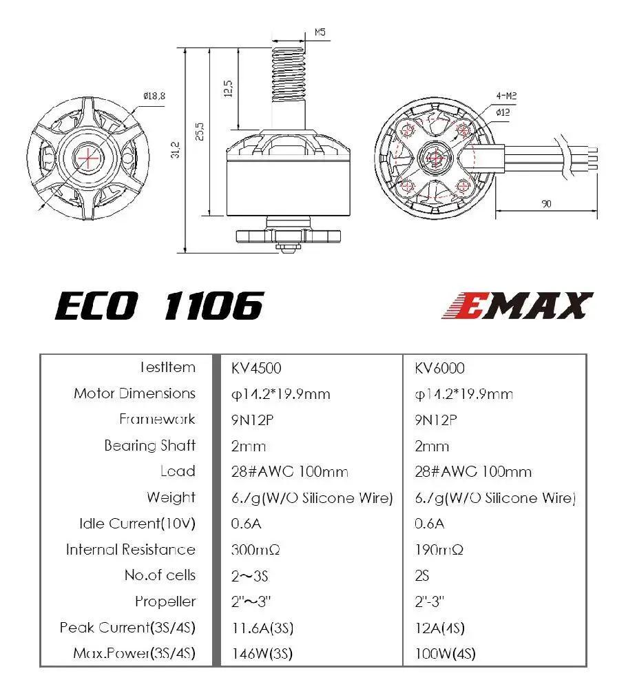 Характеристики: Бренд: EMAX Наименование товара: ECO 1106 2 ~ 3S 4500KV/ 6000KV CW бесщеточный двигатель КВ: 4500кв/6000кв (опционально) Рамки: 9N12P Длина: 19,9 мм Диаметр: 14,2 мм Пропеллер: 2 " - 3" Вес: 6,7g (W/O силиконовый провод) Фон-реквизит вал переходника диаметр: 1,5 мм Подшипник вала: 2 мм Резьба вала: CW Холостой ток, внутреннее сопротивление, рекомендуемый Lipo, рекомендуемый пропеллер, ток, Макс. Мощность 4500кв, 0.6A (10 в), 300mΩ, 2 ~ 3S, 2 ~ 3 дюйма, 11.A (3S), 146 Вт (3S) 6000кв, 0.6A (7 в), 190mΩ, 2S, 2 ~ 3 дюйма, 12A (4S), 100 Вт (4S)