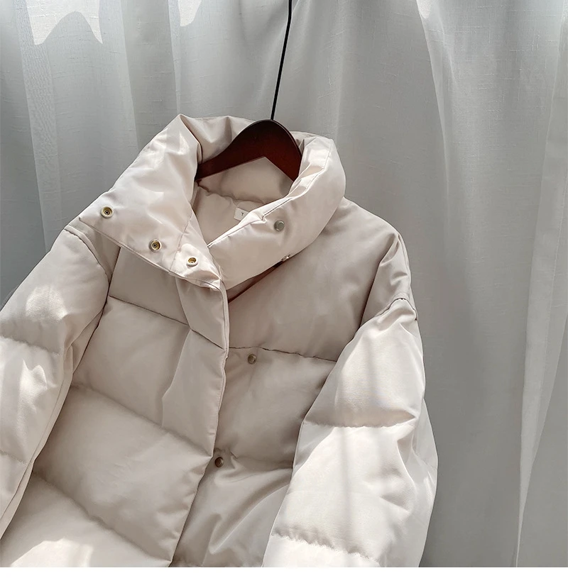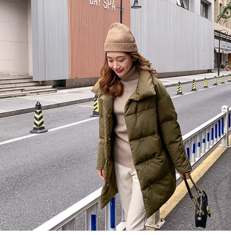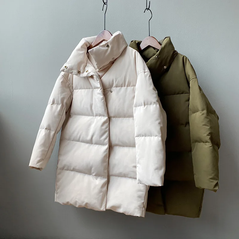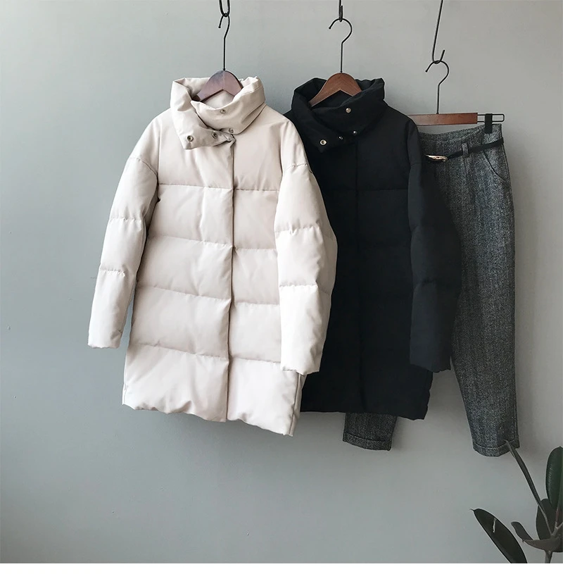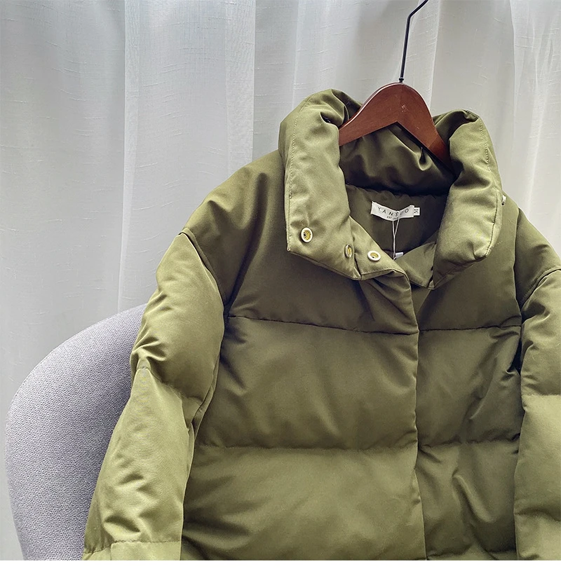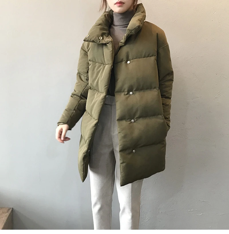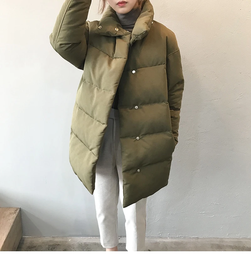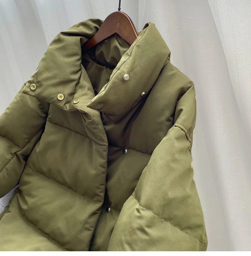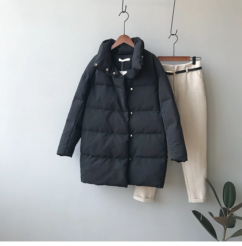 Пуховик женский зимний, однотонный, средней длины, с закрытыми пуговицами и воротником-стойкой