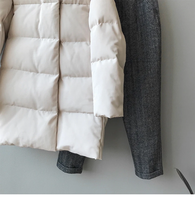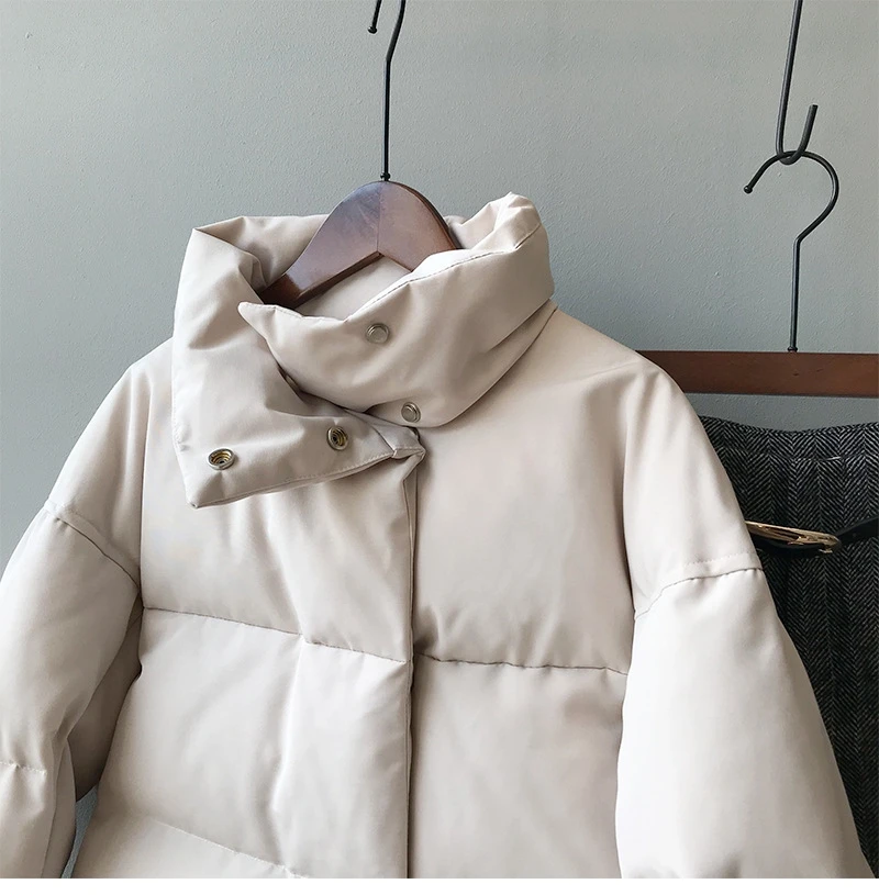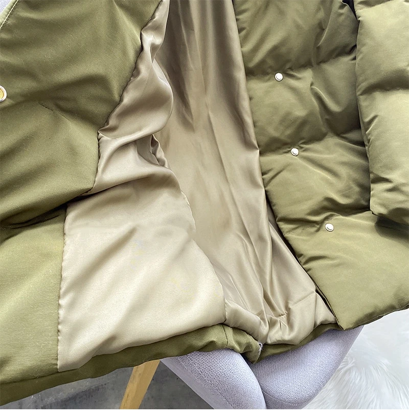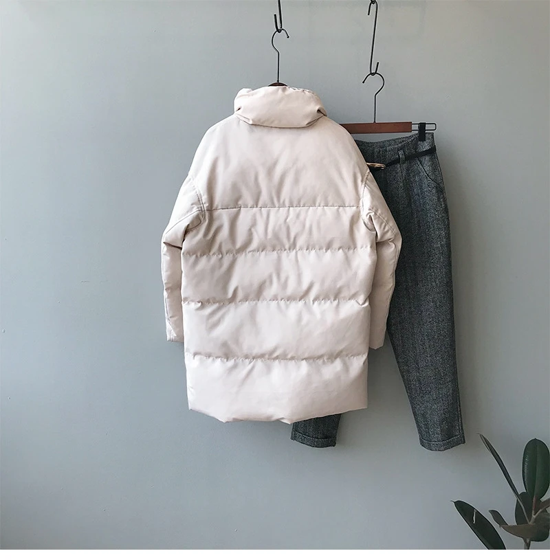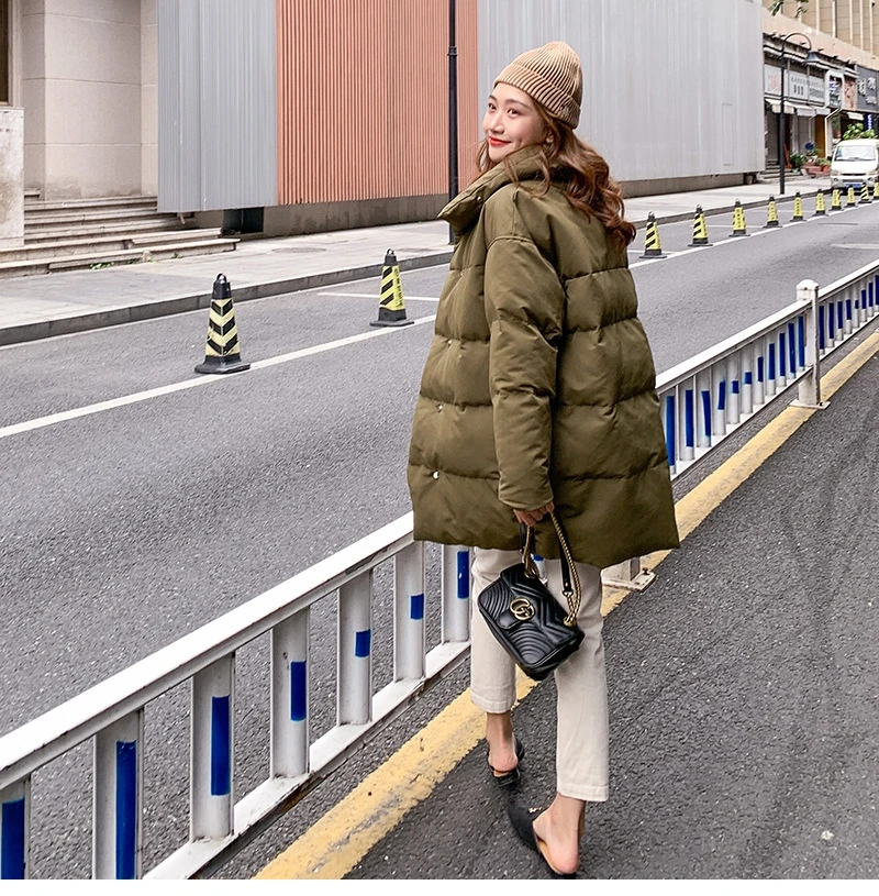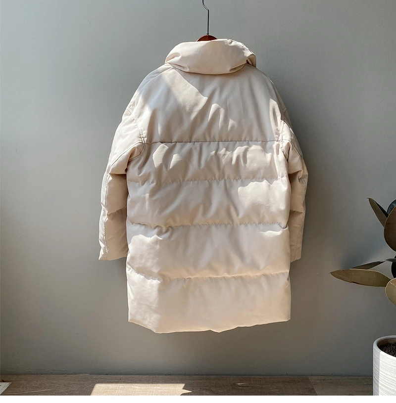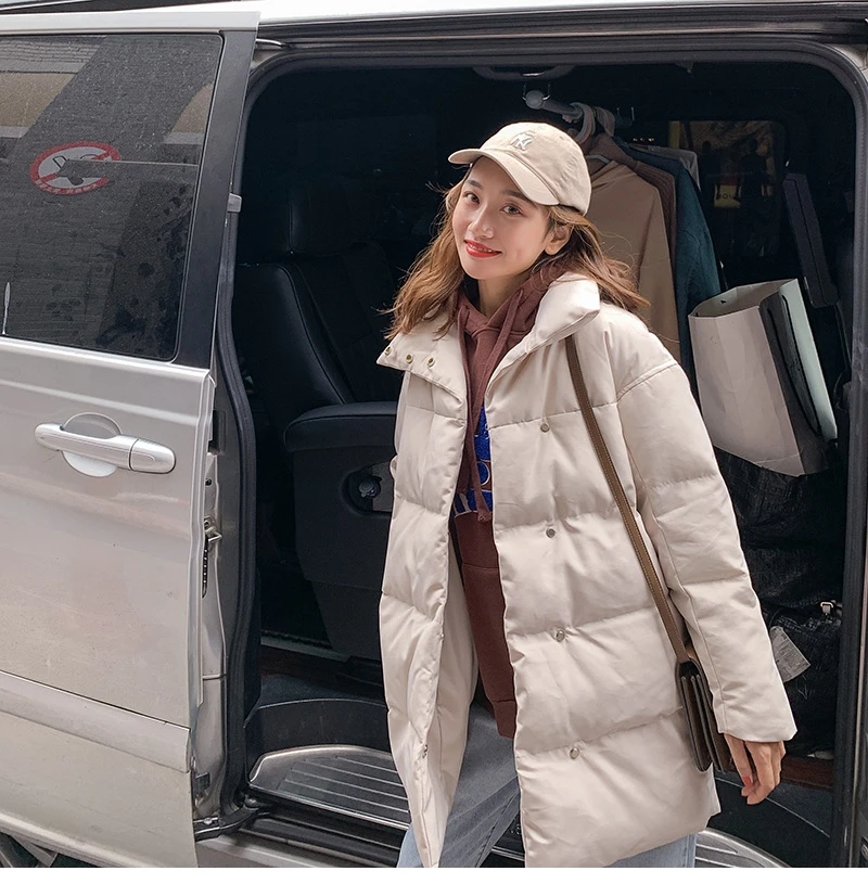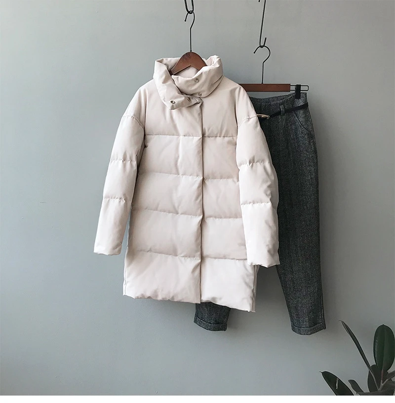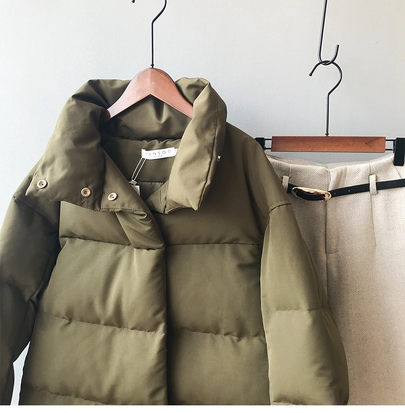 Пуховик женский зимний, однотонный, средней длины, с закрытыми пуговицами и воротником-стойкой