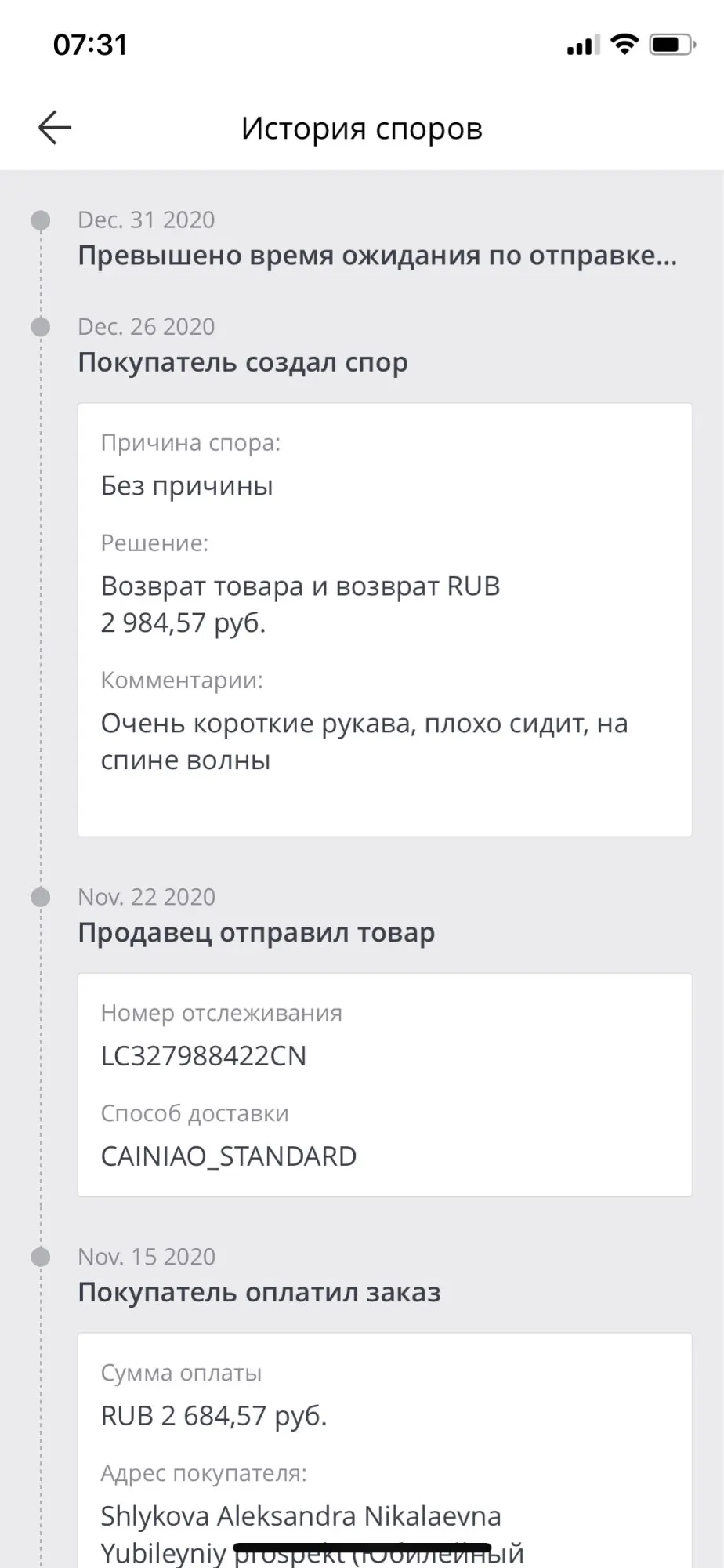 Отвратительно!!! Ждала заказ 1,5 месяца! А результате, получила 26.12 декабря. Рукава короткие, на спине «пузырь», в этот же день открыла спор. В результате спор был открыт 26.12, и почему-то 31.12 уже закрыт. Но при этом, не было предоставлено трек-Номера! В общем я крайне недовольна. Что делать теперь с «этим» товаром, понятия не имею