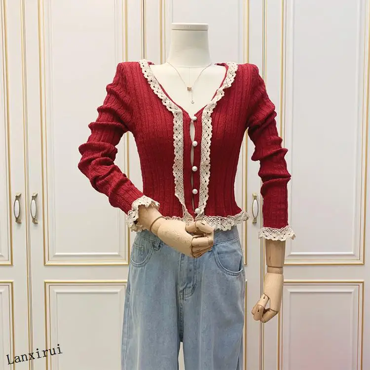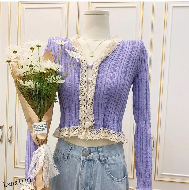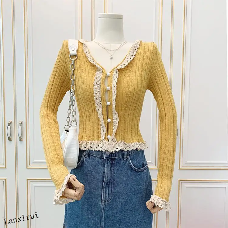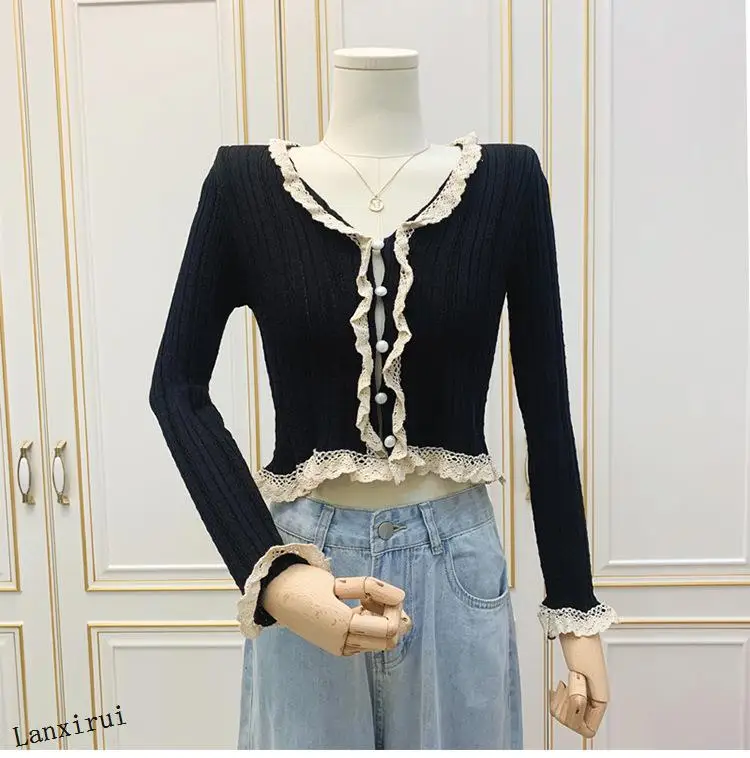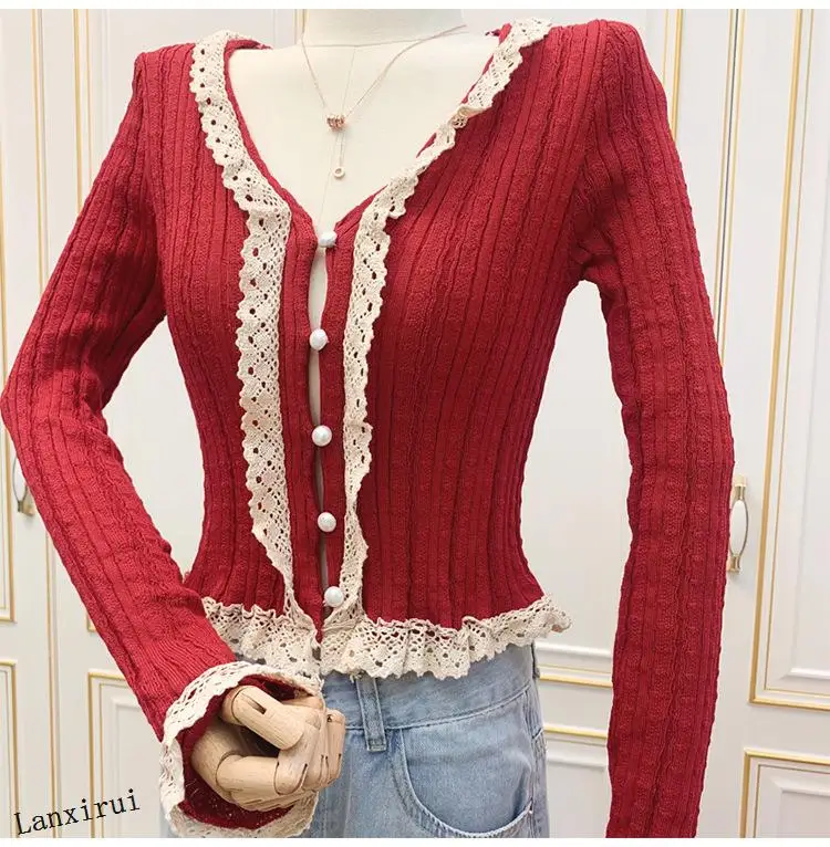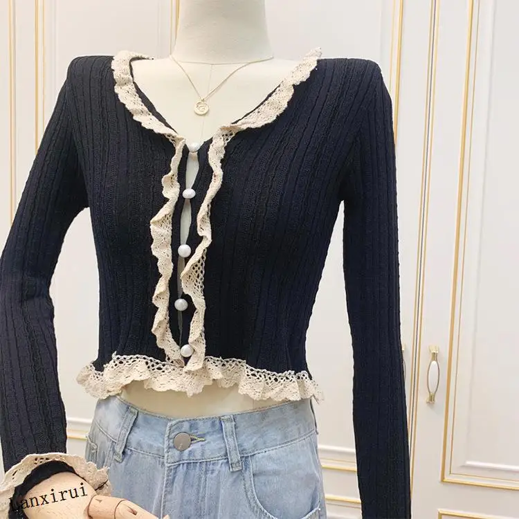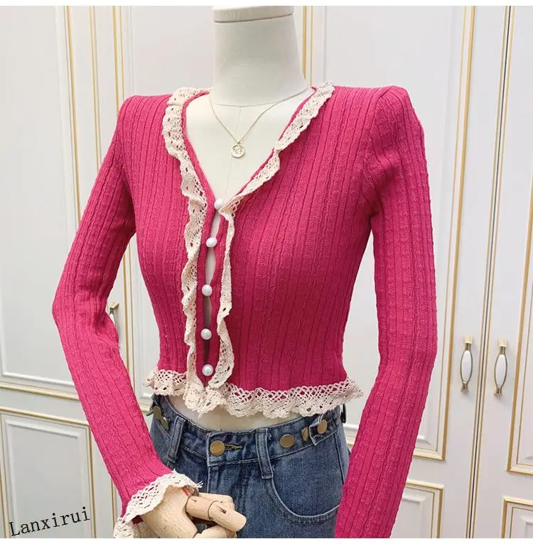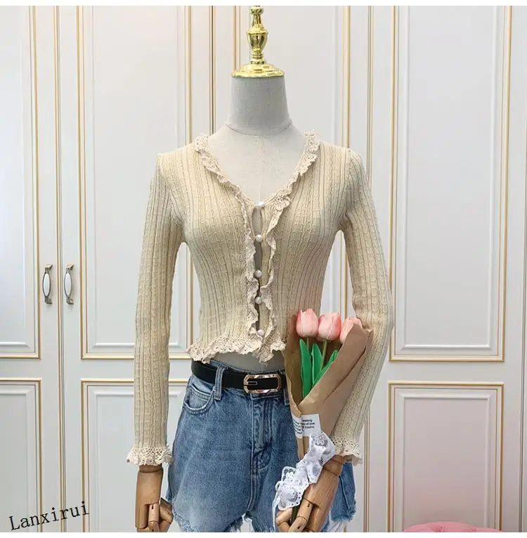 Женский трикотажный кардиган с оборками и V-образным вырезом