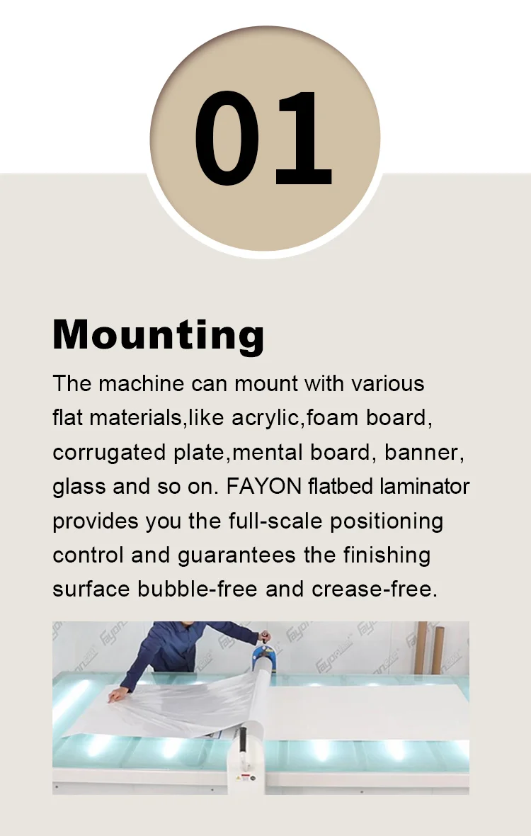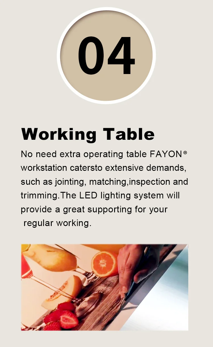 FAYON планшетный ламинатор является профессиональным оборудованием в печати и пост-обработки, удовлетворяет ваши различные потребности, широко используется в рекламе, выставочных органайзеров, производстве картин, студии и многих других областях, U TRAFAST и эффективная работа на рабочей станции FAYON могут сэкономить много времени на монтаже, ламинировании и маскировке. FAYON workstation может завершить все работы в третий раз, что приведет к идеальному эффекту!