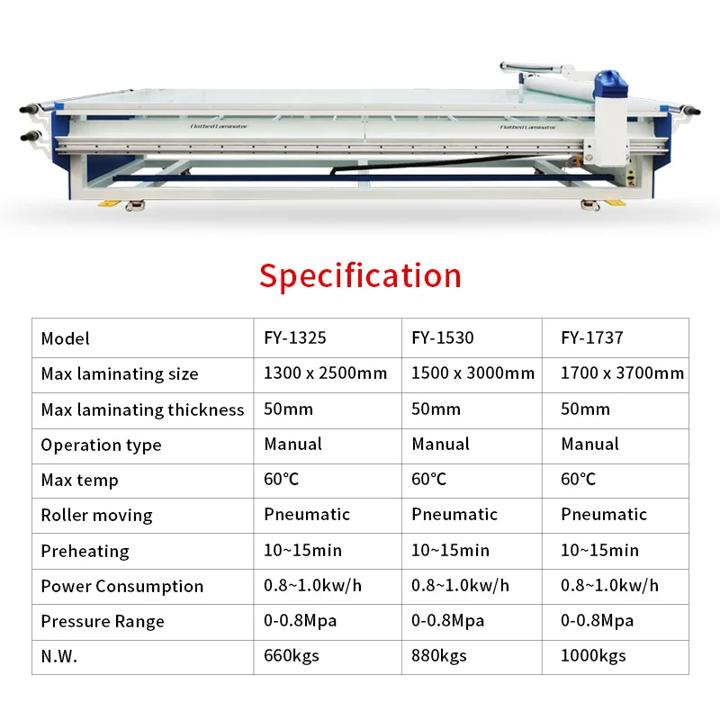 Модель FY-1325 FY-1530 FY-1737 Максимальный размер ламинирования 1300*2500 мм 1500*3000 мм 1700*3700 мм Максимальная толщина ламинирования 50 мм 50 мм 50 мм Тип операции Руководство по эксплуатации Руководство по эксплуатации Руководство по эксплуатации Максимальная температура 60 ℃ 60 ℃ 60 ℃ Подвижный ролик Пневматический Пневматический Пневматический Подогрев 10-15 мин 10-15 мин 10-15 мин Энергопотребление 0,8-1.0 кВт/ч 0,8-1.0 кВт/ч 0,8-1.0 кВт/ч Диапазон давления 0-0.8mpa 0-0.8mpa 0-0.8mpa N.W 660кг 880 кг 1000 кг