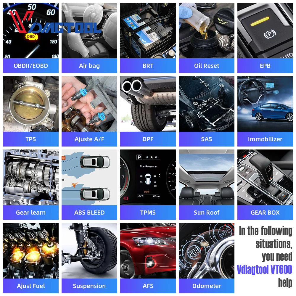 В VDIAGTOOL VT600 автомобильный диагностический инструмент может быть Поддержка 19 видов специальных функций.