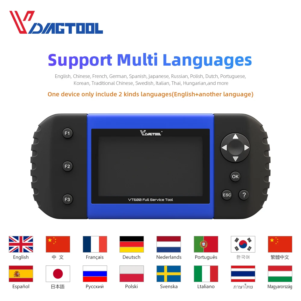 В VDIAGTOOL VT600 автомобильный диагностический инструмент может быть Поддержка 16 видов Langauges, вы можете выбрать английский + другая Язык в одном VT600 OBD2 сканер