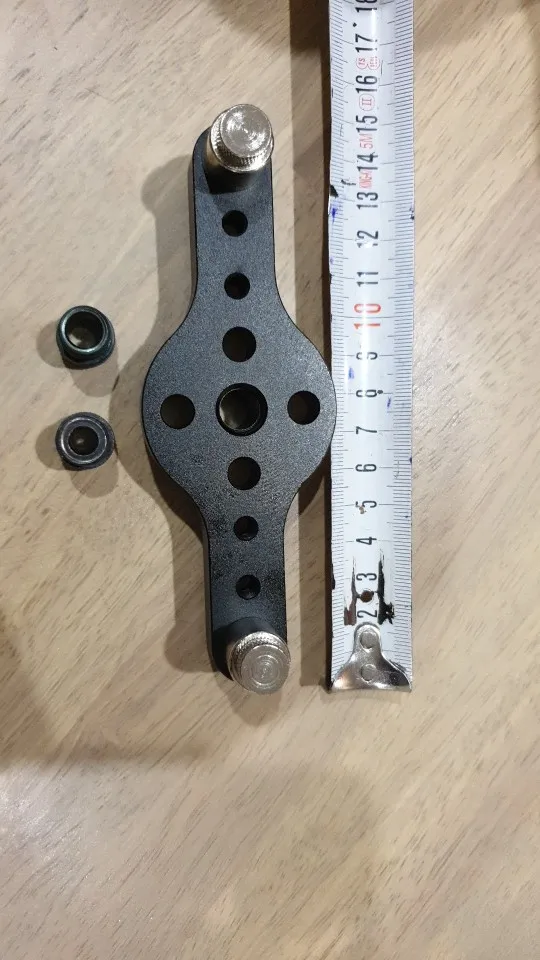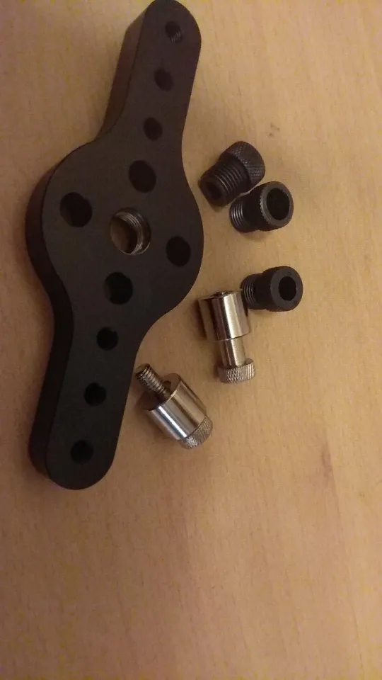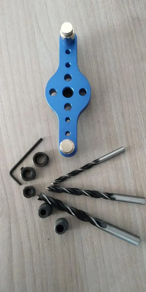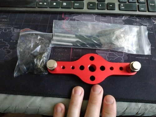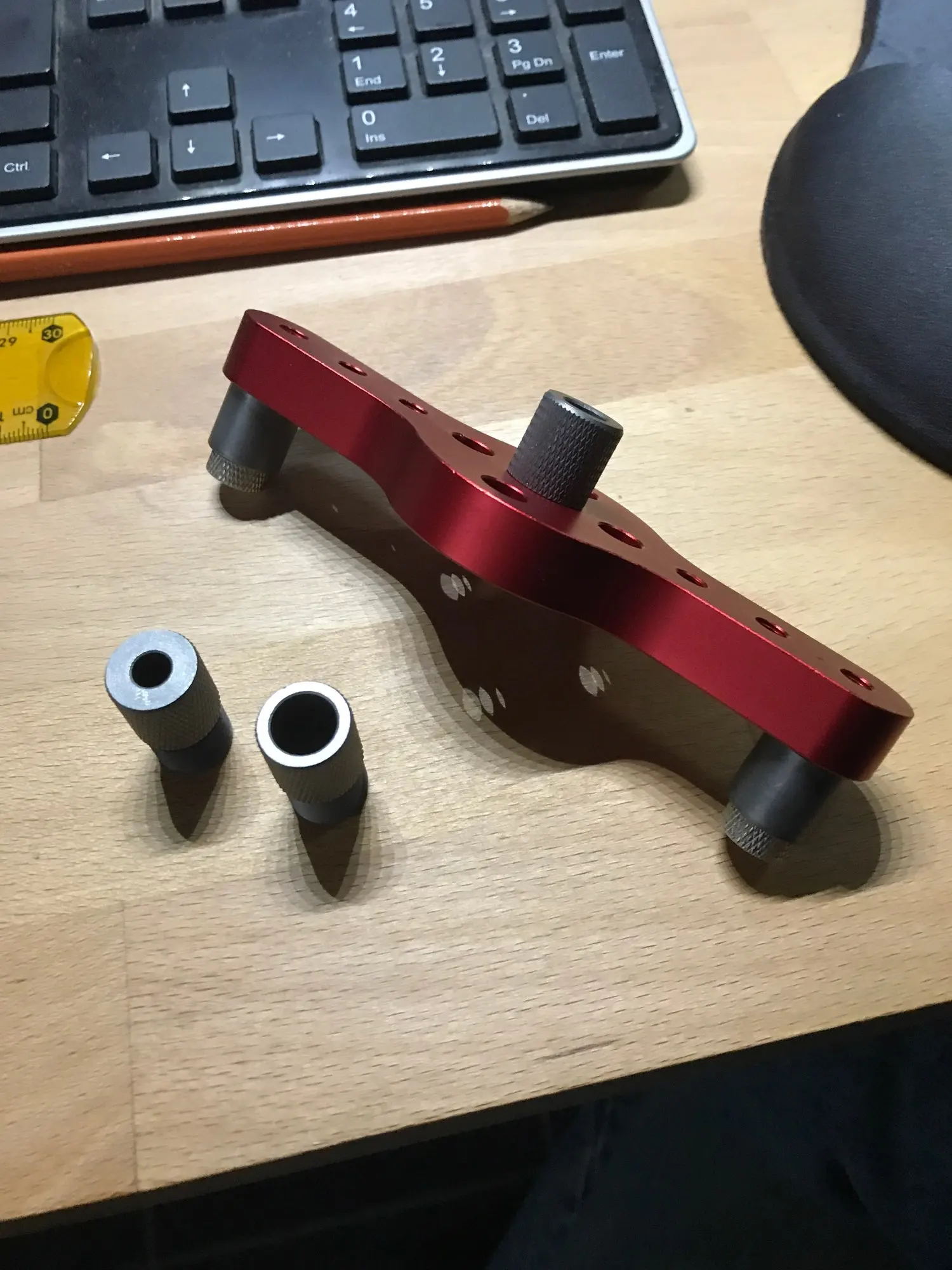 Брал для сверления толкателей(пуш) в 16мм лдсп. Но как всегда у китайцев задумка отличная, но постоянно что-то не додуманно. Могли бы сделать резьбу, под ещё две втулки в соседних с центром отверстиях, чтоб эти втулки было как хранить. А то пользуешься одной, а остальные валяются. Буду засверливать сам и проходить метчиком (металл вроде сплав какой-то с аллюминием). Да и ещё, для мебельщиков - если один ограничитель вкрутить в крайнее отверстие, а второй ближе к центру, то приложив кондуктор к двум 16мм дсп получим центр одного из этих дсп (это что-б засверливать отверстия если вместе две боковины стянуты.