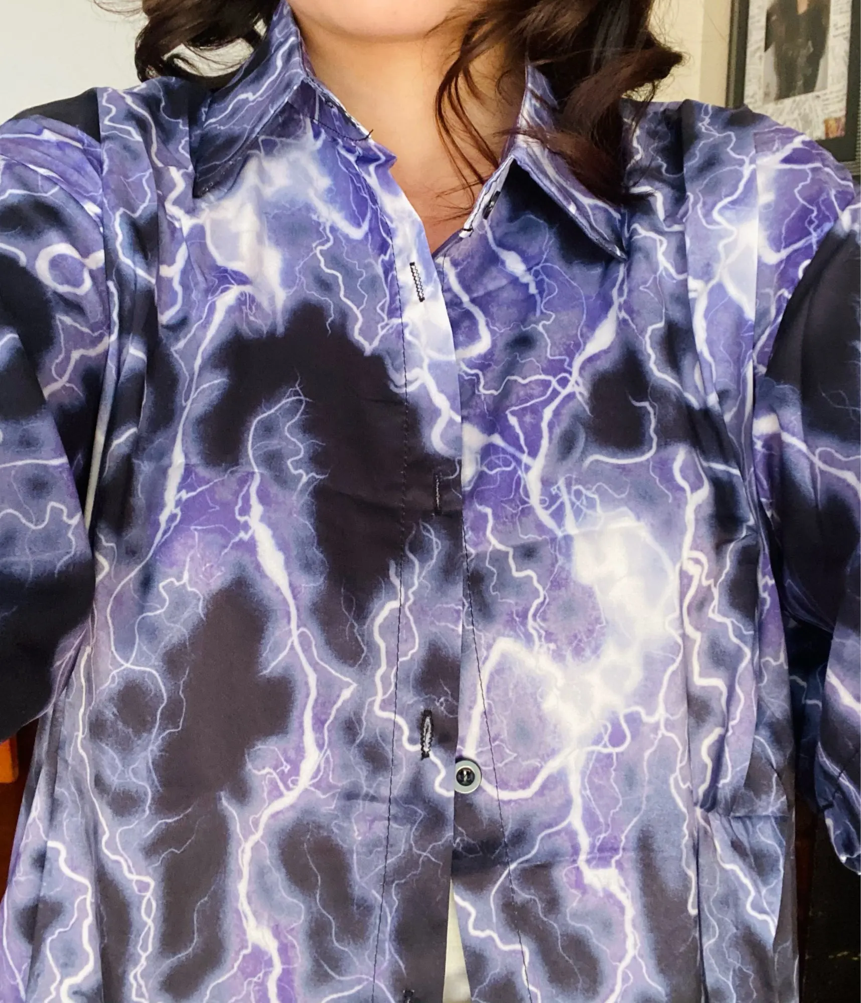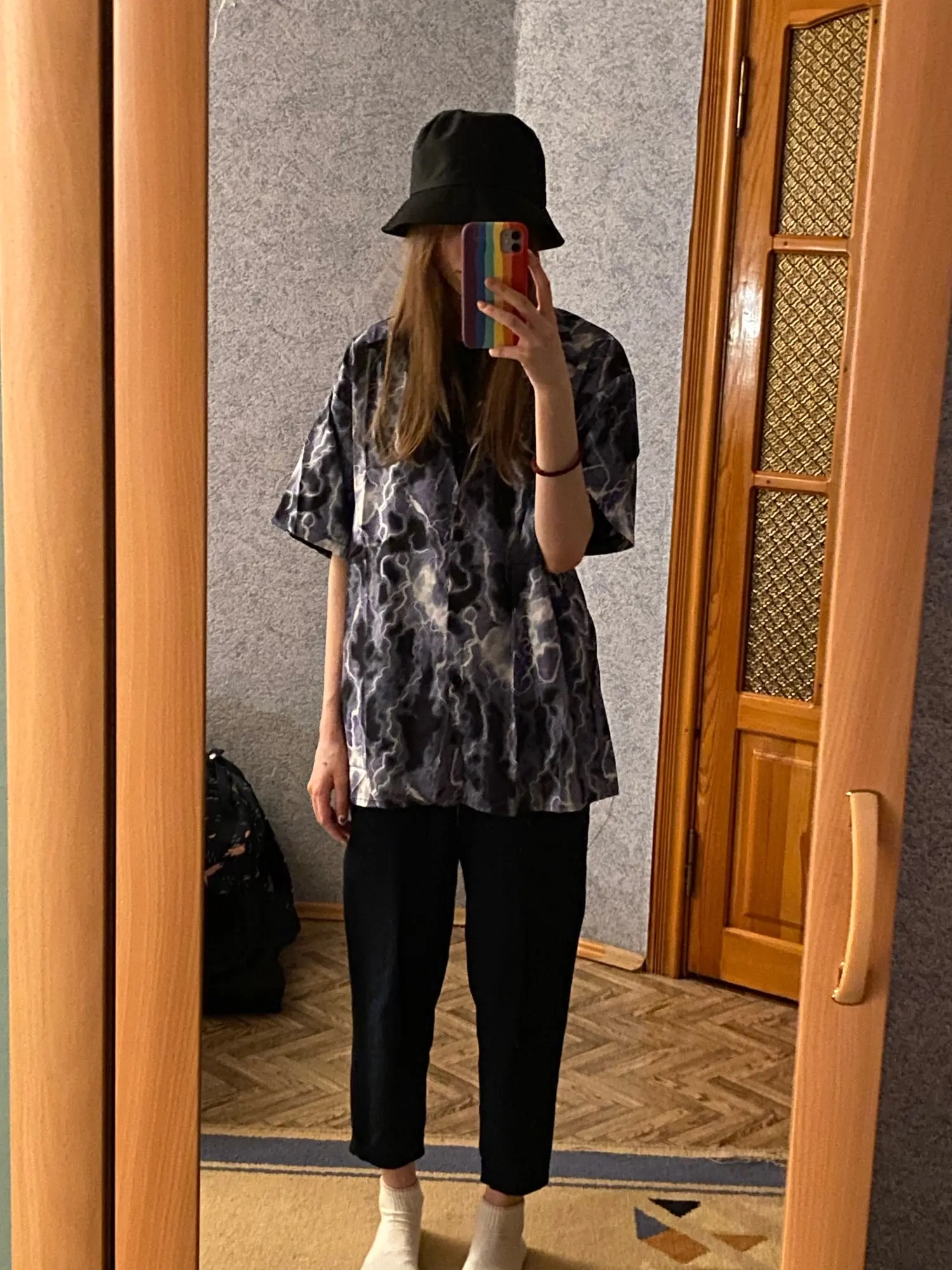 Рубашка классная. В целом, как на фото. Единственное, в жизни она немного тусклее, менее яркая. Но даже так выглядит супер. По качеству не знаю, что это за ткань. Она не блистит, просто хлопок, наверное. Нитки нигде не торчат. Размер тоже отлично. Заказывала побольше, так как хотела оверсайз, при моих параметрах 80/65/85, все супер. Доставили за месяц где-то, хотя были новогодние праздники. В общем, заказ отличный, рекомендую