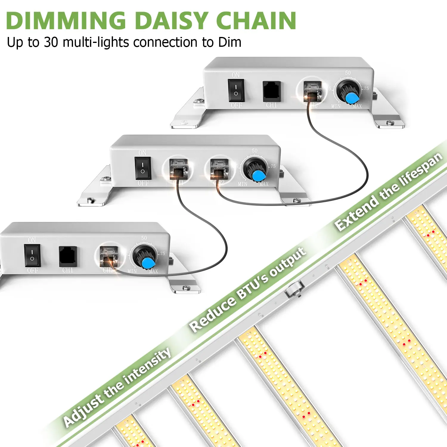 1. ДиммируемаяДобавлена ручка с регулируемой яркостью, Переключатель ВКЛ/ВЫКЛ и многофункциональная функция подключения для садоводства, можно подключить и контролировать до 20 шт.
