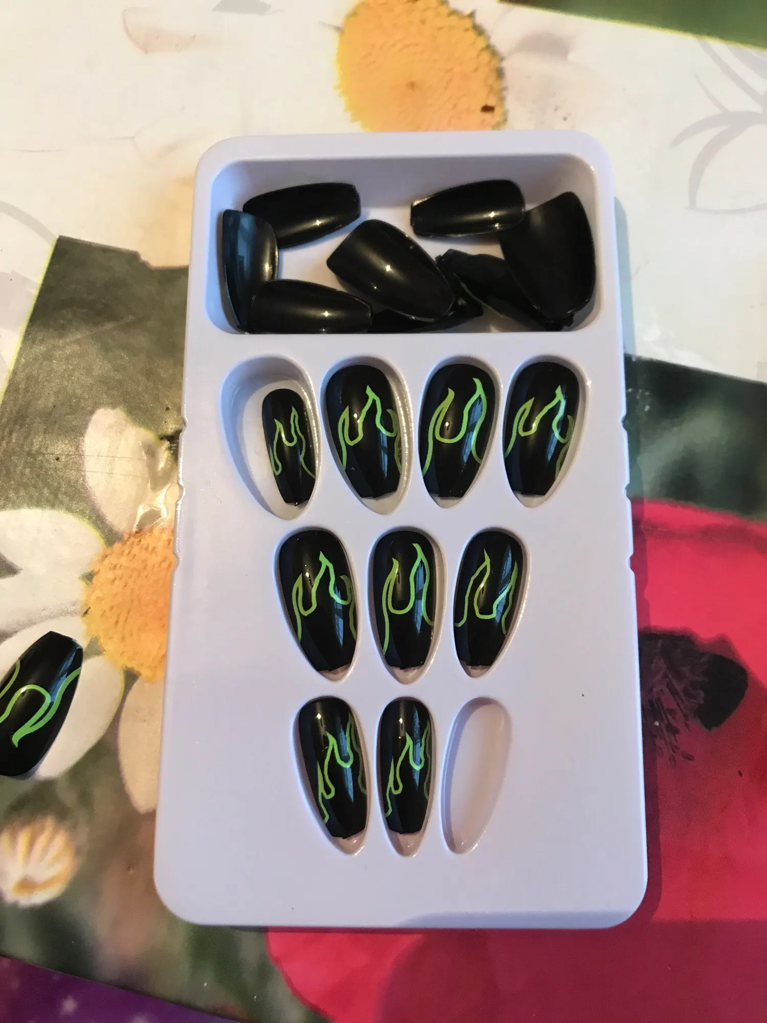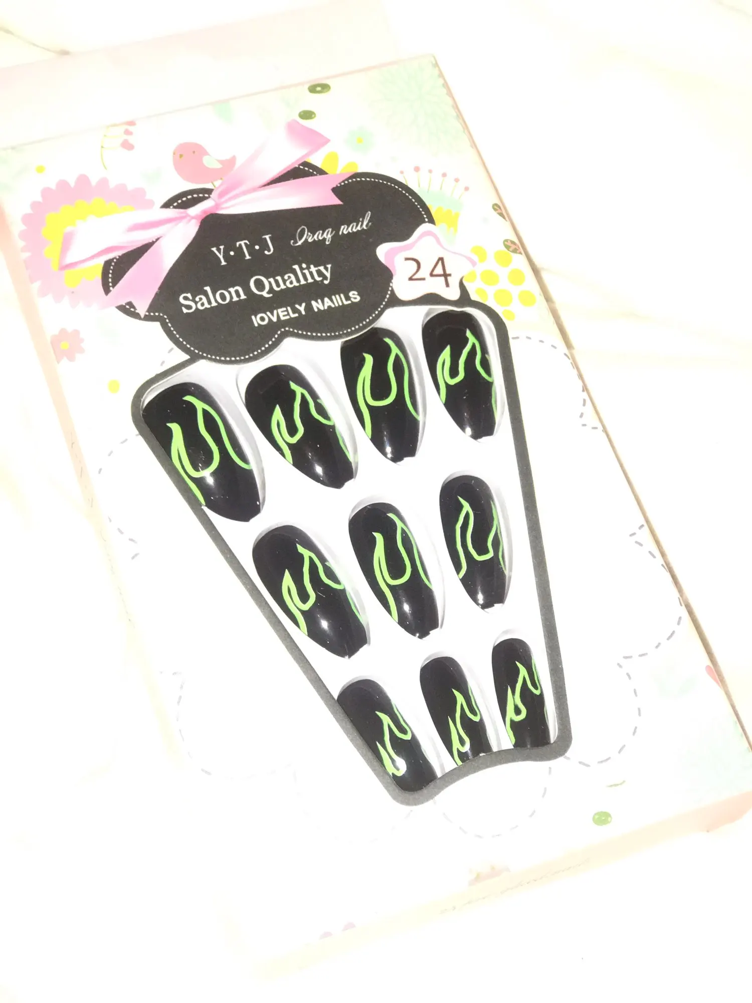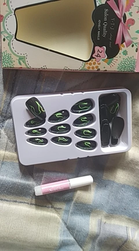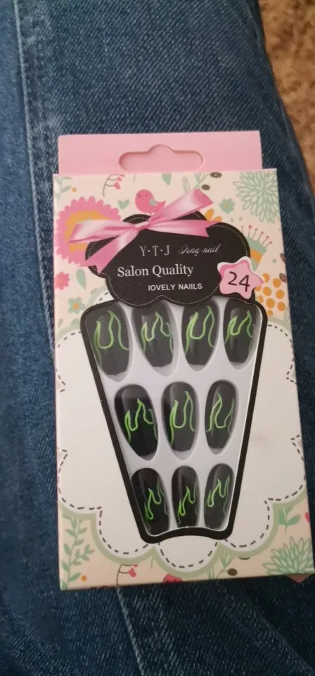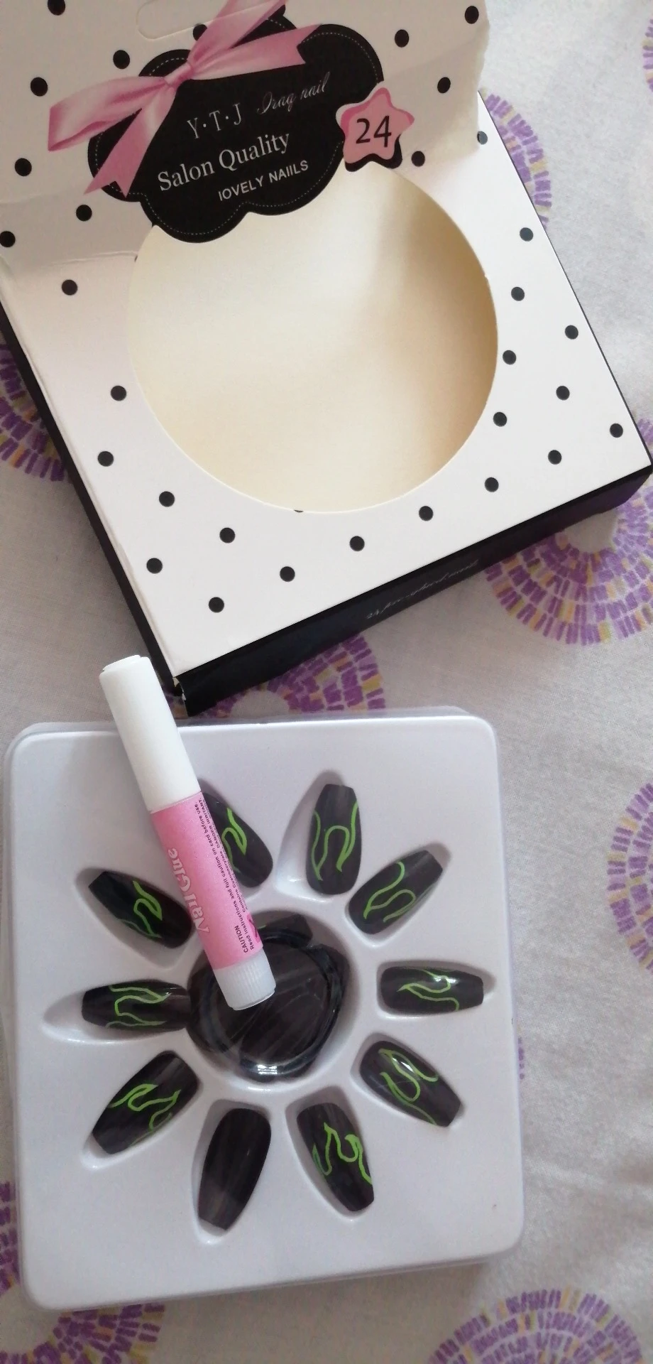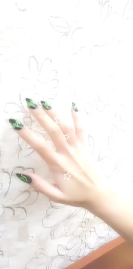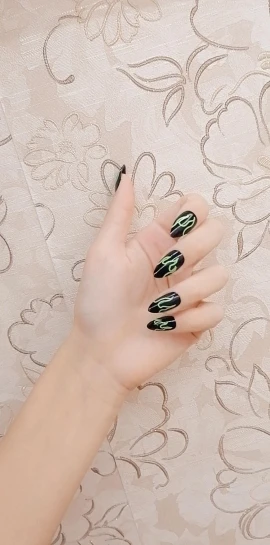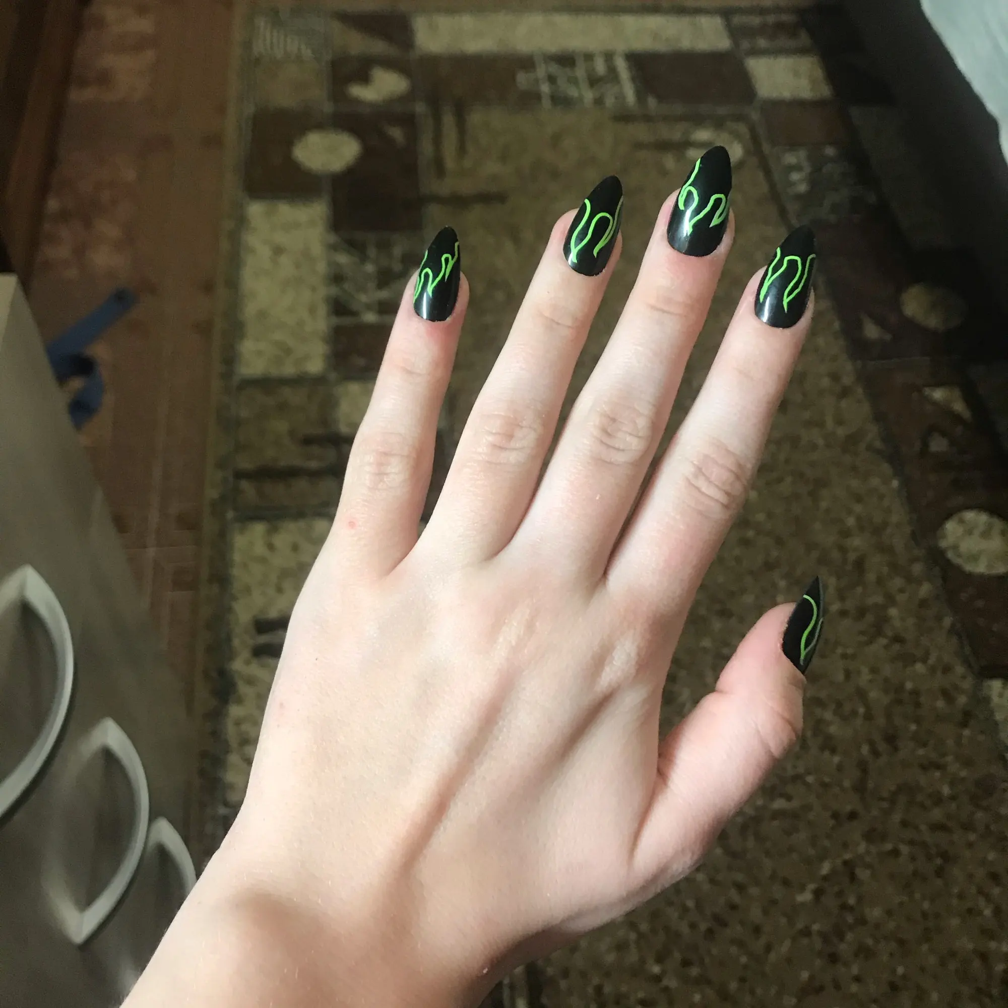 Вау. Какие ногти. Просто шик. Заказывала чёрные с зелёным огнём. Клей крепко держит. Спасибо,❤️