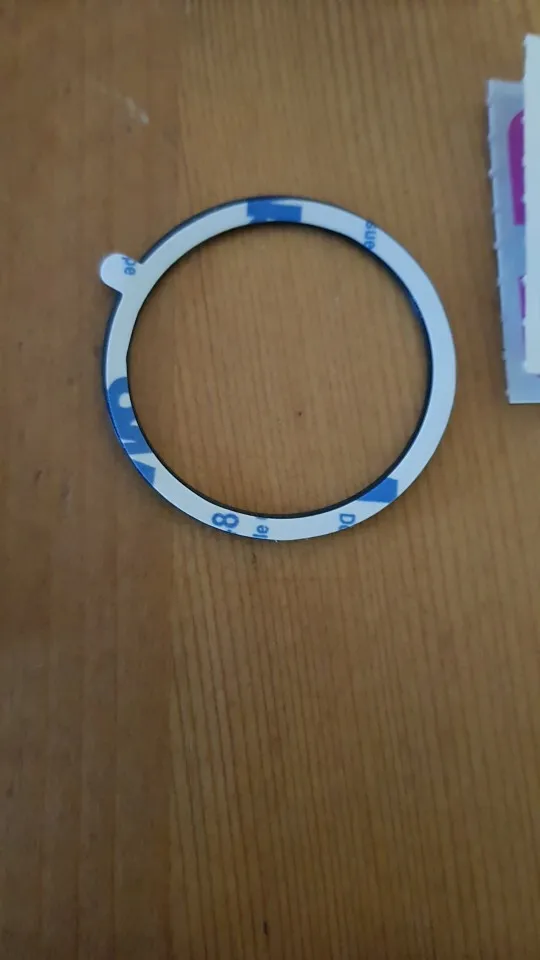 Хорошее железное кольцо. Качество отличное. Скотч приклеен не ровно. К часам приклеилось не сразу, так как угол наклона поверхности не совсем совпадает с часами, пришлось кольцо немного выгибать, после чего село плотно.
