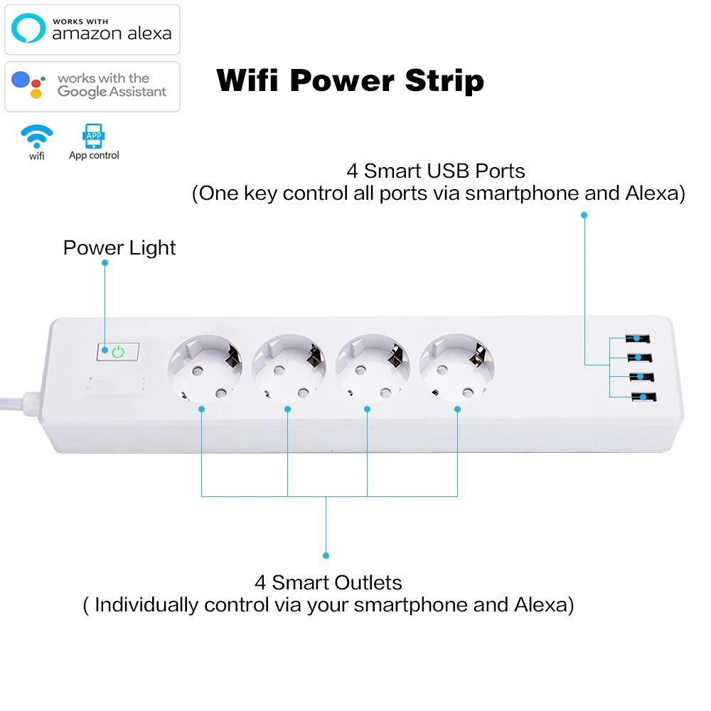 Интеллектуальная беспроводная (Wi-Fi) Мощность полосы Tuya Smart приложение Тип управления-F ЕС 4 розетки 4 Порты USB индивидуально управление Alexa Google Home голосовое