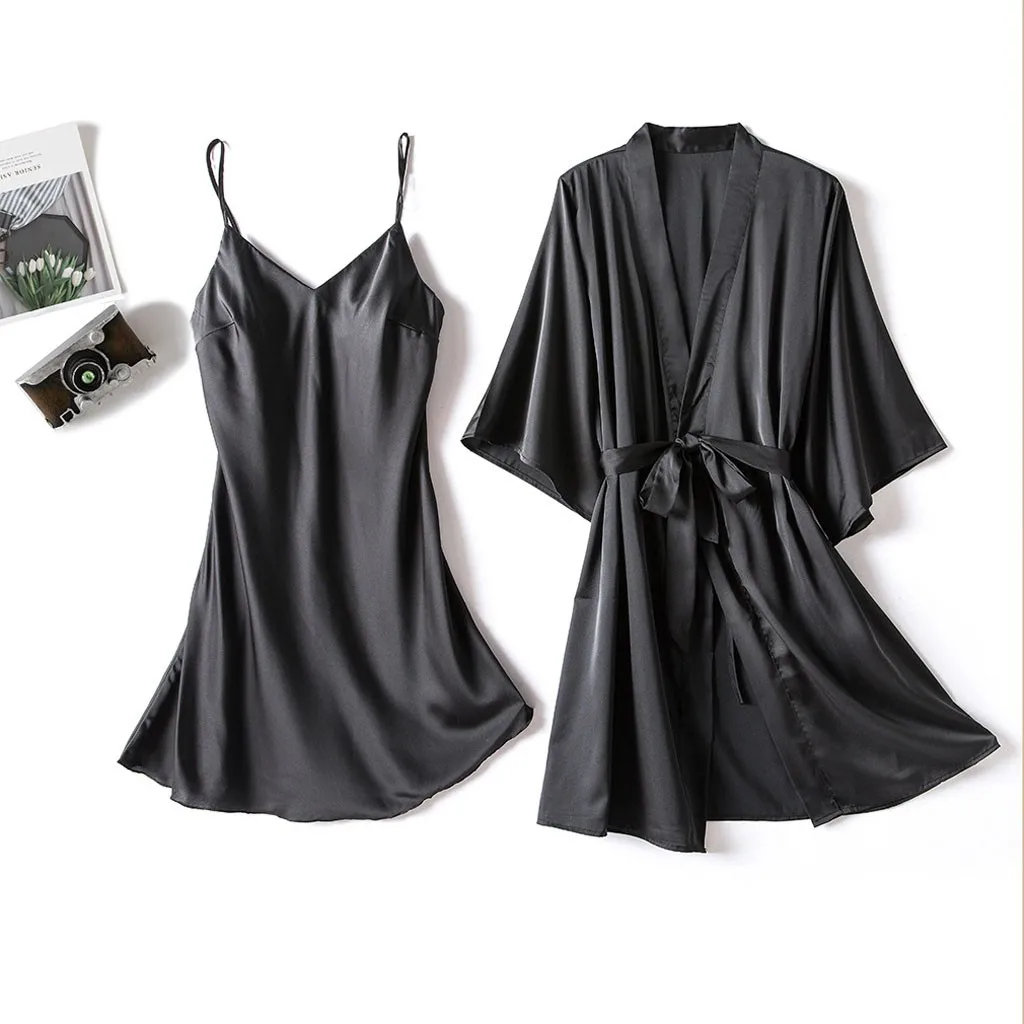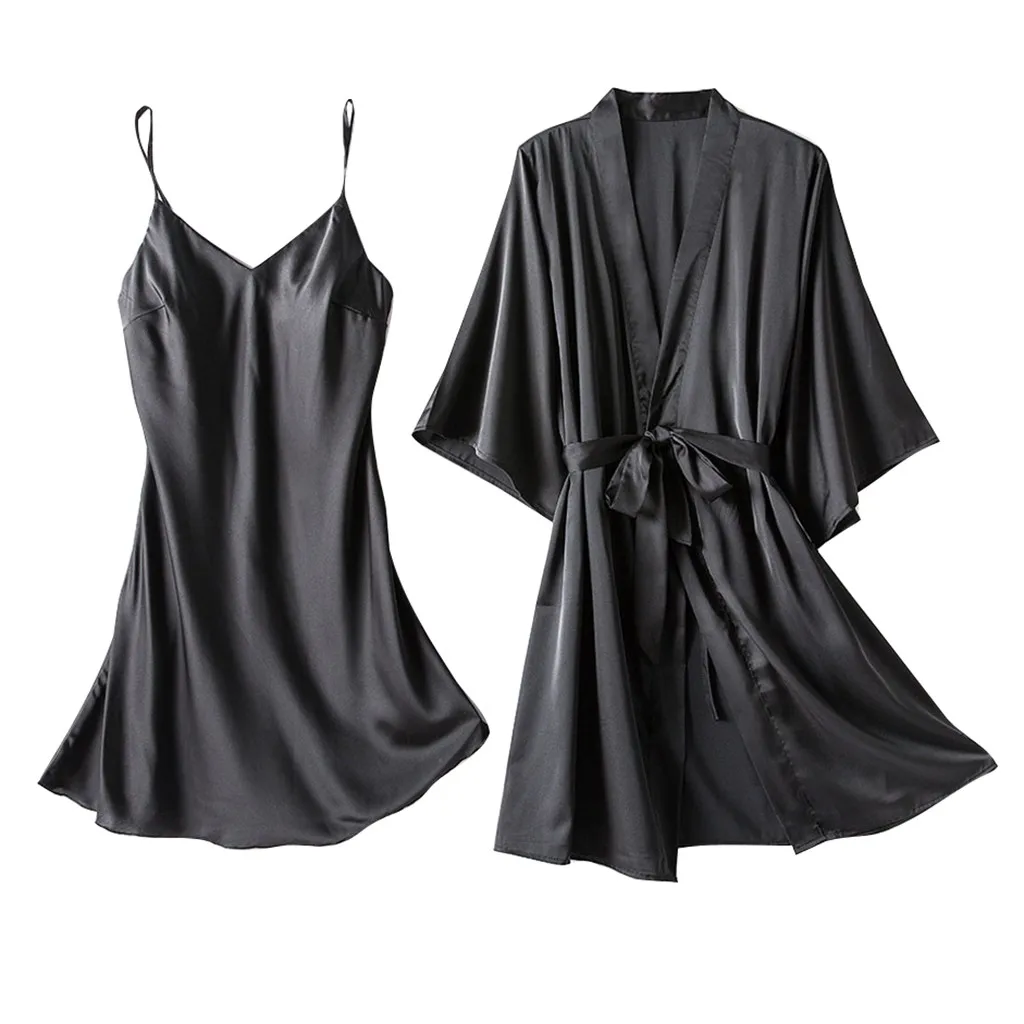 Женский сексуальный халат из вискозы, комплект из 2 предметов, Однотонная ночная рубашка-кимоно, кружевная ночная рубашка, комплект одежды для сна #3