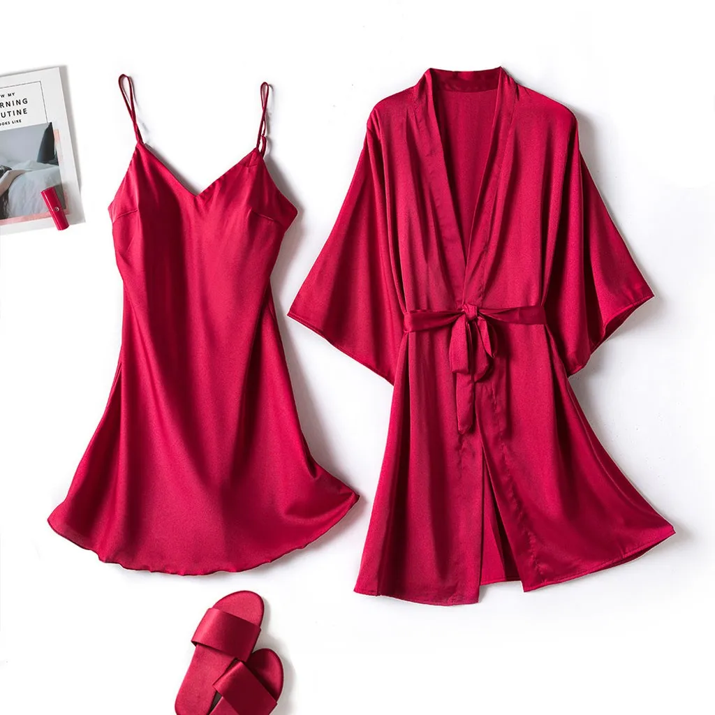 Упаковка: 1 комплект кружевной атласной пижамы (1 халат 1 Ночная рубашка)