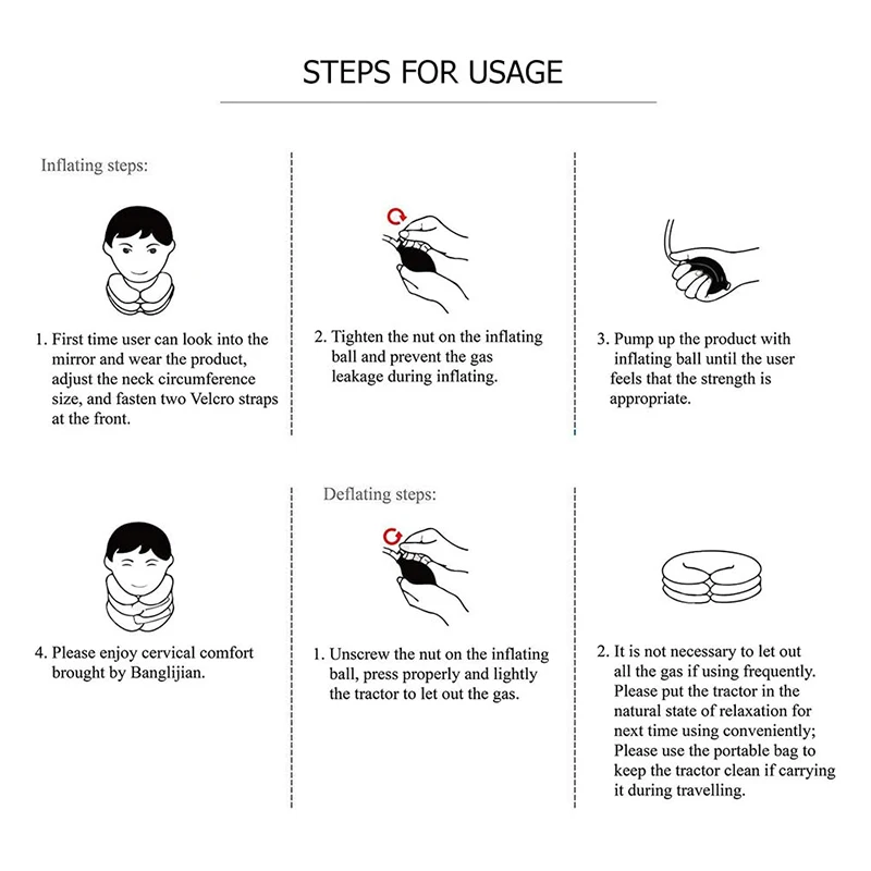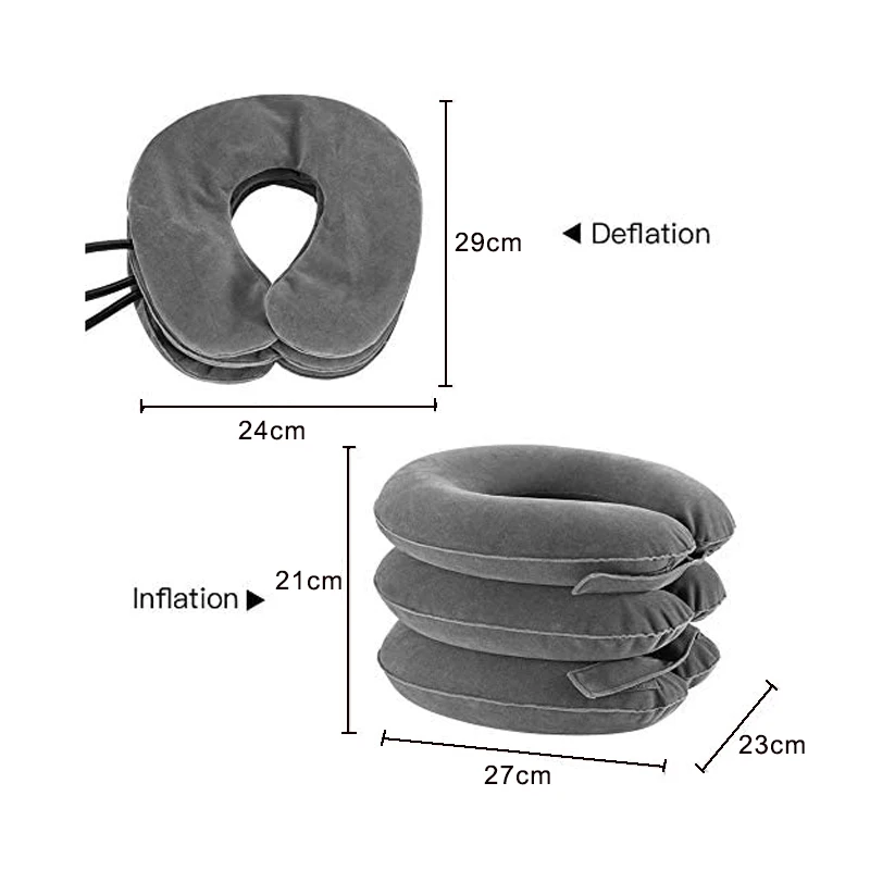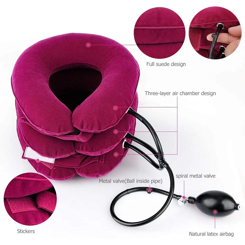 1) исправляет осанку и снимает боль: надувные носилки для шеи корректируют осанку и облегчают боль в шее и плечах, обеспечивая сцепление на 360 ° 2) помощник по здоровью: надувная поддержка шеи помогает при хроническом горле, артрите, грыже, выпуклости диска, напряжении, шейных мышечных спазмах, выравнивании позвоночника и т. д. 3) Простота использования и портативность: надувной шейный бандаж не требует сборки, и вы можете просто носить его, полностью портативный. Вы можете легко взять его в любом месте и использовать его в офисе или во время путешествий, идеально помещается в карманы или чехол или сумку для переноски 4) увеличение кровообращения: надувная подушка для шеи увеличивает кровообращение в структуры шейного отдела позвоночника, помогая кислороду мышц, нервов, сухожилий, тем самым уменьшая боль и способствуя расслаблению 5) удобный материал: Надувное тяговое устройство для шеи изготовлено из экологически безопасных бархатных материалов, можно использовать долгое время с большим прикосновением, легко чистить и мыть, герметичность