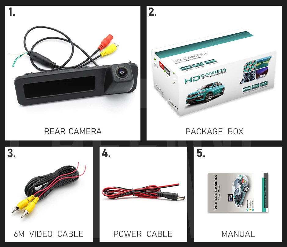 1. Задняя камера2. Коробка для посылка3. Видео кабель (6 м)4. Кабель питания5. Руководство пользователя