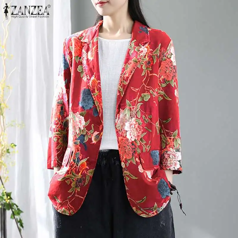 Блейзер ZANZEA женский из хлопка и льна, винтажный блейзер с цветочным принтом, тонкое пальто с воротником с лацканами, повседневная верхняя одежда, Свободный кардиган 7, осень