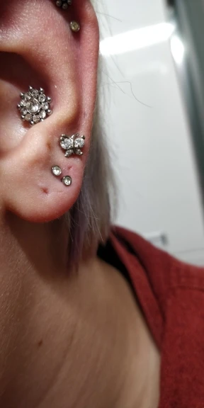 Он выглядит почти так же, как на картинке, но он поврежден. Винт на одном полностью выключен, как вы можете видеть на рисунке, а также одна из «ног бабочки» согнута больше, чем другая, и многое другое. К сожалению, это поврежденный товар, но они милые и блестящие, по крайней мере, если вы получите правильный, это хорошие серьги.