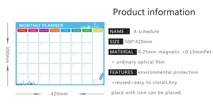 1. Магнитный материал, легко установить, любое место с утюгом можно разместить.2. Может быть сухая чистка, может быть повторно использована, охрана окружающей среды.3. Используйте для записи и напоминания, Сделайте жизнь более простой и комфортной.