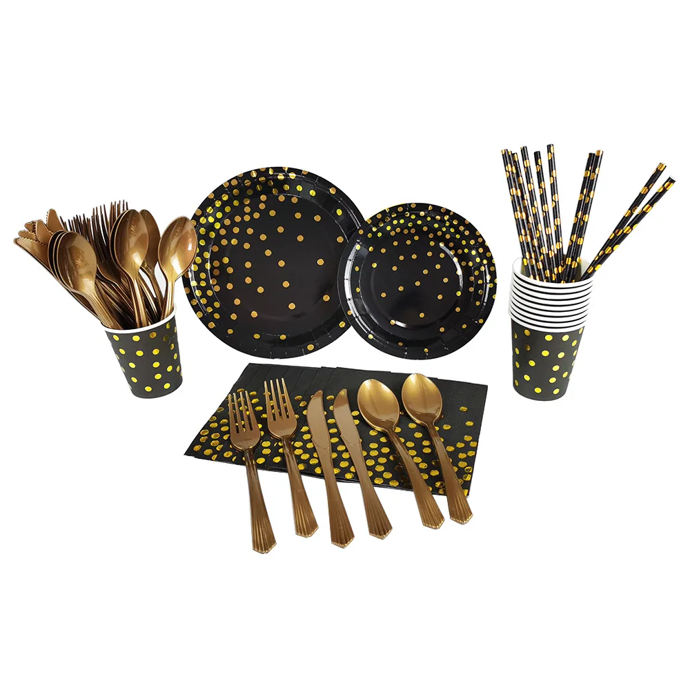 Цвета: черный, золотистый вечерние набор одноразовой посуды бумажны...