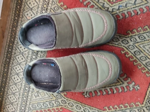 Так эти тапки выглядят через восемь месяцев носки в сельском доме (хорошо). Необычное сочетание мягкого верха и вездеходной подмётки оказалось очень удобным. Не тяжёлые, теплые, прочные, нога внутри как младенец в колыбельке и не скользят ни при каких обстоятельствах. Брал на размер больше, подошли идеально. Купил себе, потом жене, потом друзьям. И вам советую.