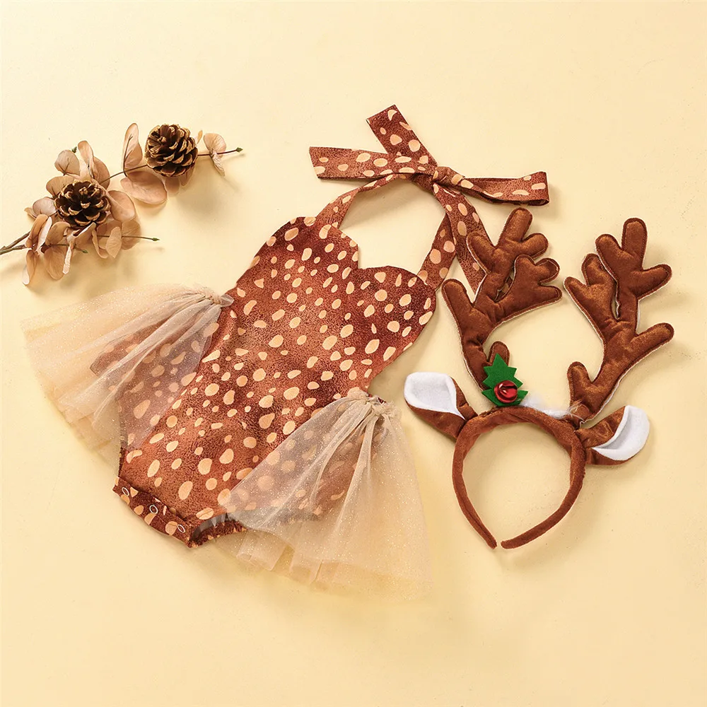 Рождественская Одежда для маленьких девочек; Комбинезон с оленем и рюшами; Боди с лямкой на шее; Кружевной комбинезон-пачка; Повязка на голову; Комплект из 2 предметовЗдравствуйте! Добро пожаловать в наш магазин! Качество-это то, что мы всегда преследуем!Модный дизайн, высокое качество, 100% новый брендМатериал: смесь хлопка(В комплект не входит красный нос)Цвет: как показано на фотографиях