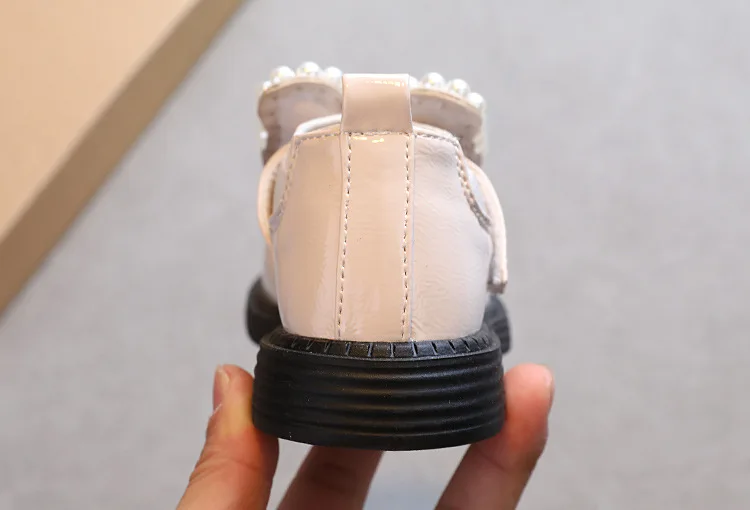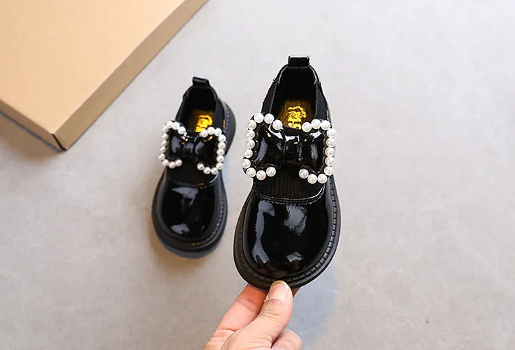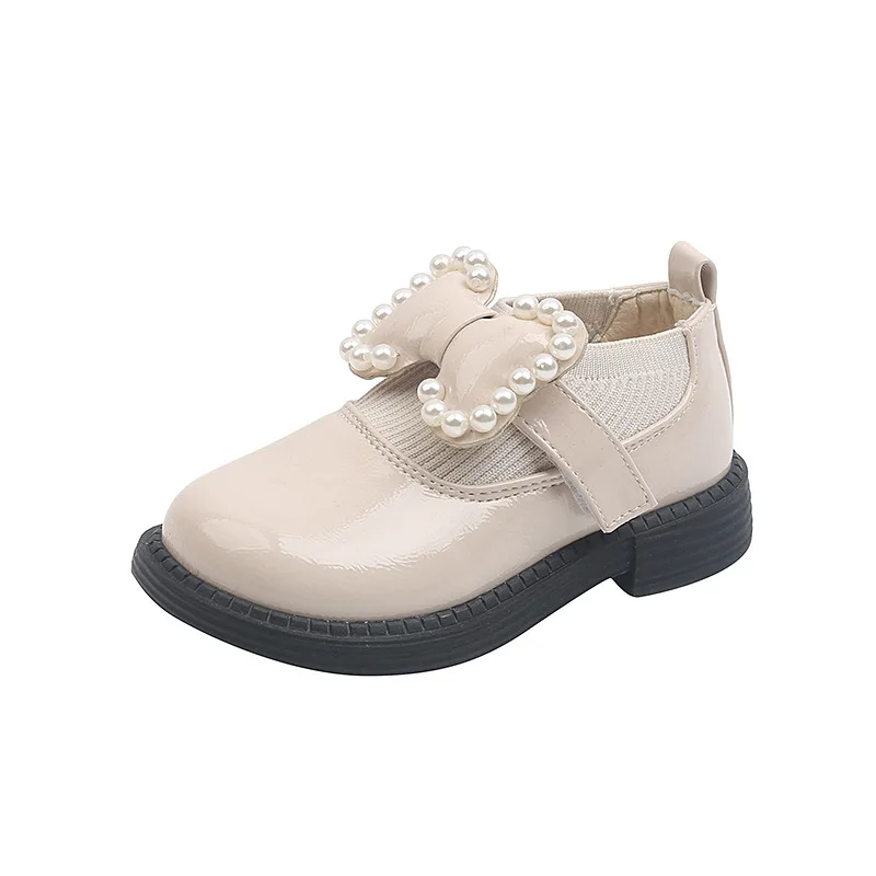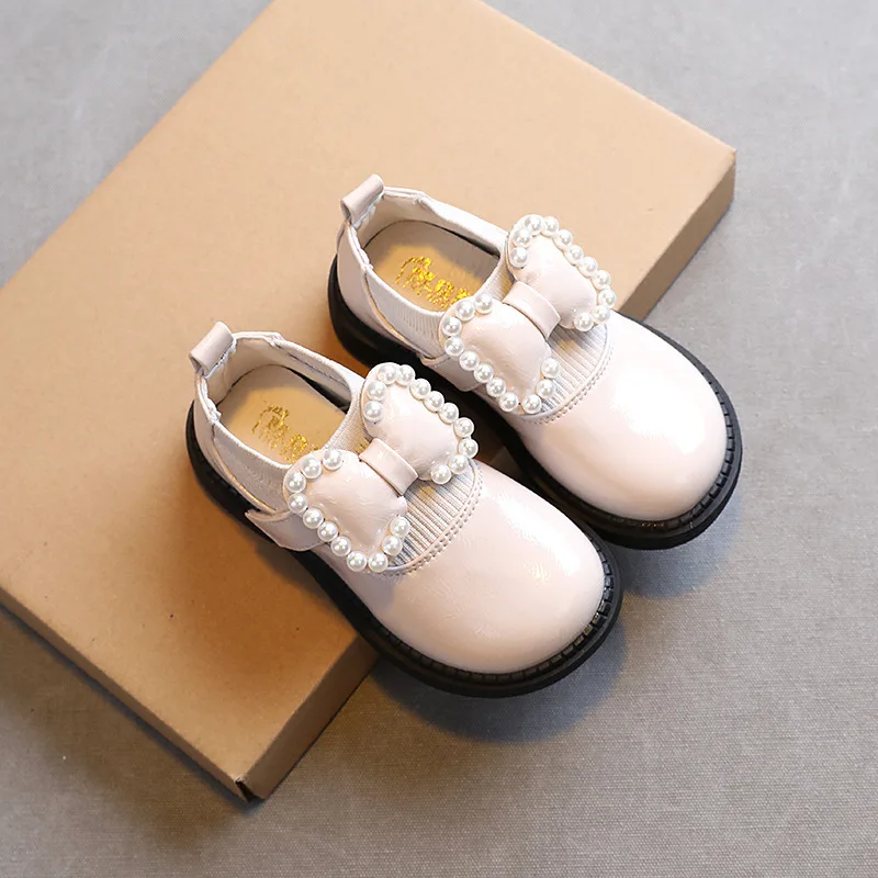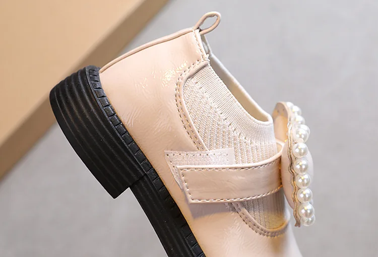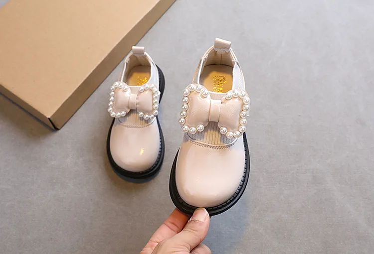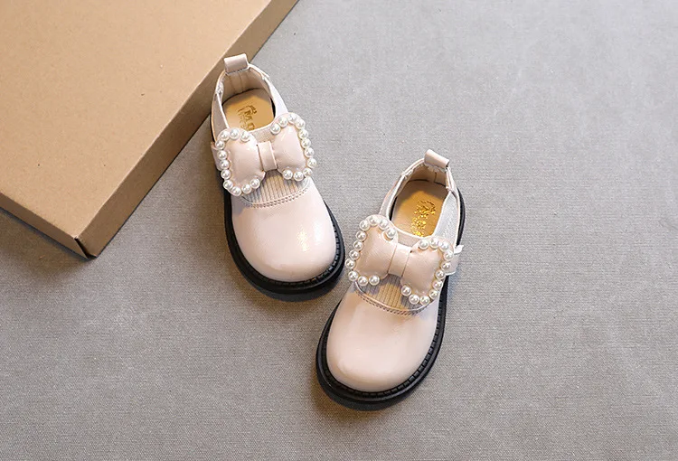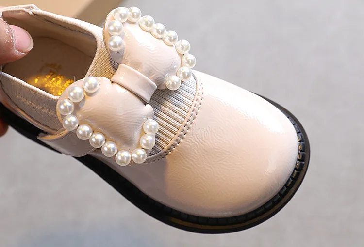 Туфли детские кожаные на плоской подошве, с бантом и жемчужинами, D826, 2021