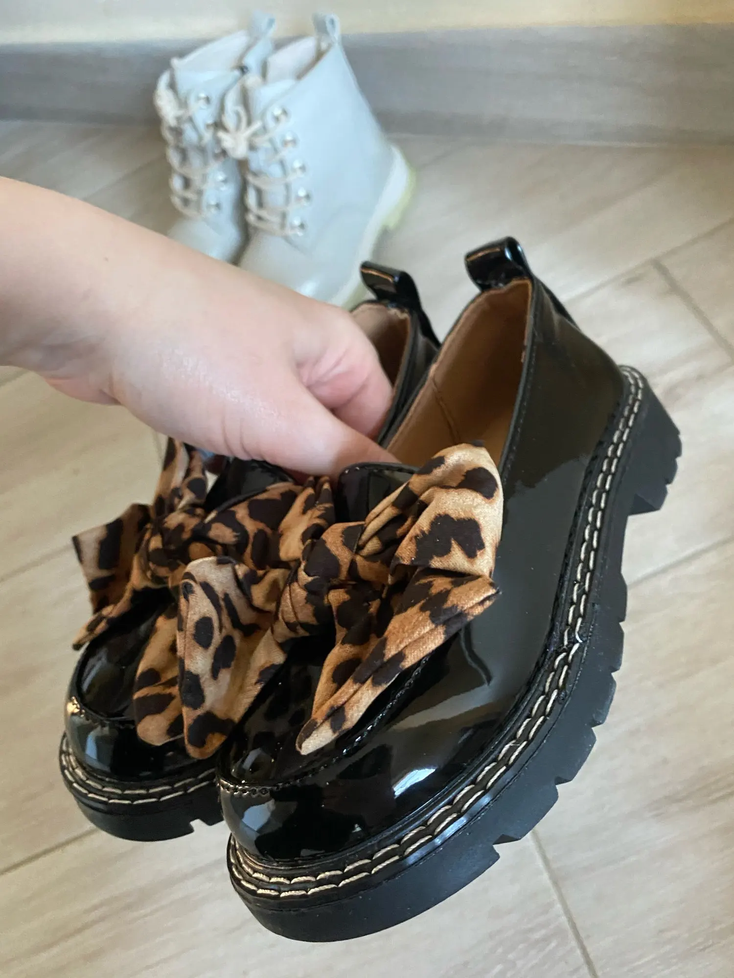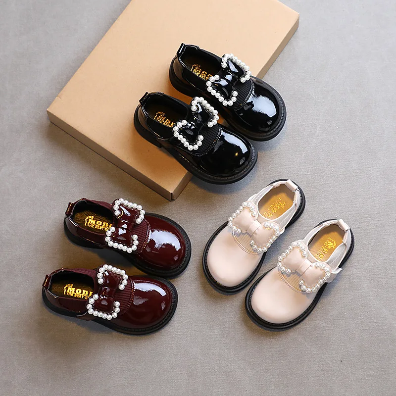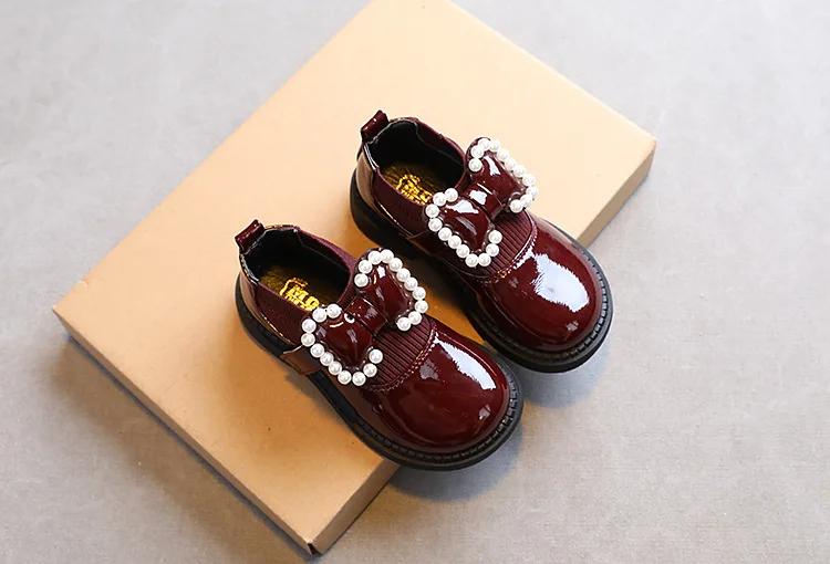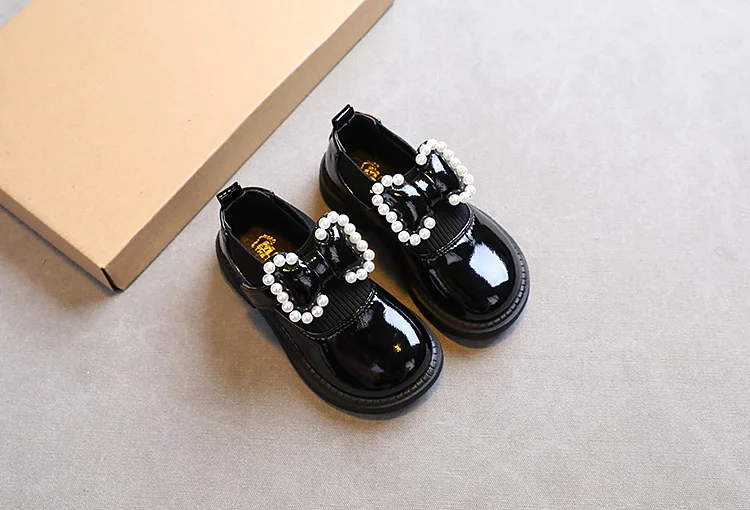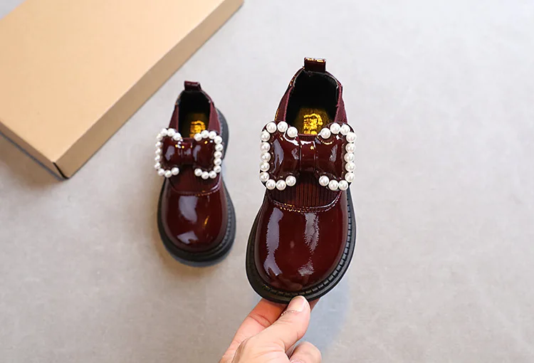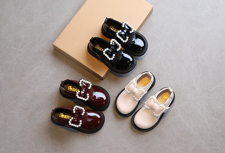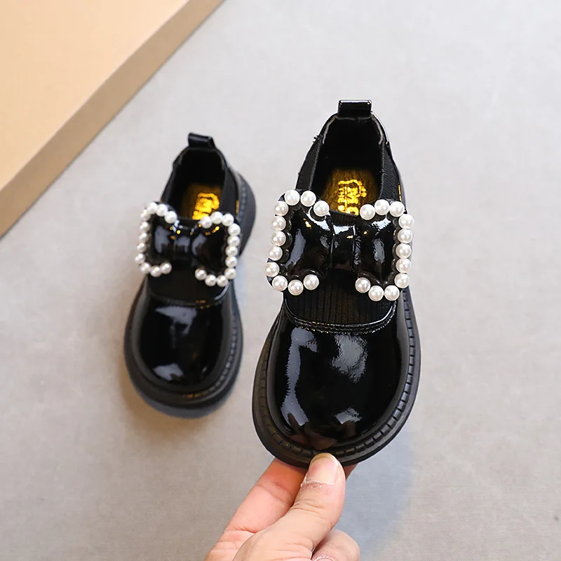 Туфли детские кожаные на плоской подошве, с бантом и жемчужинами, D826, 2021