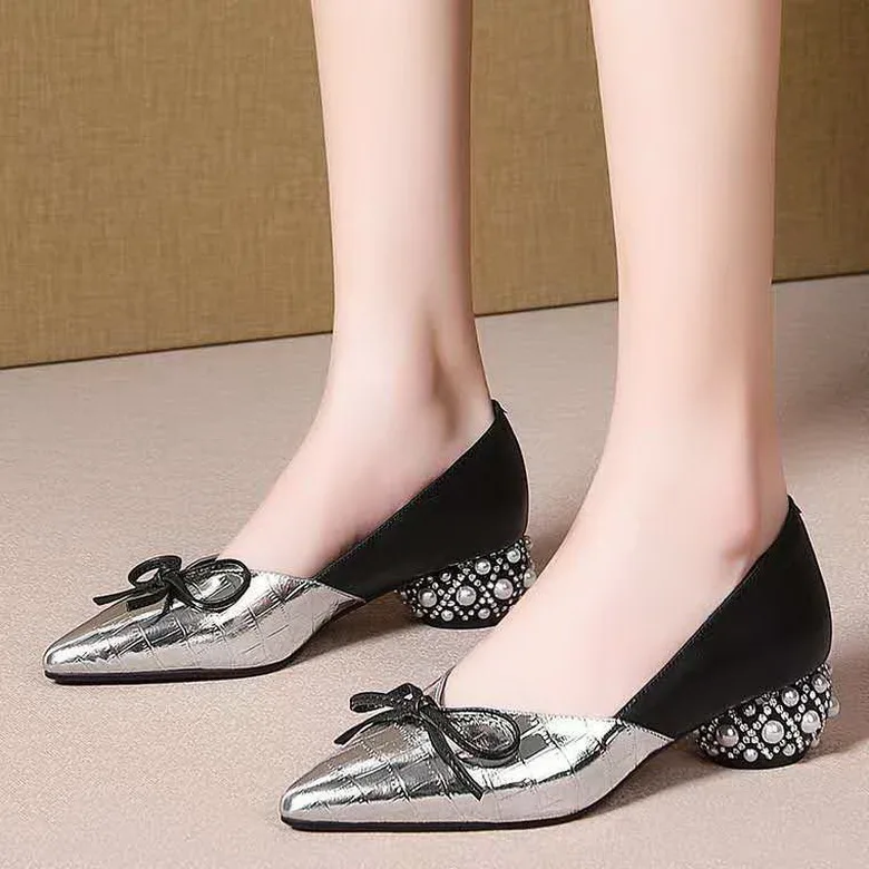 Туфли женские из мягкой кожи, на среднем каблуке, с острым носком, серебристые, осень 2020
