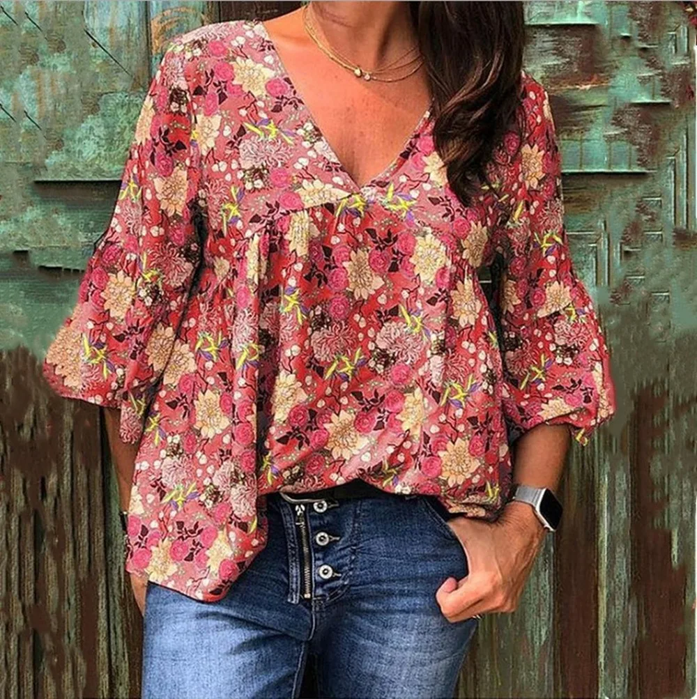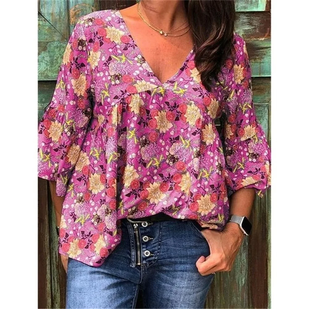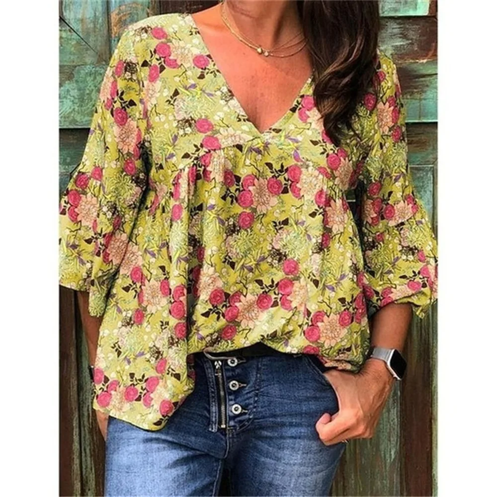 Женские блузки мода 2020 Лето Глубокий v-образный вырез Половина рукава с принтом Свободный Топ Женская блузка