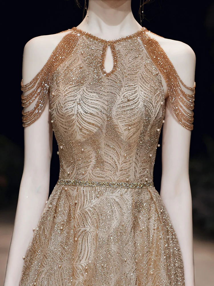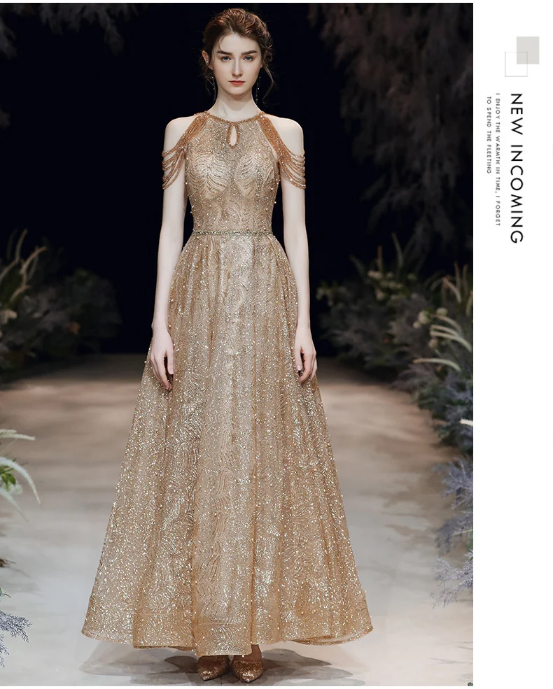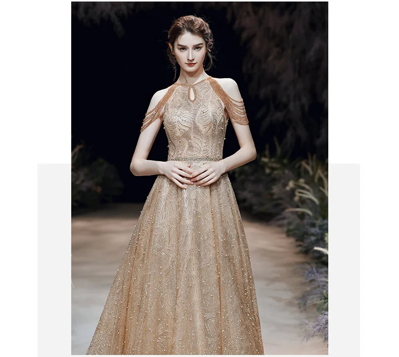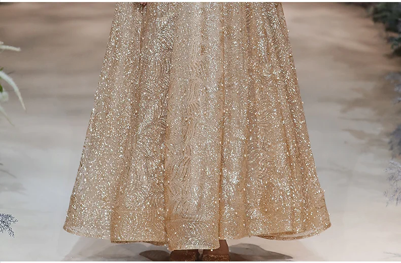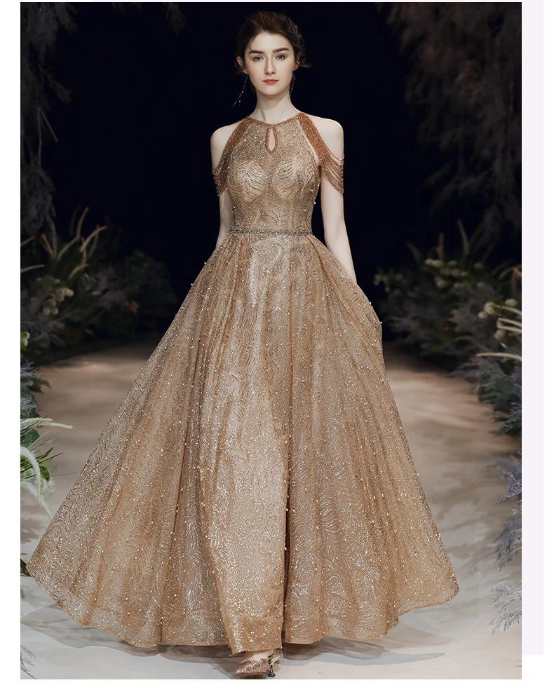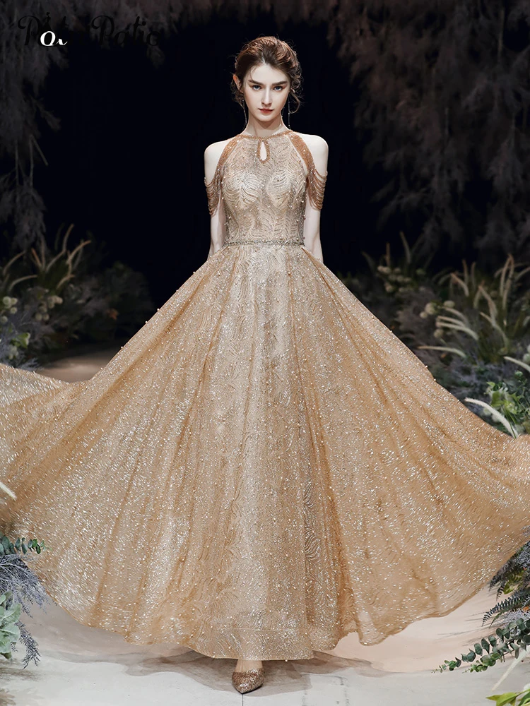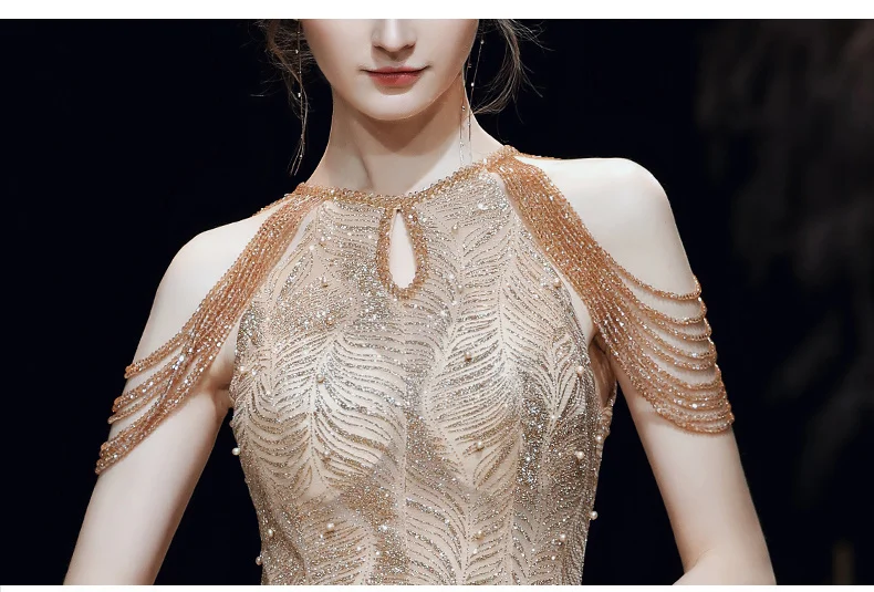 Золотые блестящие платья знаменитостей Длинные 2020 сексуальное полутрапециевидное вечернее платье ручной работы с бисером и жемчугом