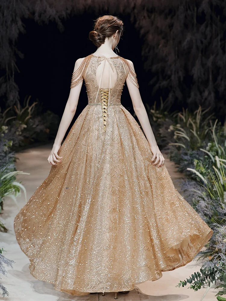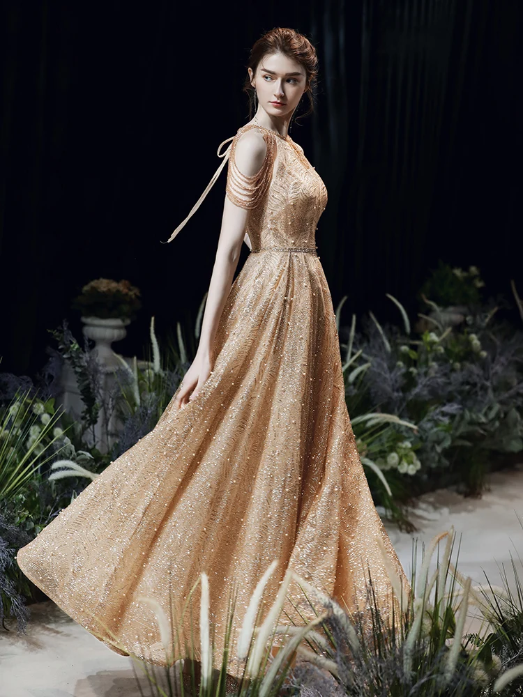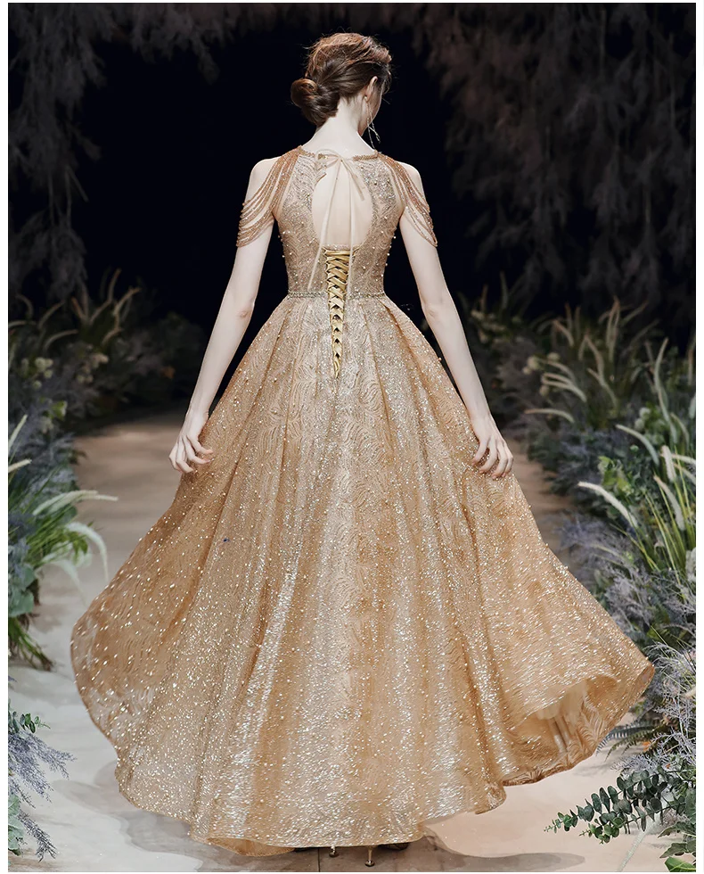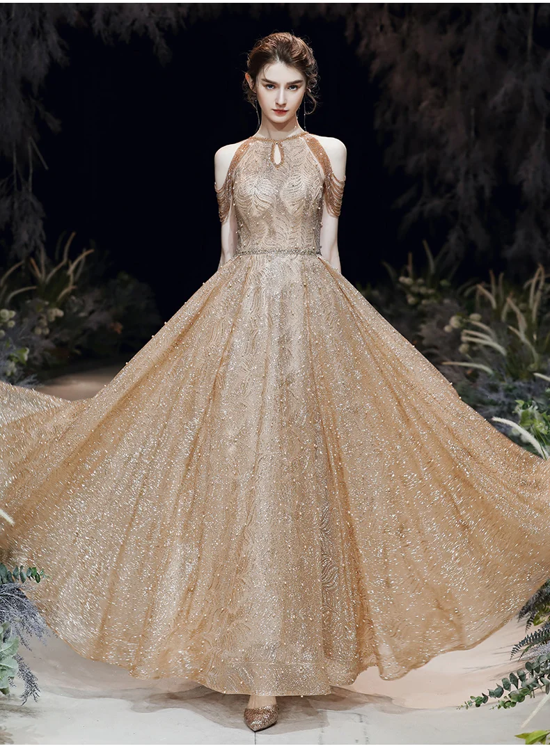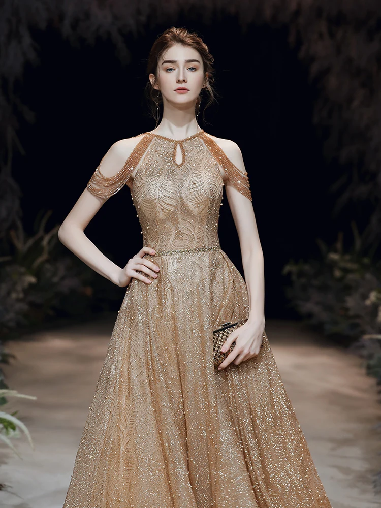 Золотые блестящие платья знаменитостей Длинные 2020 сексуальное полутрапециевидное вечернее платье ручной работы с бисером и жемчугом