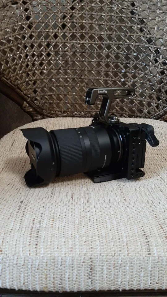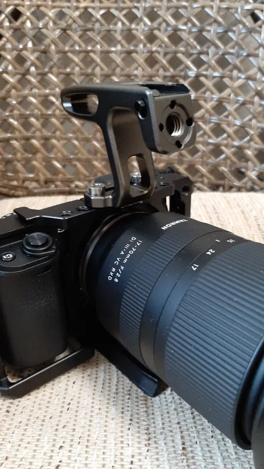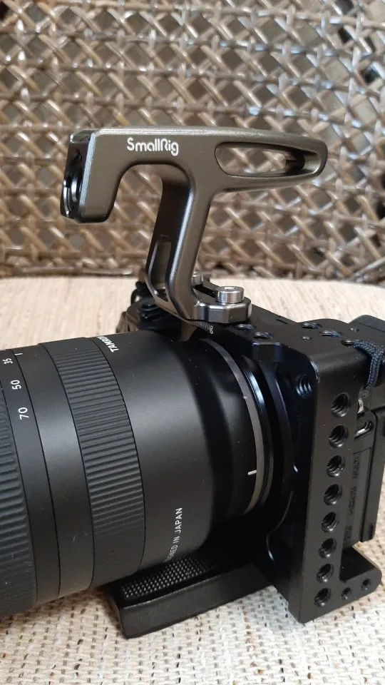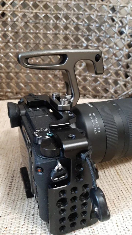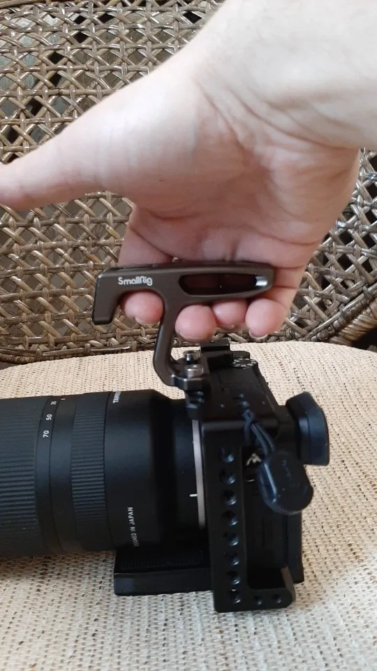 Ручка маленькая,но очень удобная. Видоискателем пользоваться не мешает, экран не в закрытом не в откинутом состоянии не перекрывает. Носить камеру за ручку супер удобно и безопасно. Очень рекомендую. Единственное она серого цвета,а клетка чёрная. Но смотрится всё равно отлично.