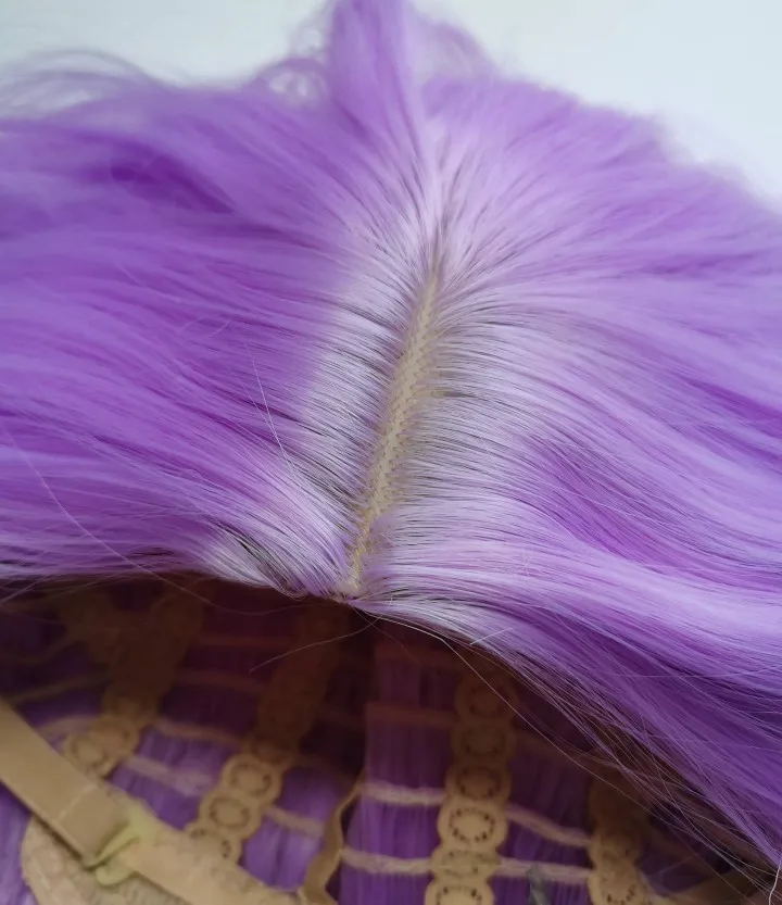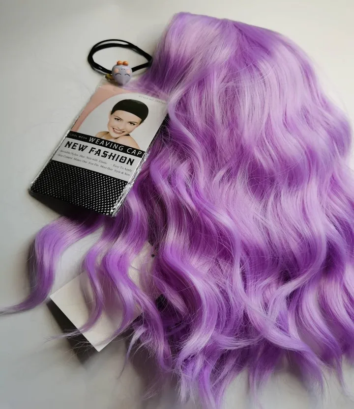 Парик выполнен из синтетического термостойкого волокна длиной 41 см. Волосы красивого сиреневого цвета, волосы очень густые. Волосы собраны на очень толстую синтетическую нить, которая сплетается в сетку. ⠀ В комплекте идёт сеточка для волос и татушка. Парик крепится сзади затягивается резинкой и крепится на два крючка. ⠀ Доставка до Омска осуществлялась в течении месяца. Посылочка пришла в обычном почтовом пакете + индивидуальный зип-пакет. При транспортировке ничего не пострадало.