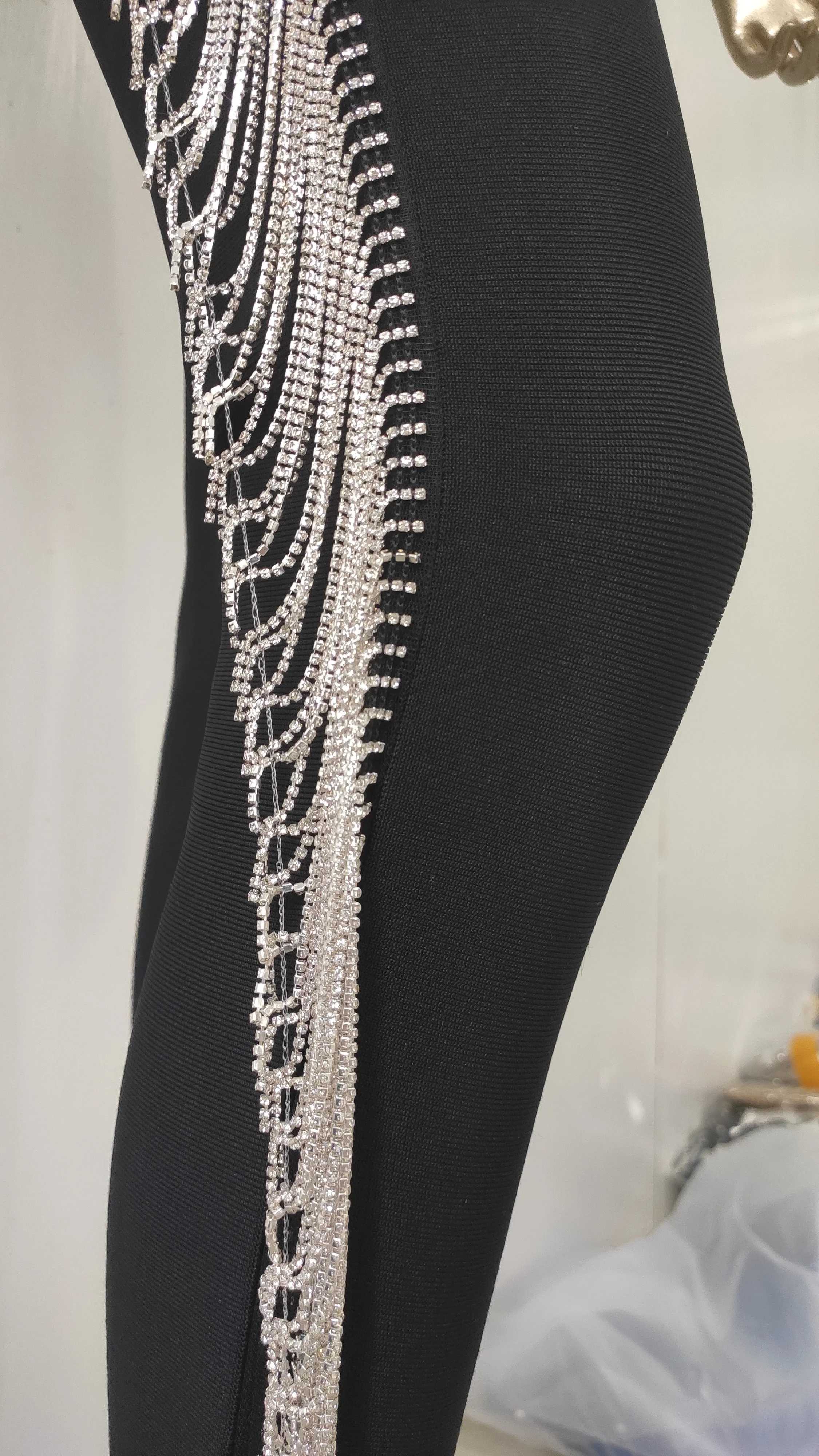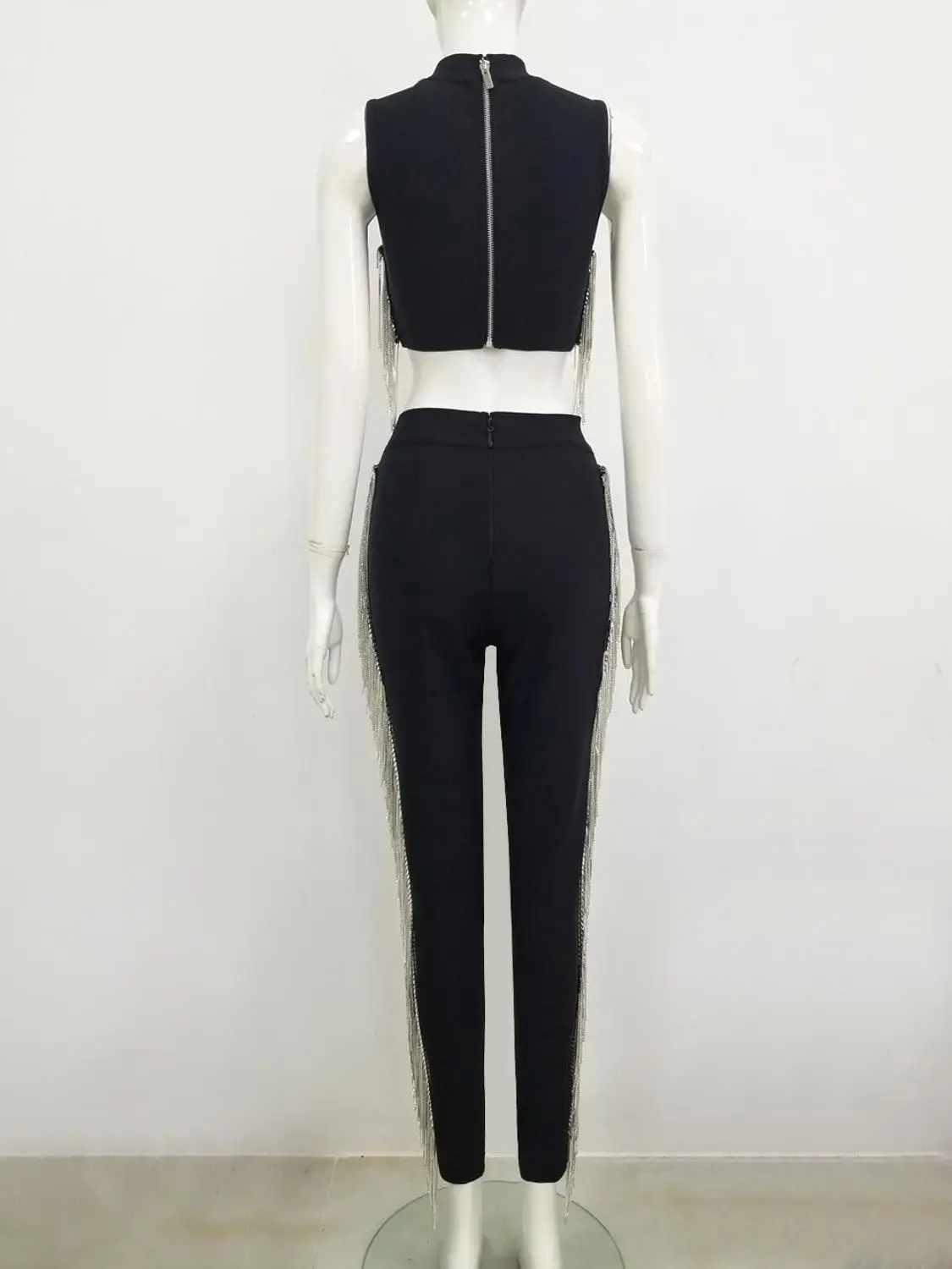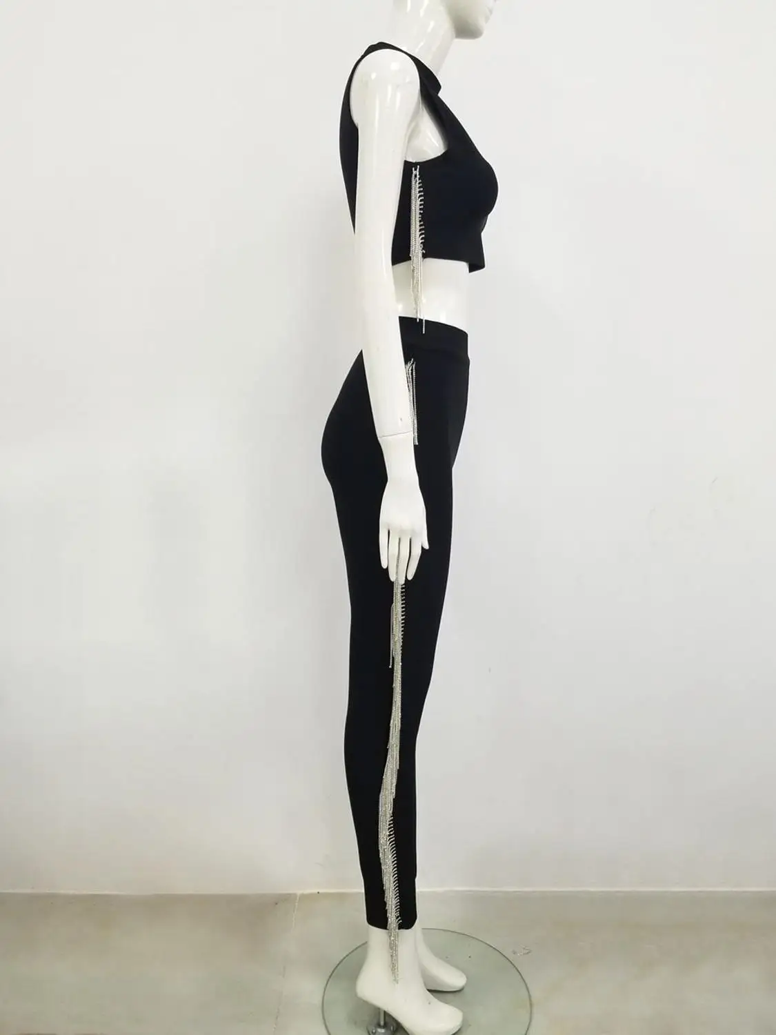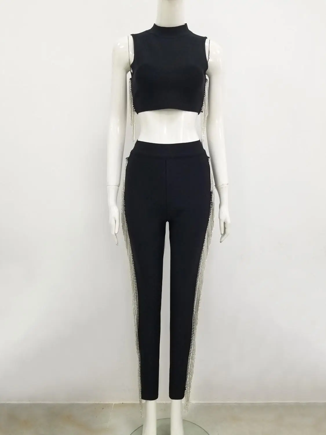 Женский Осенний сексуальный черный блестящий бандажный комплект из двух предметов без рукавов с бахромой и кристаллами, Модный женский комплект 2021