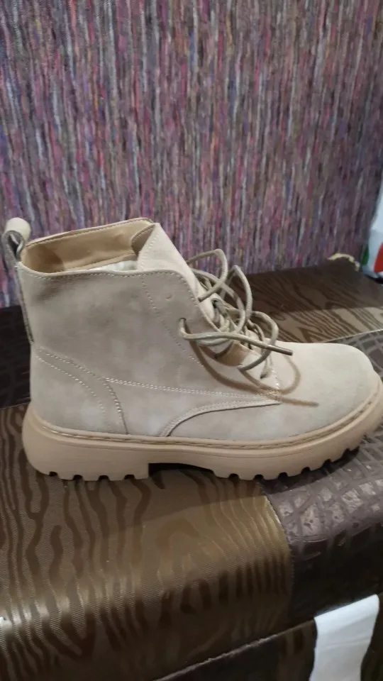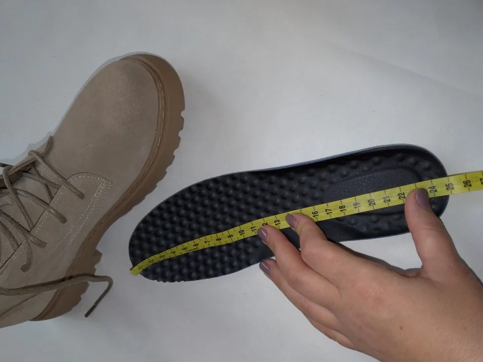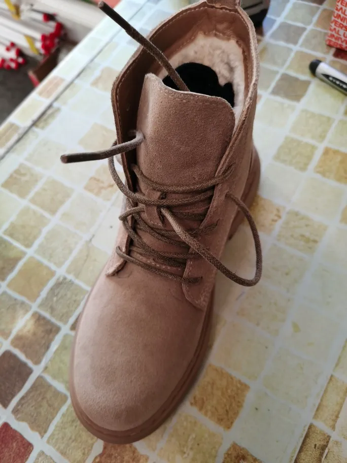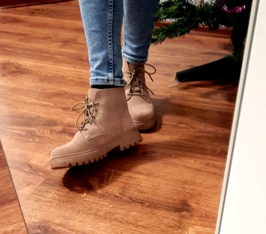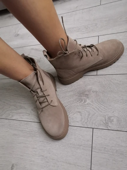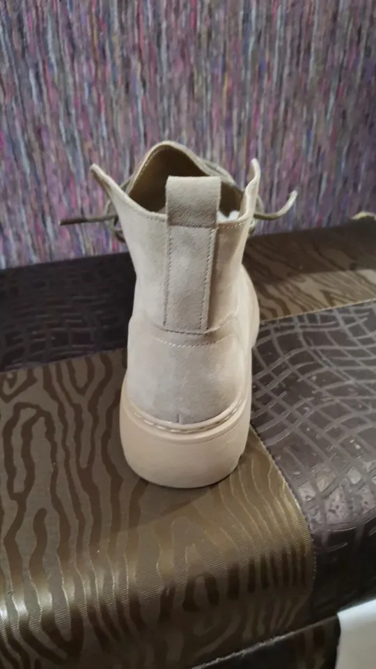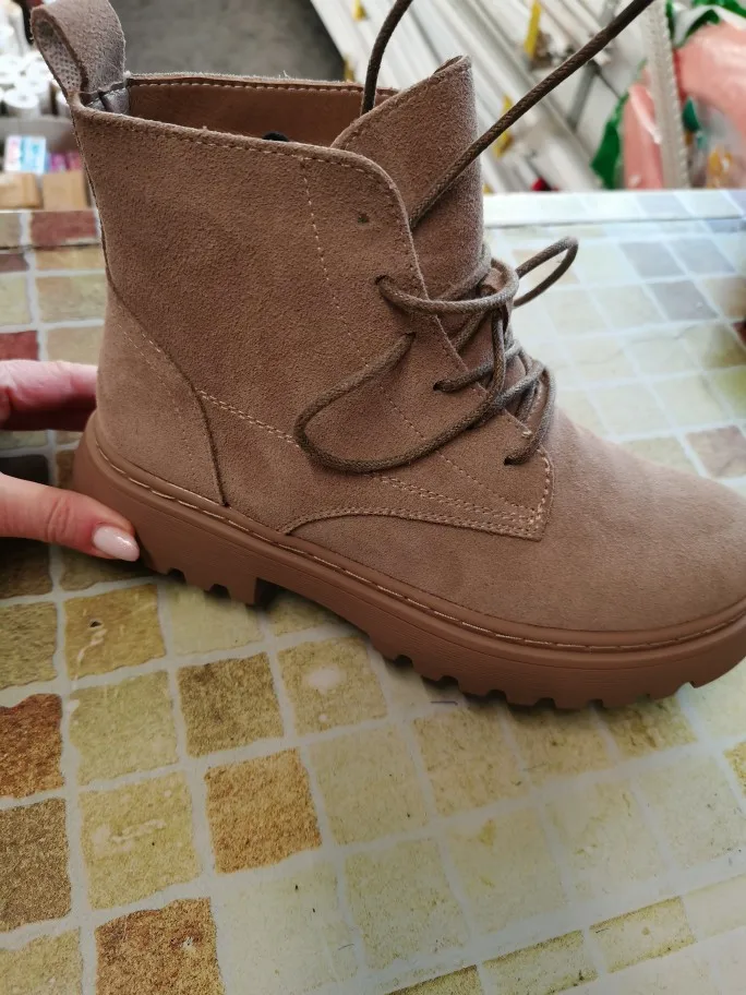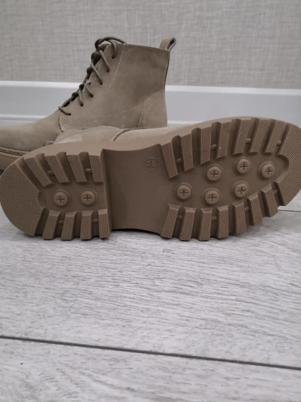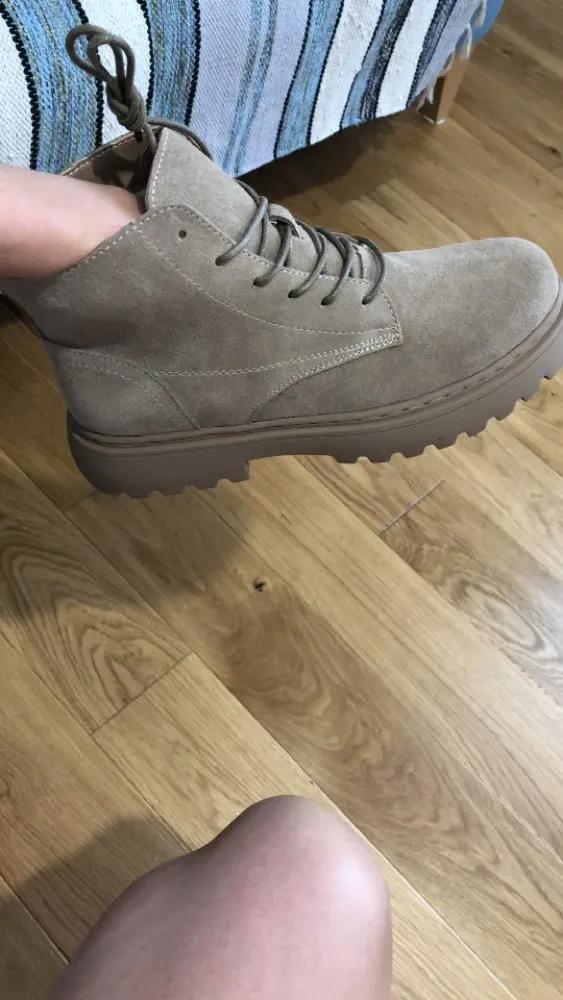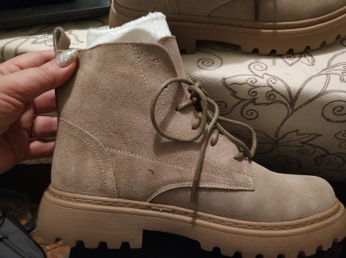 Ботинки отличные. Обычно размер 22,5 см, заказала 23, чуть свободные, как раз можно одеть с тёплым носком, так что по размеру все отлично. Замша очень приятная на ощупь. Подошва не твёрдая, ходить удобно, скользкие или нет, пока не знаю. Стелька мягкая, съемная. Есть небольшие полоски тёмные, возле шнуровки, но это не страшно, на фото показала.В общем очень довольна, особенно со всеми скидками 11.11.