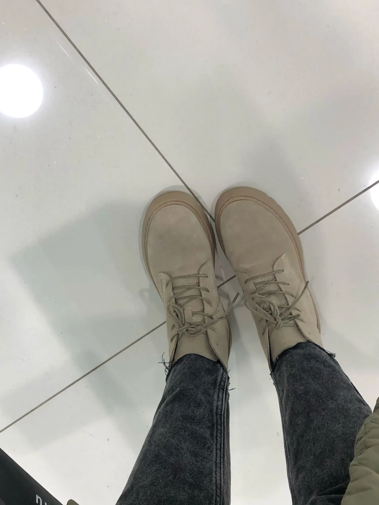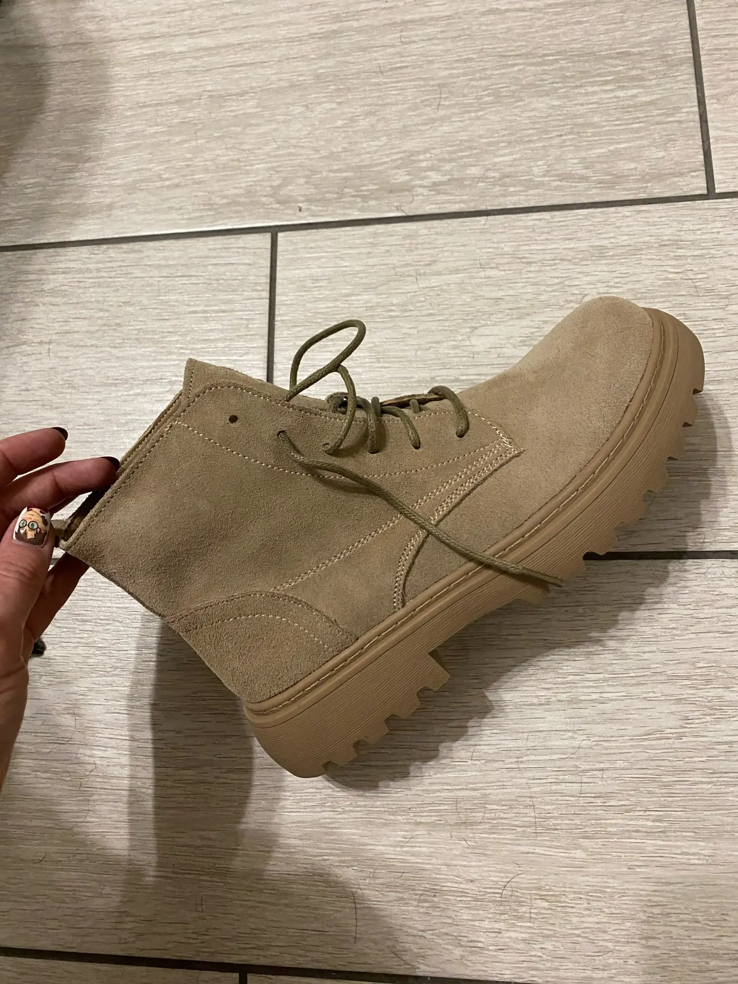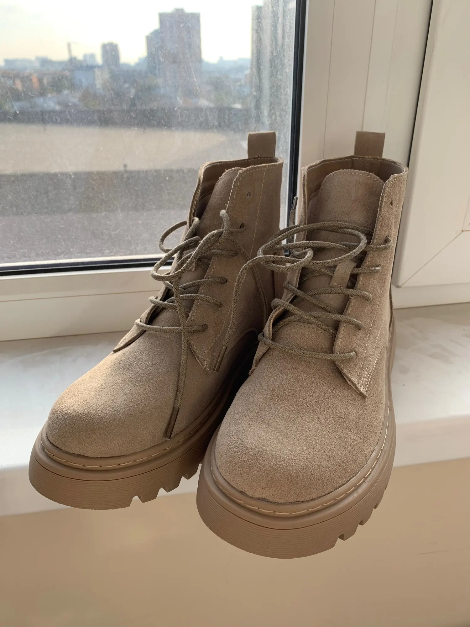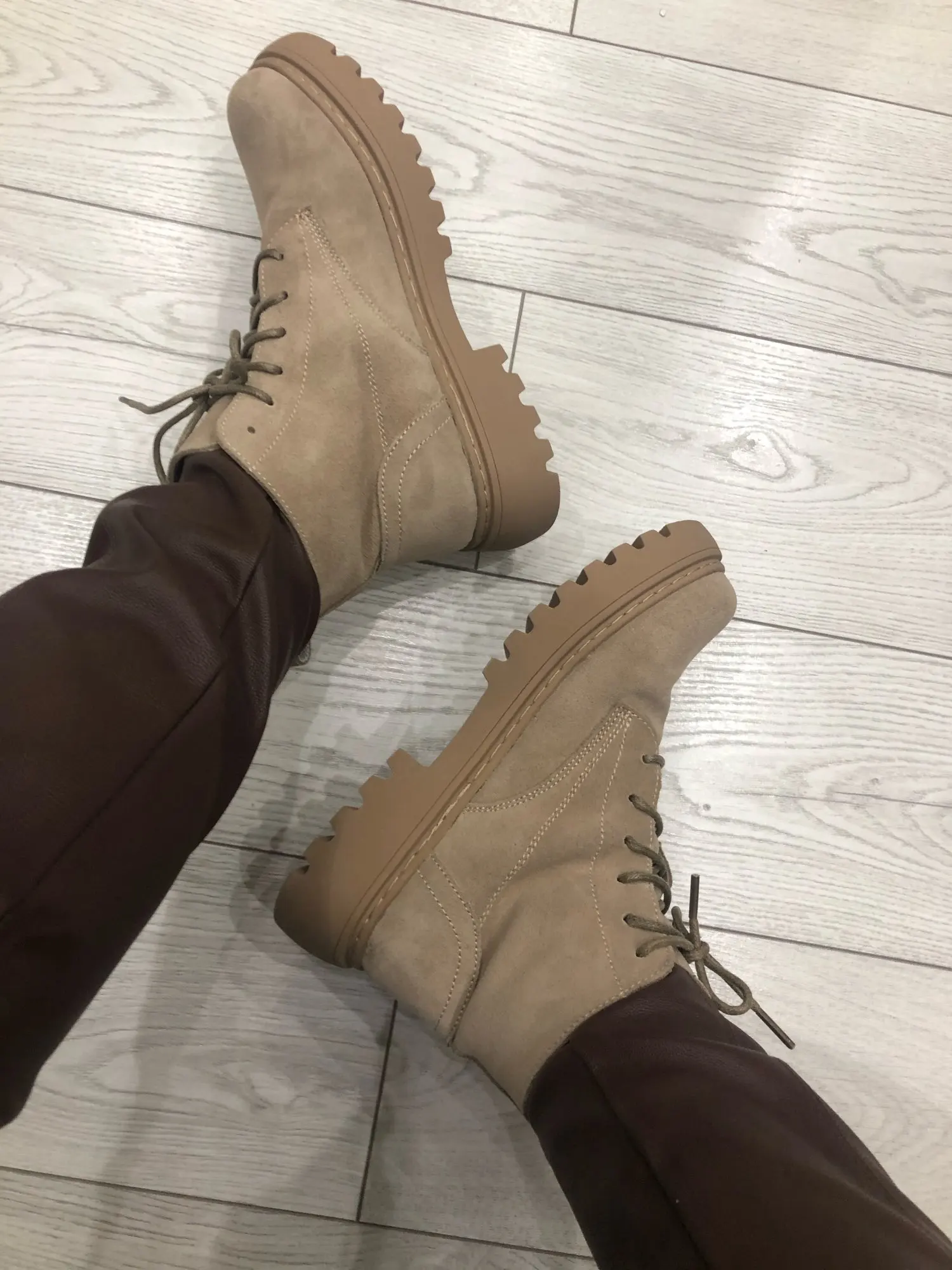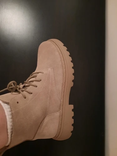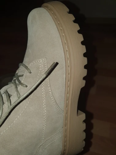 Ботинки отличные. Обычно размер 22,5 см, заказала 23, чуть свободные, как раз можно одеть с тёплым носком, так что по размеру все отлично. Замша очень приятная на ощупь. Подошва не твёрдая, ходить удобно, скользкие или нет, пока не знаю. Стелька мягкая, съемная. Есть небольшие полоски тёмные, возле шнуровки, но это не страшно, на фото показала.В общем очень довольна, особенно со всеми скидками 11.11.