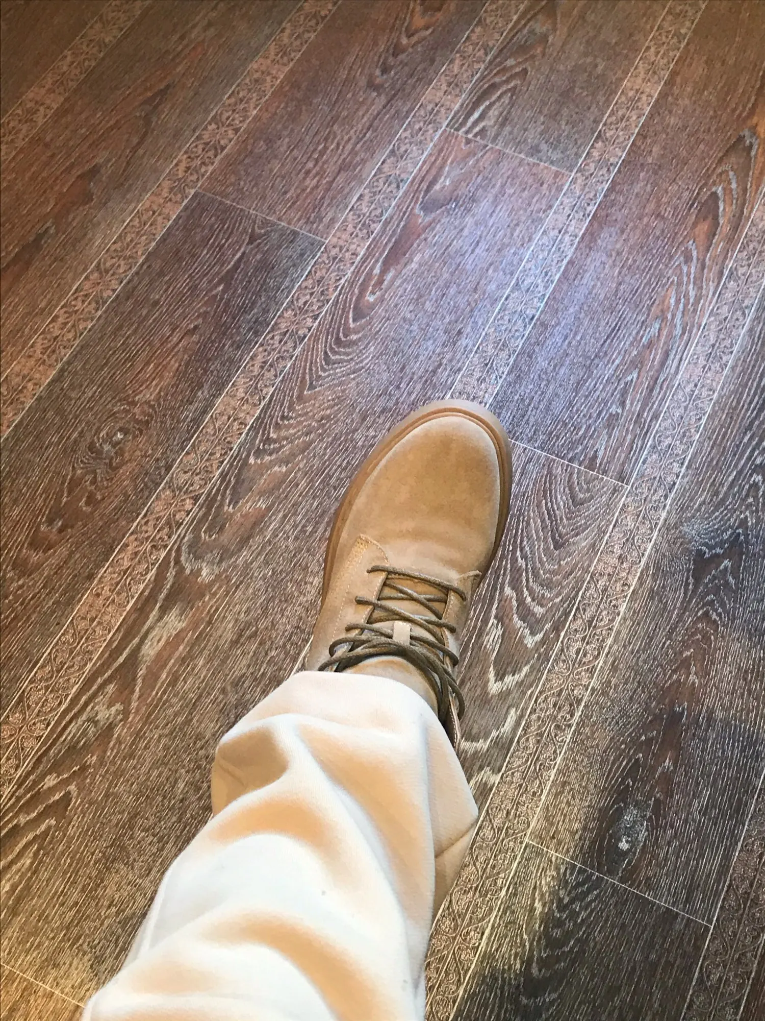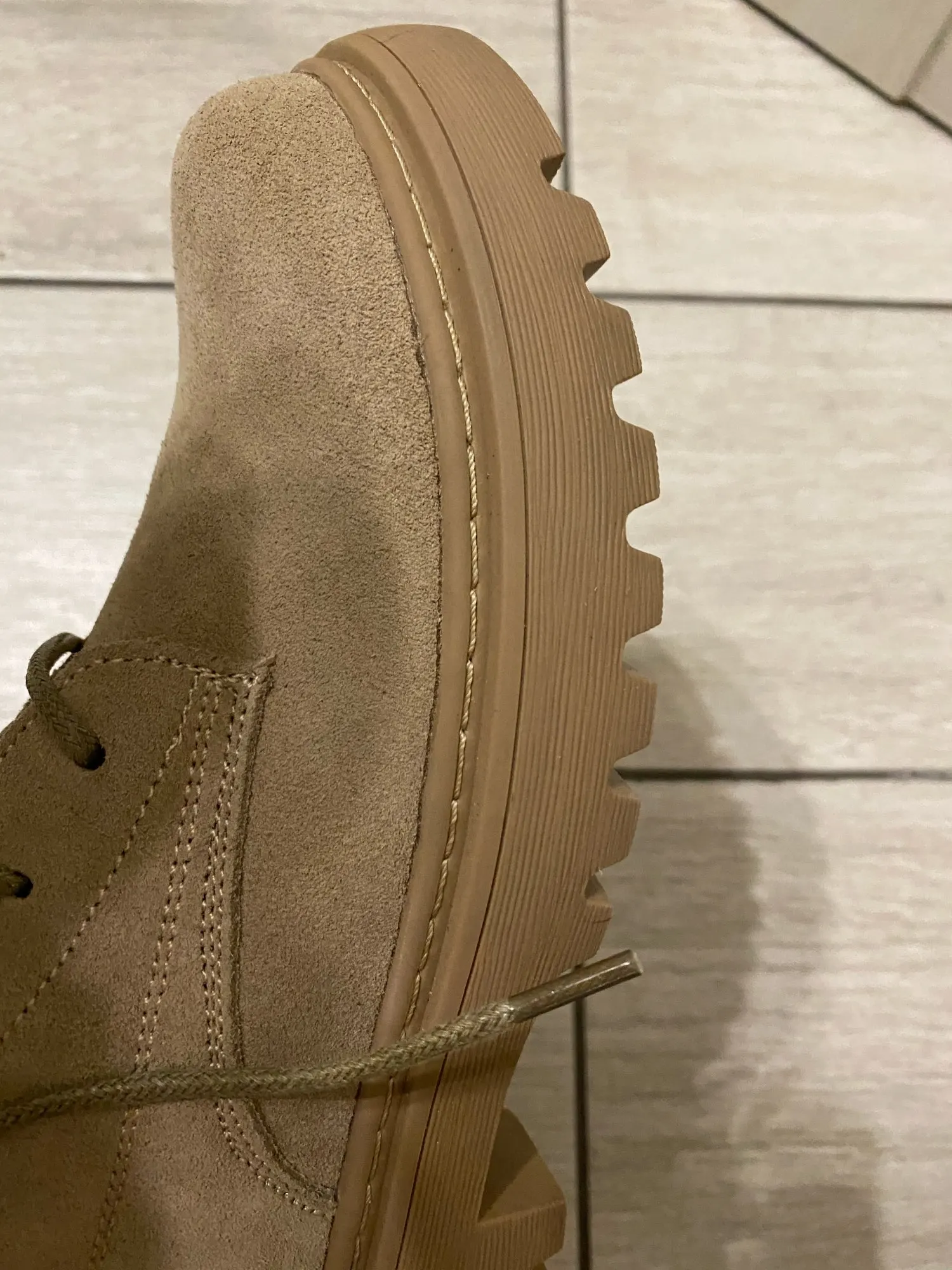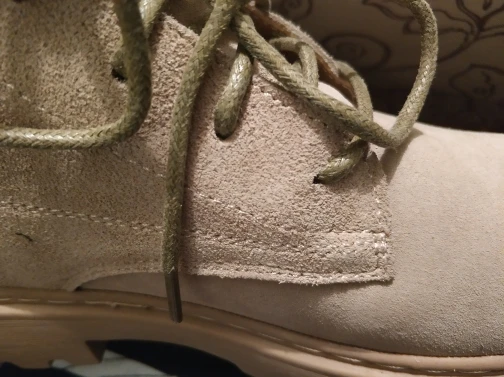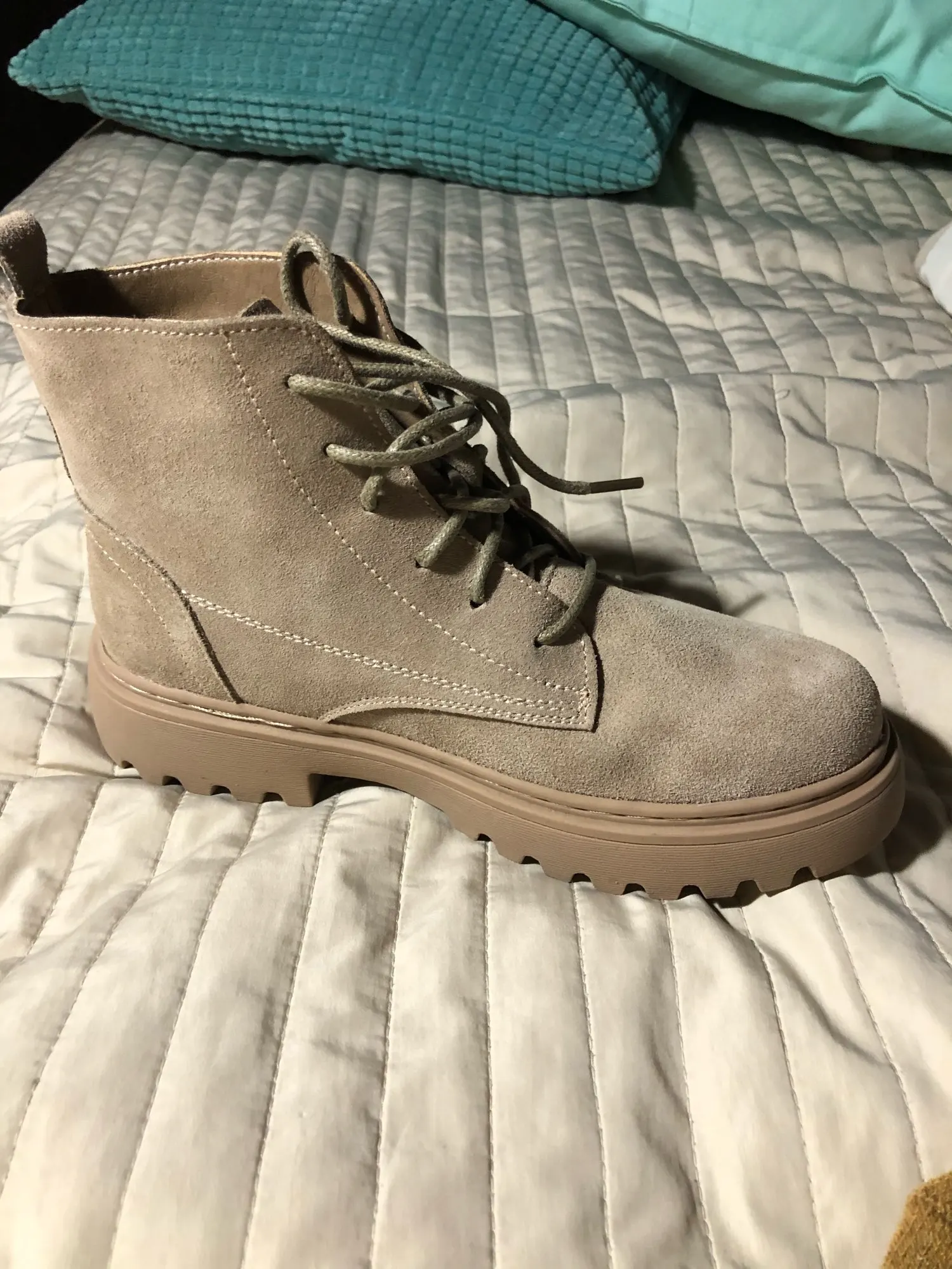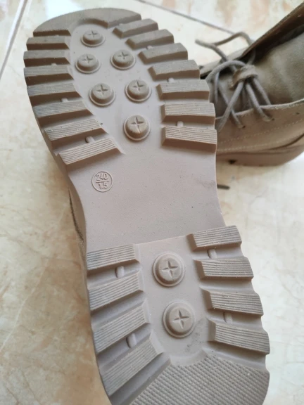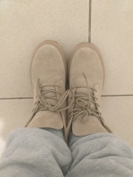 Ботинки отличные. Обычно размер 22,5 см, заказала 23, чуть свободные, как раз можно одеть с тёплым носком, так что по размеру все отлично. Замша очень приятная на ощупь. Подошва не твёрдая, ходить удобно, скользкие или нет, пока не знаю. Стелька мягкая, съемная. Есть небольшие полоски тёмные, возле шнуровки, но это не страшно, на фото показала.В общем очень довольна, особенно со всеми скидками 11.11.